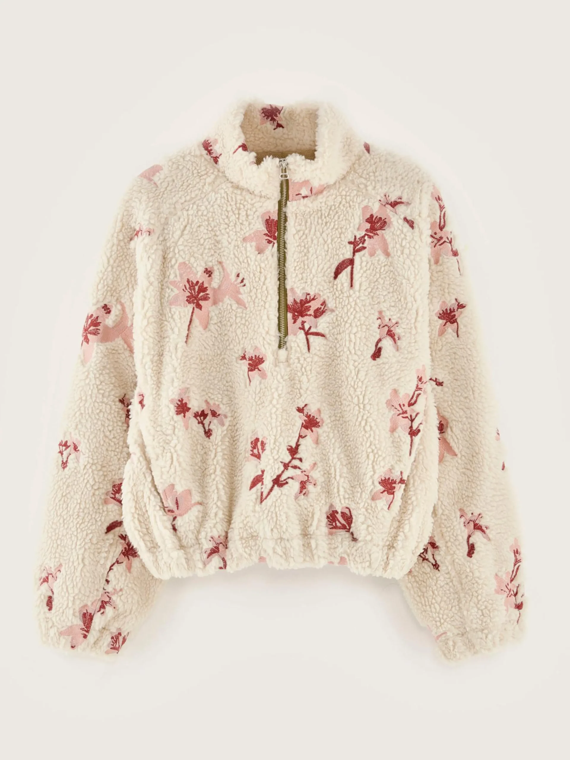 Sweatshirt om over het hoofd te trekken, van ecru teddystof, volledig met bloemenborduursel.