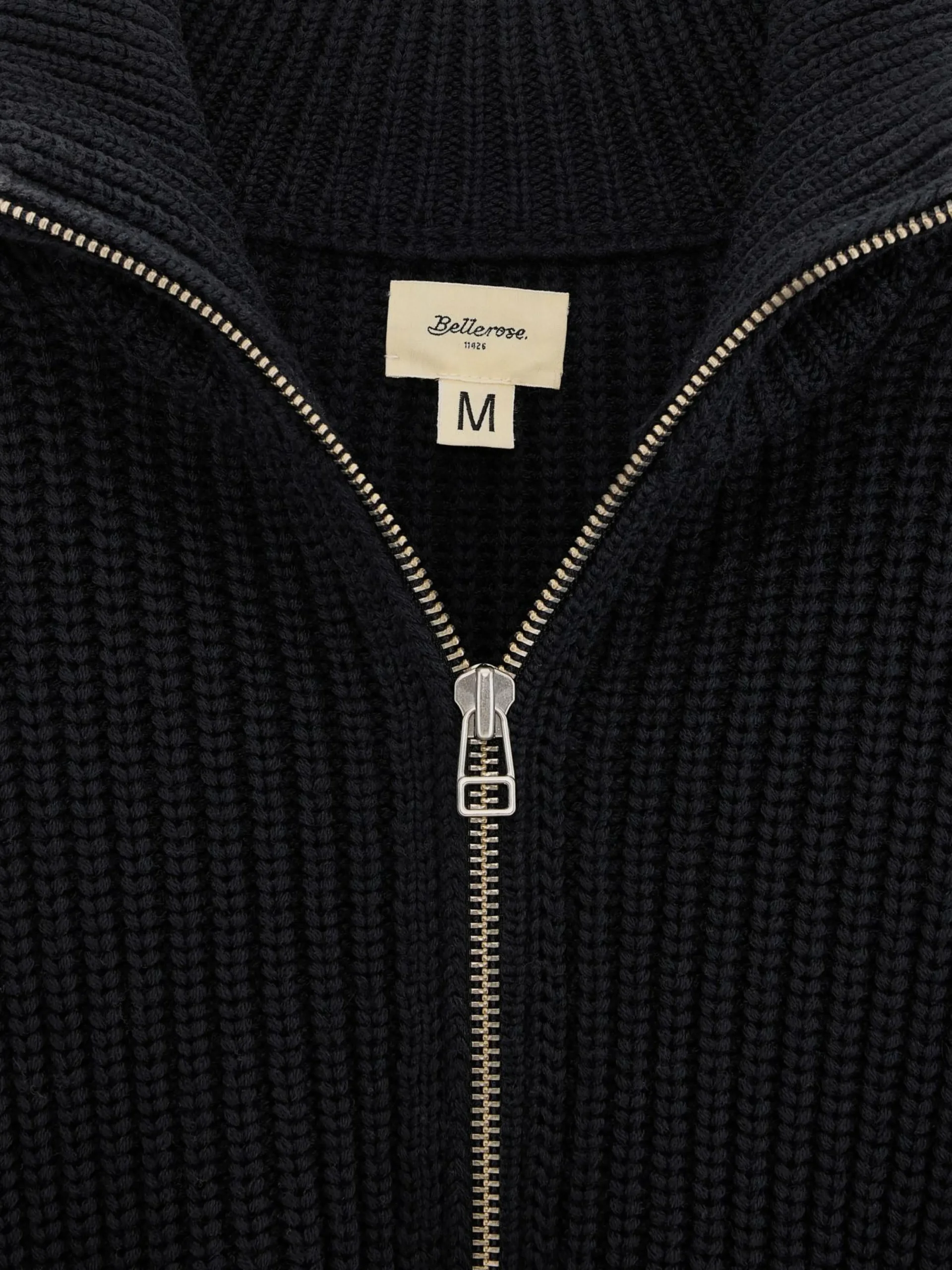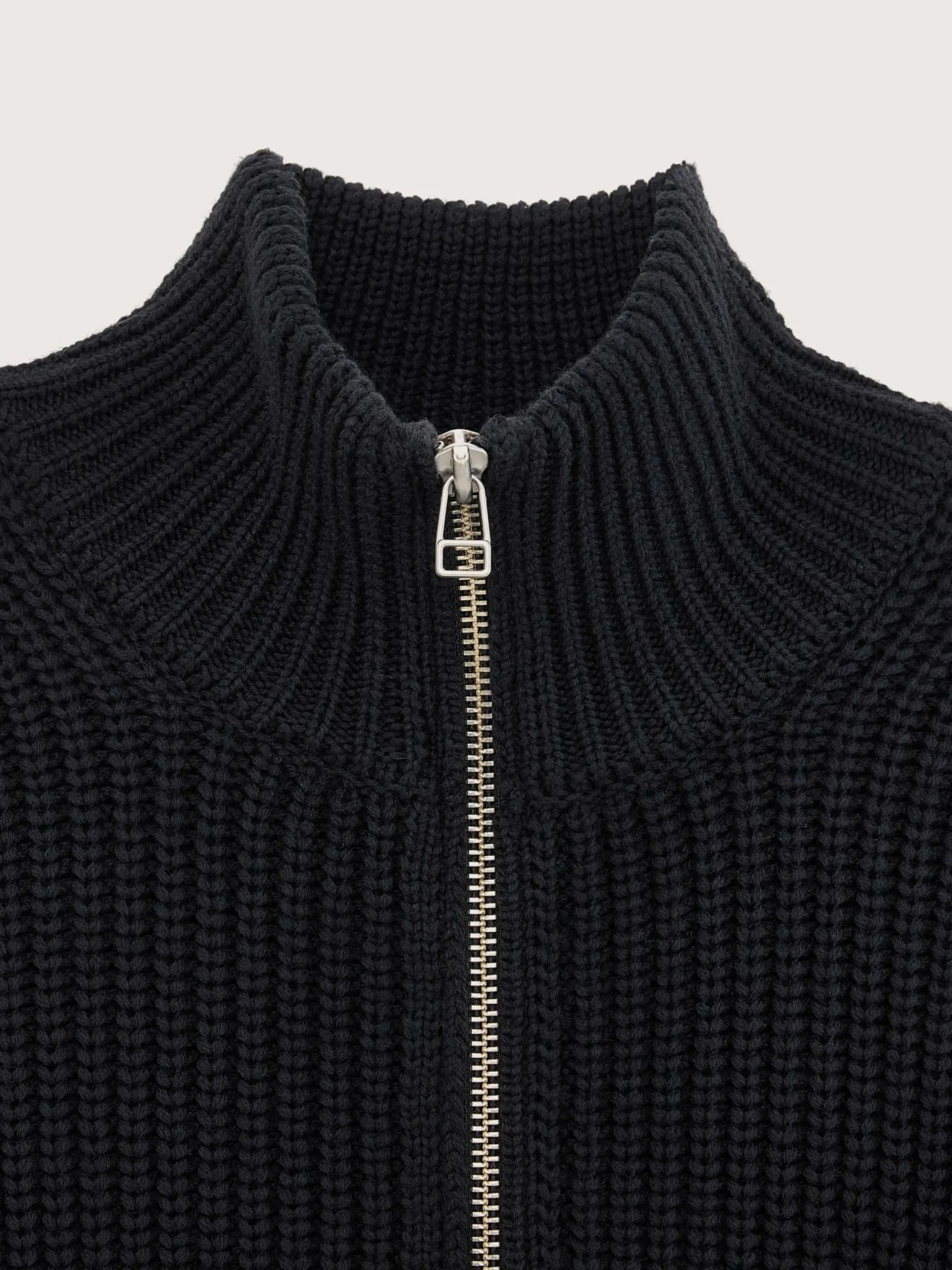 Comfortabele cardigan met ritssluiting vooraan, van marineblauwe, grove wol.