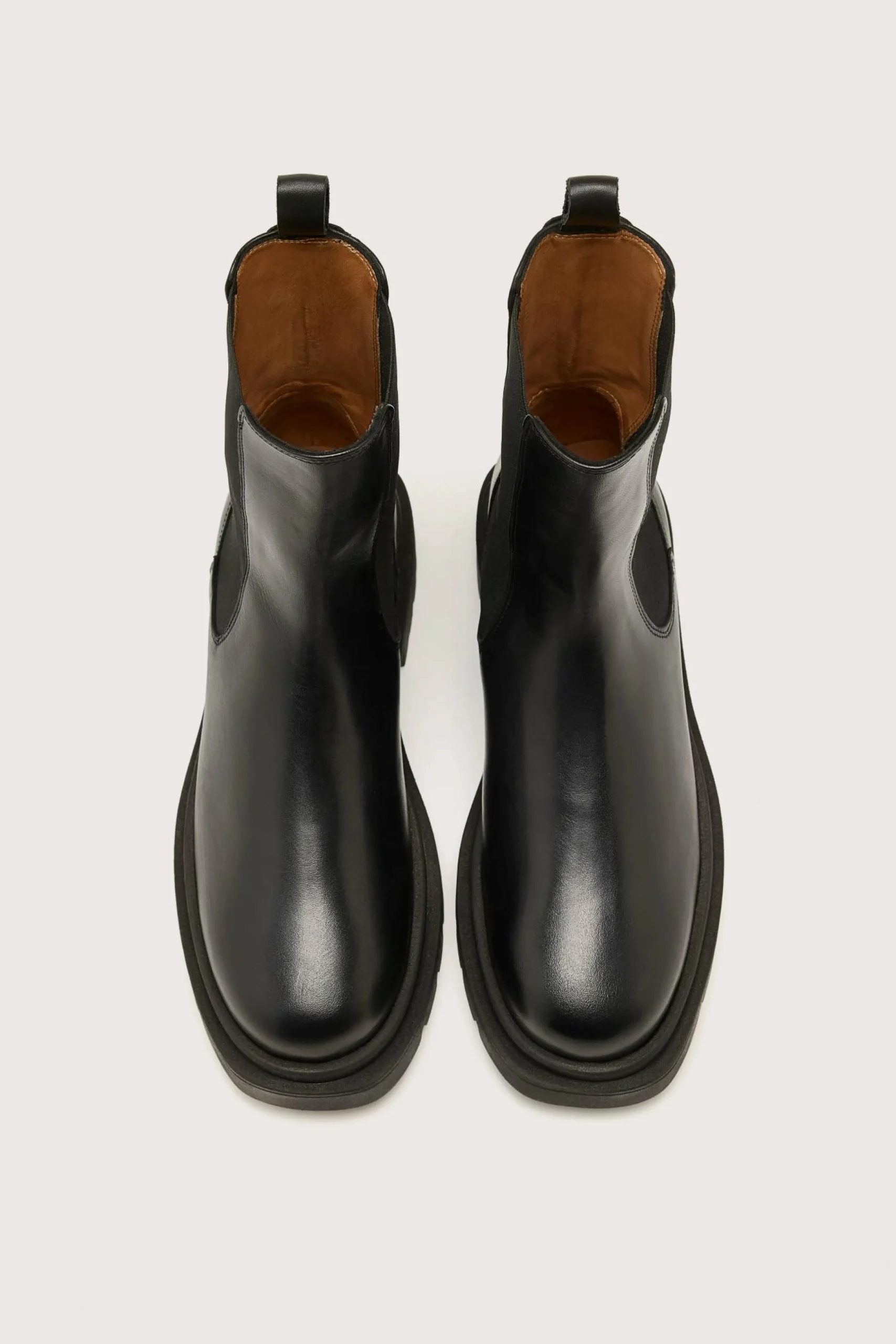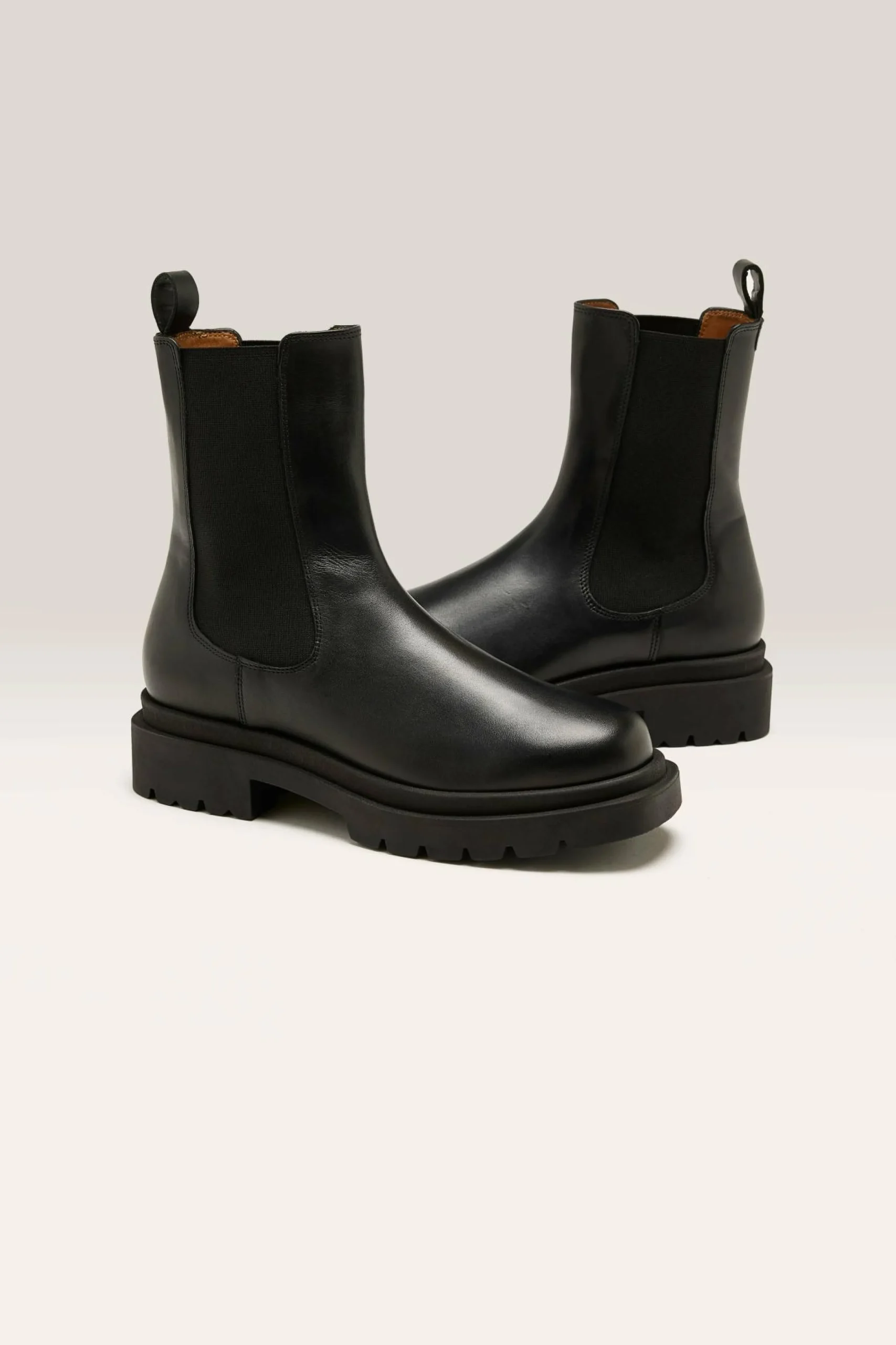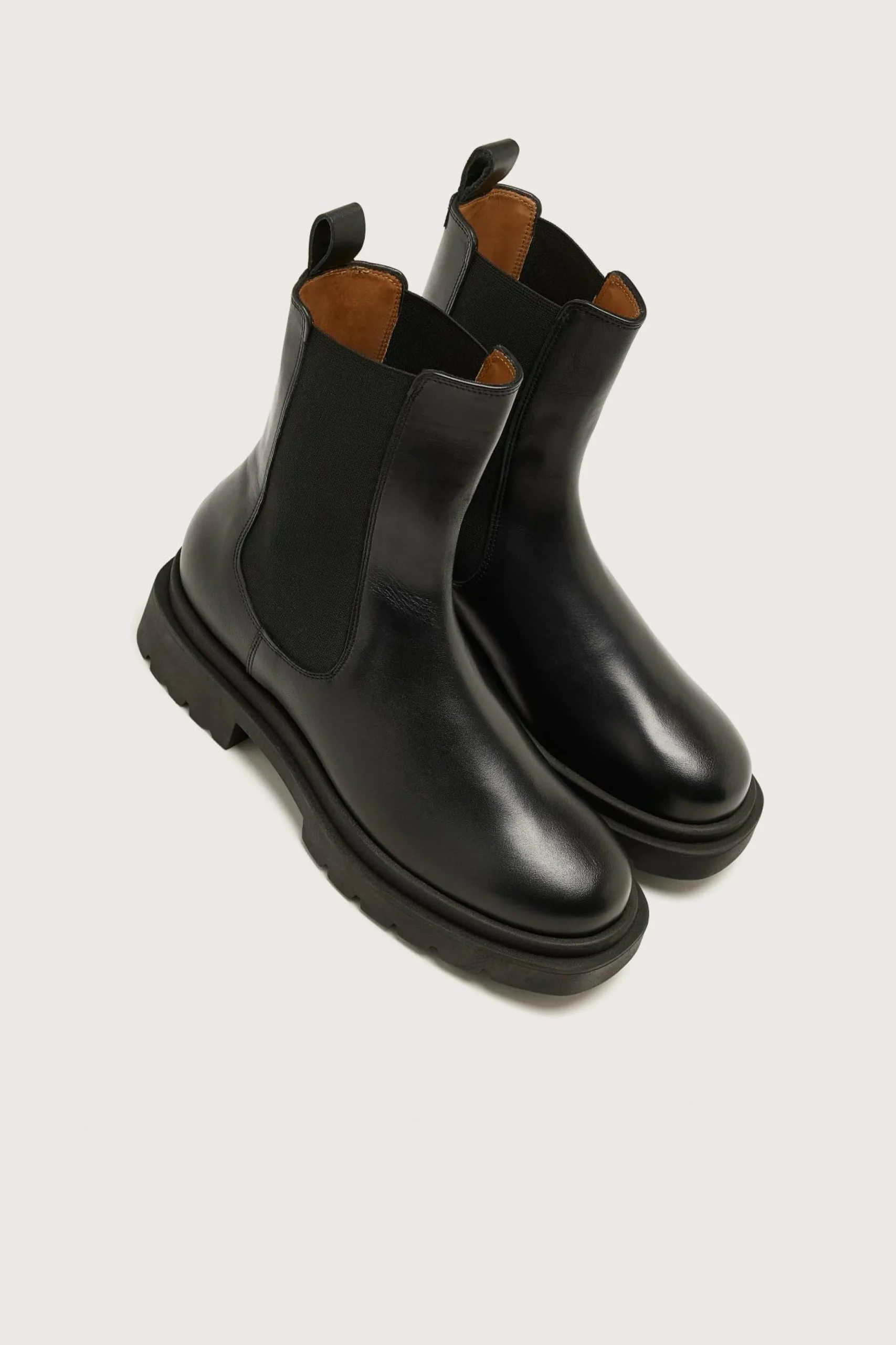The Anthology Paris Senia boots in black Seda leather are classic Chelsea boots with modern, thick rubber soles and an elevated heel.
