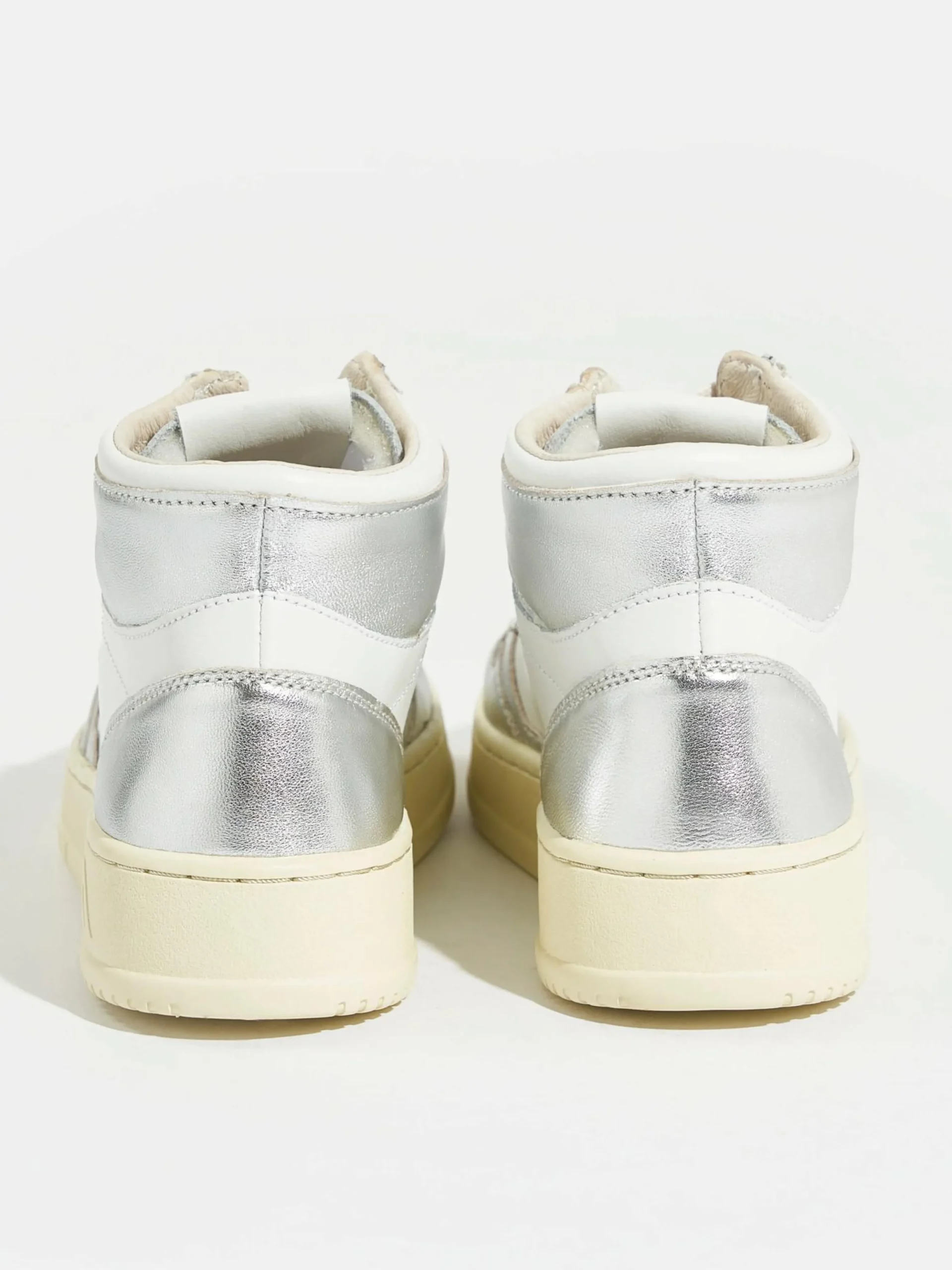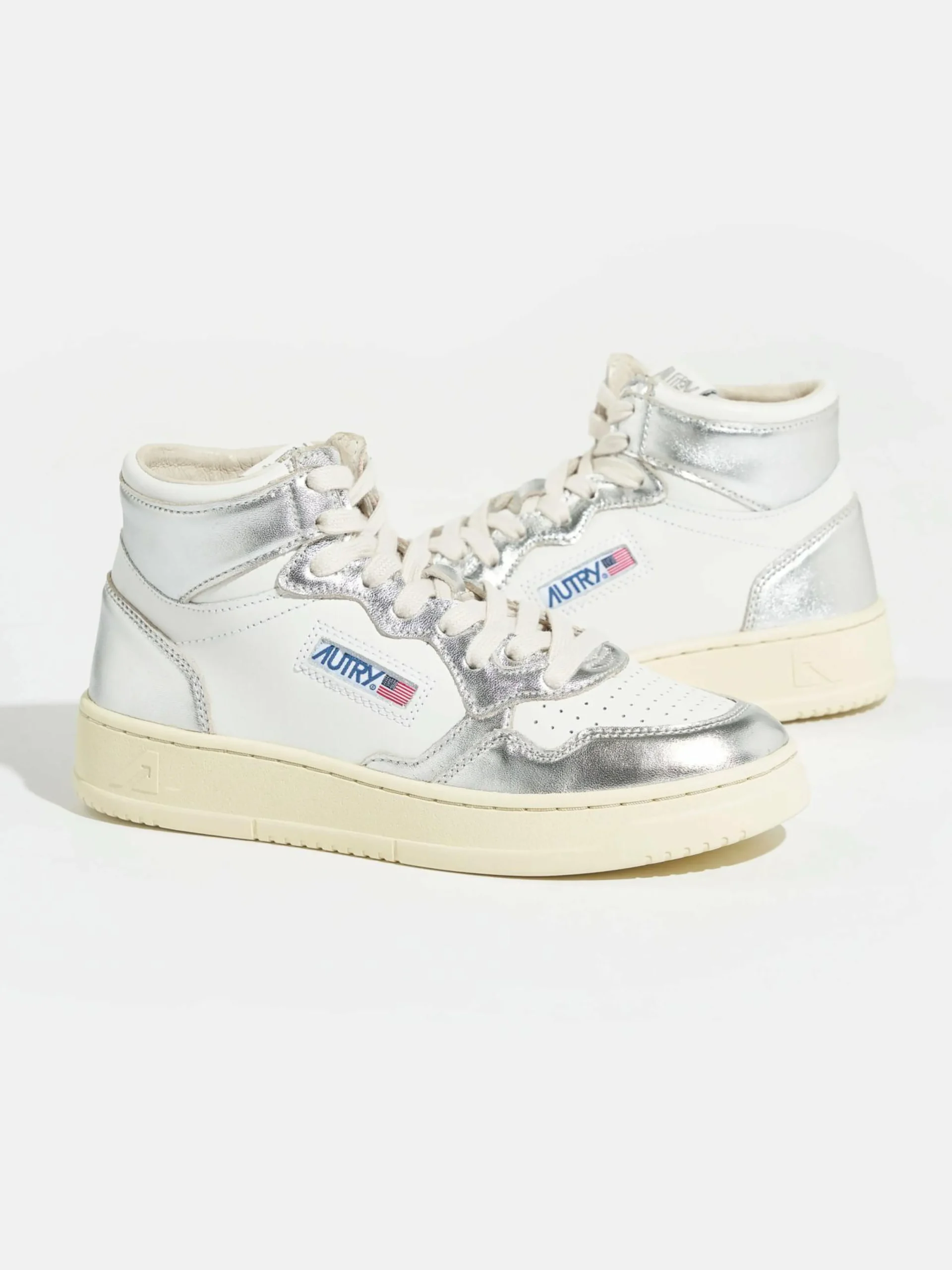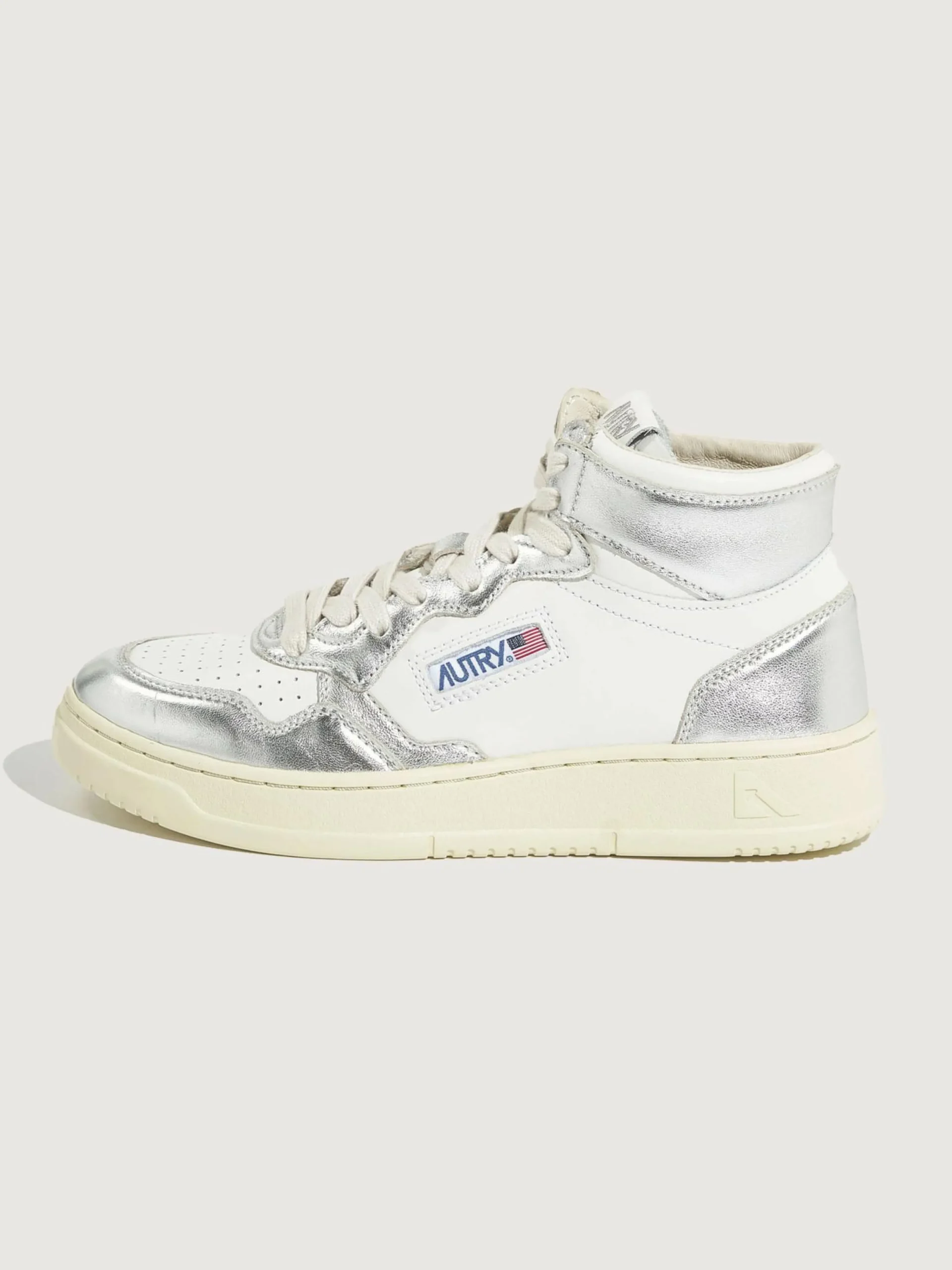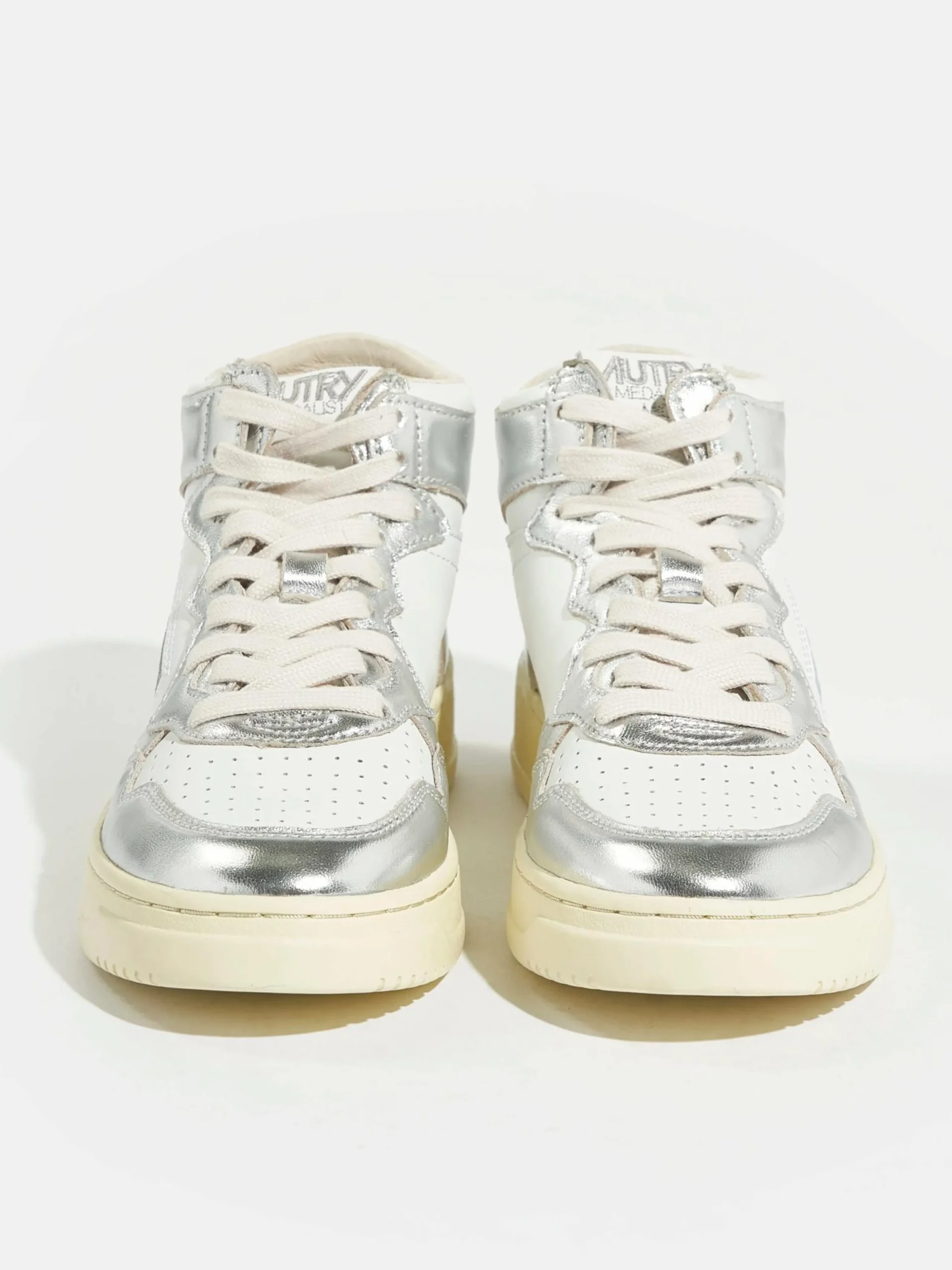 De Autry Medalist Mid bicolor mid-top sneakers hebben een bovenwerk van zilver en wit gelamineerd leder met een zool van natuurlijk rubber.