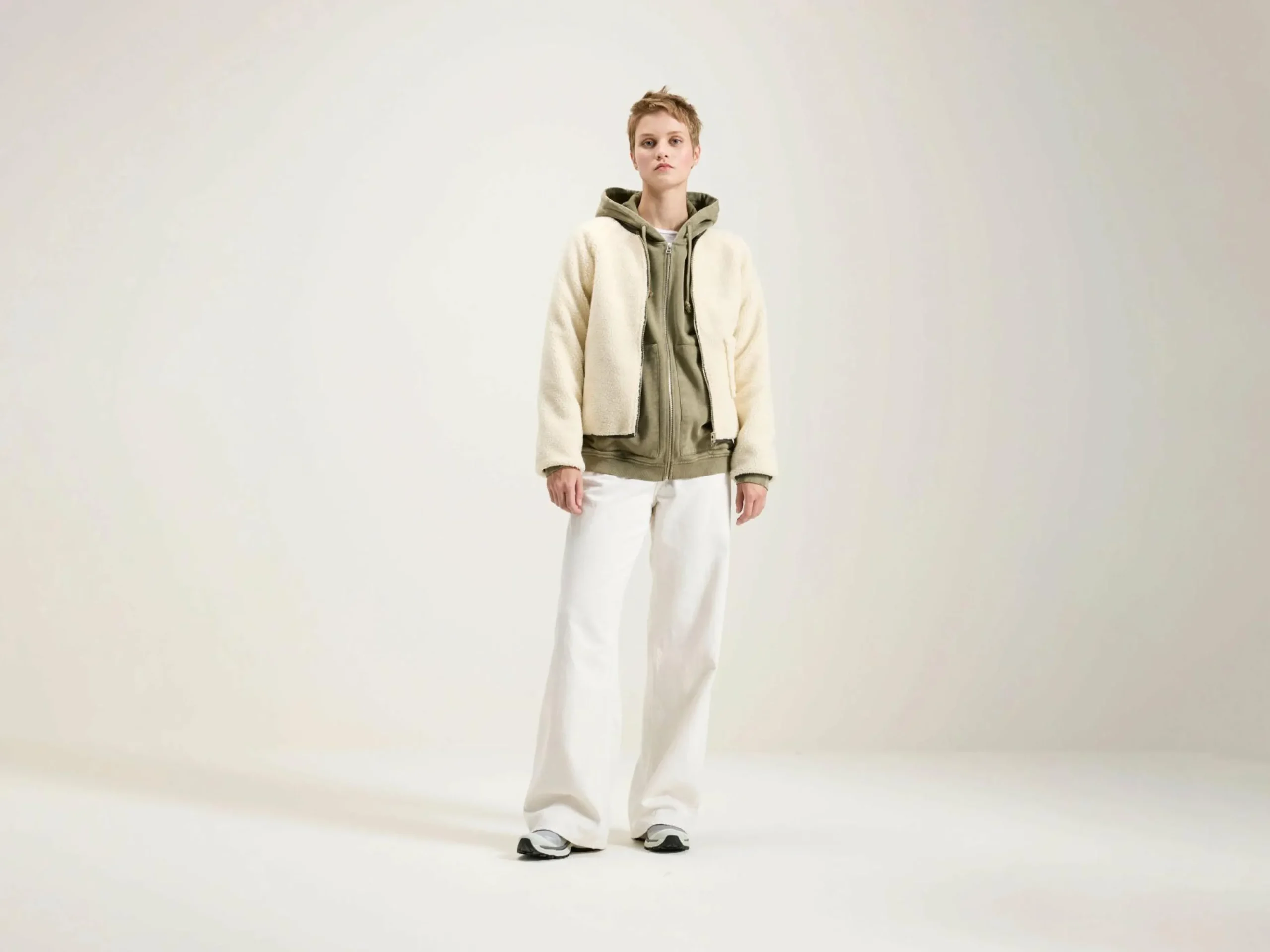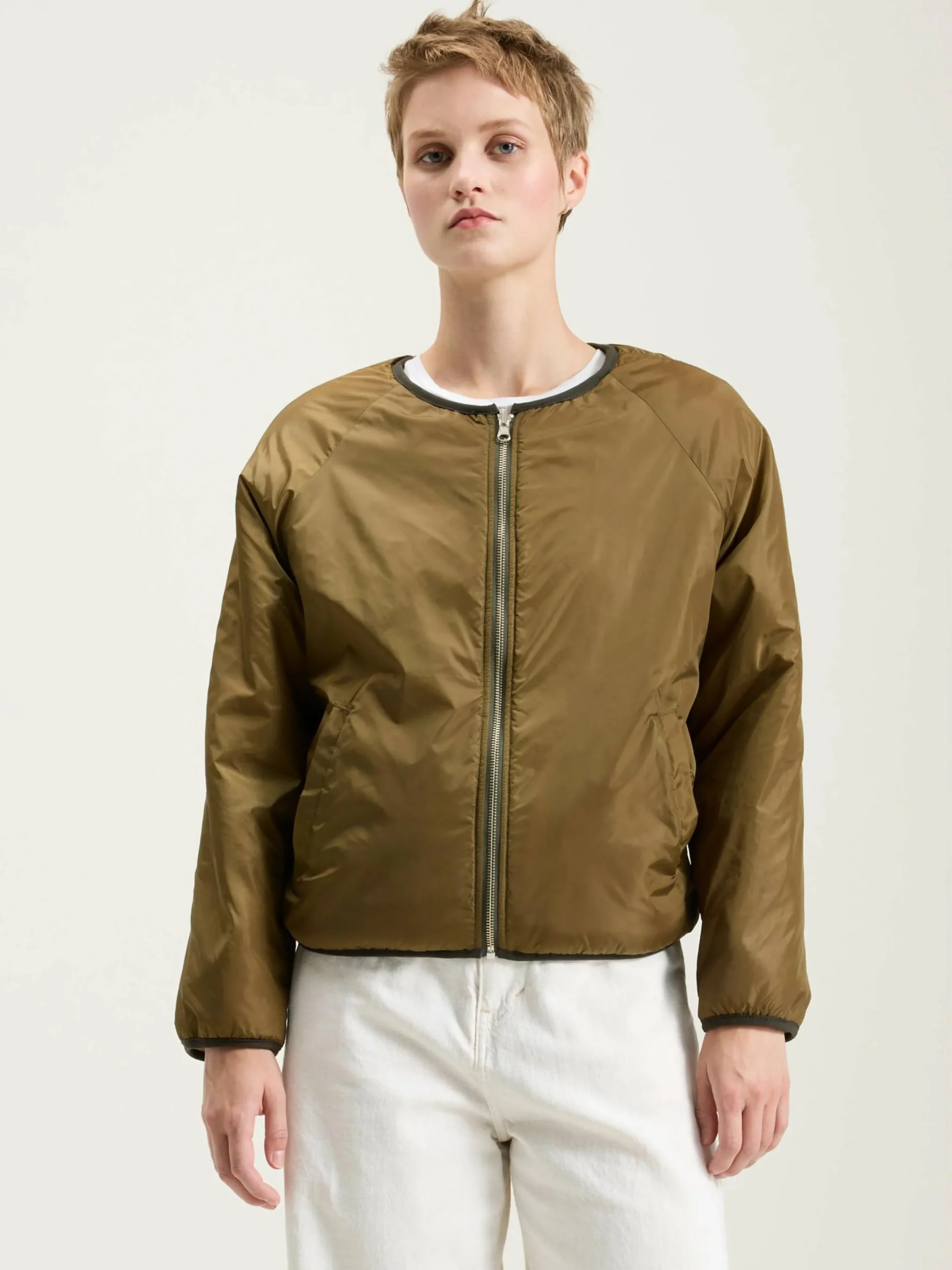 Omkeerbare jas met rits aan de voorkant en steekzakken. Eén kant in kaki satijn en de andere in ecru teddy.