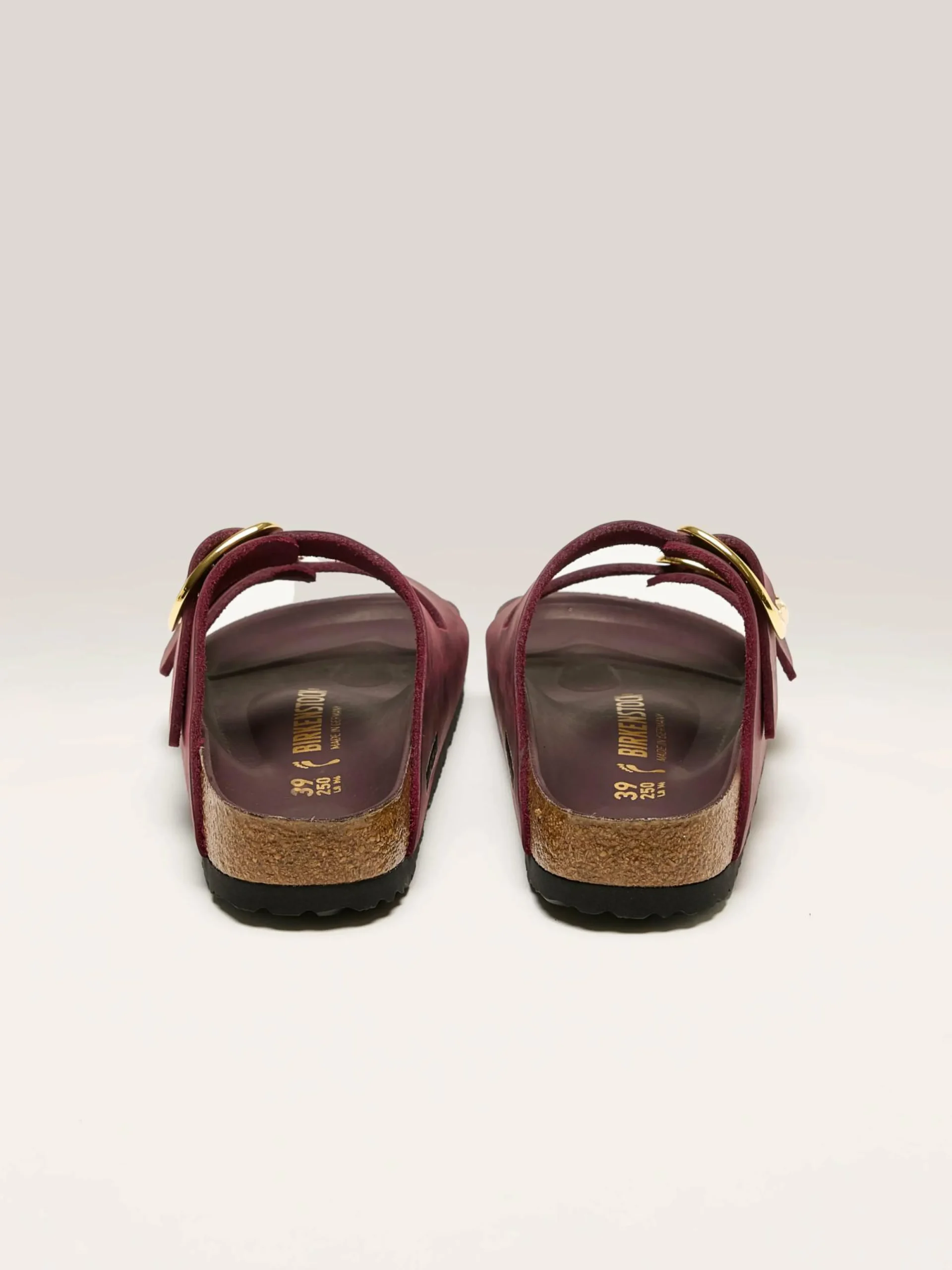 De Birkenstock Arizona Big Buckle sandalen hebben twee grote metalen gespen, een zachte lederen voering en een dik bovenwerk van geolied nubuckleder met onafgewerkte randen.