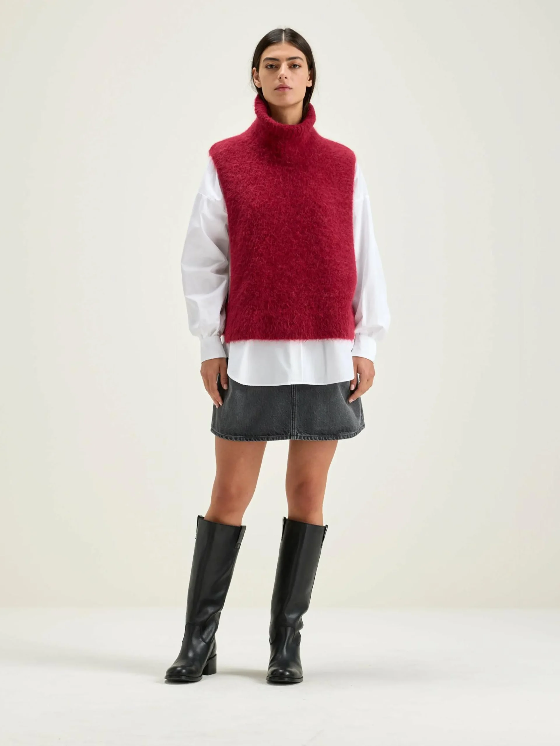 Gebreide, wijnrode bodywarmer met een ribgebreide turtle neck.