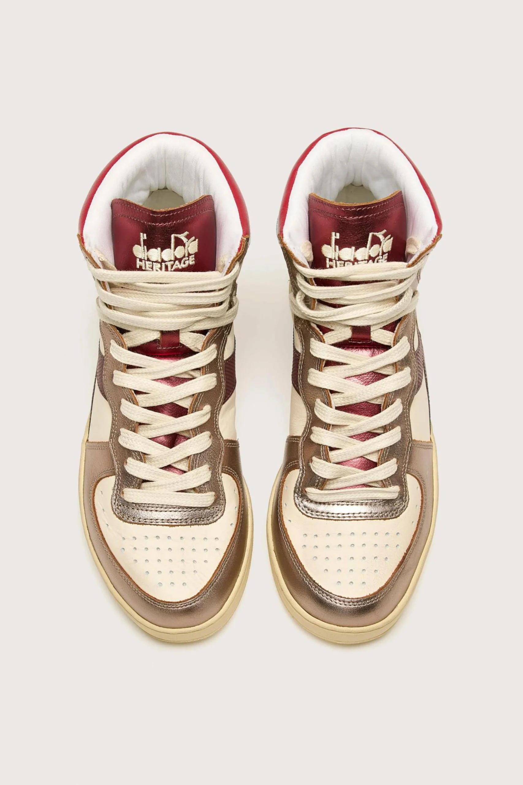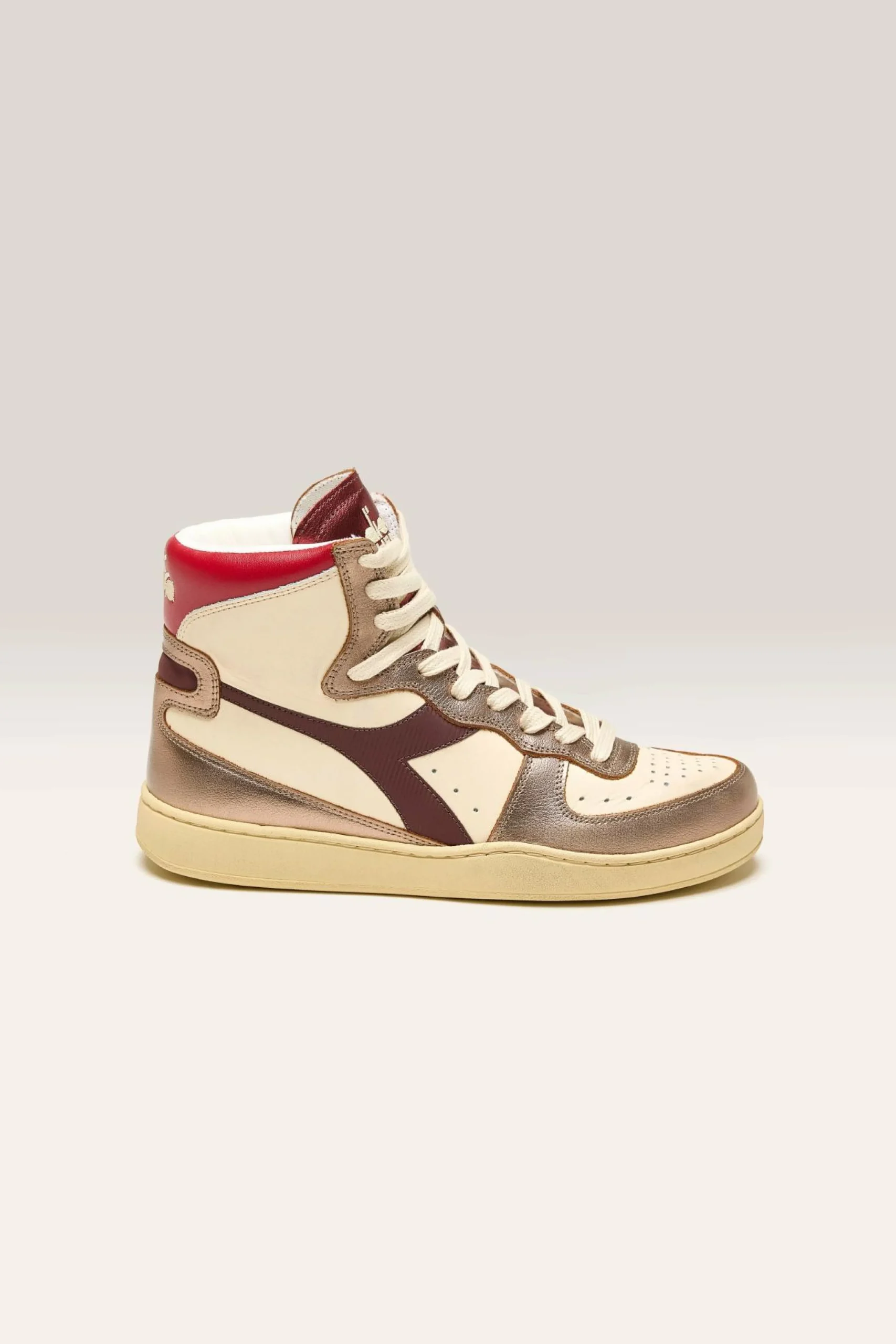 The Diadora Mi Basket Metal Mix Used heritage sneakers feature premium foiled full-grain leather with a waxed stonewash treatment.