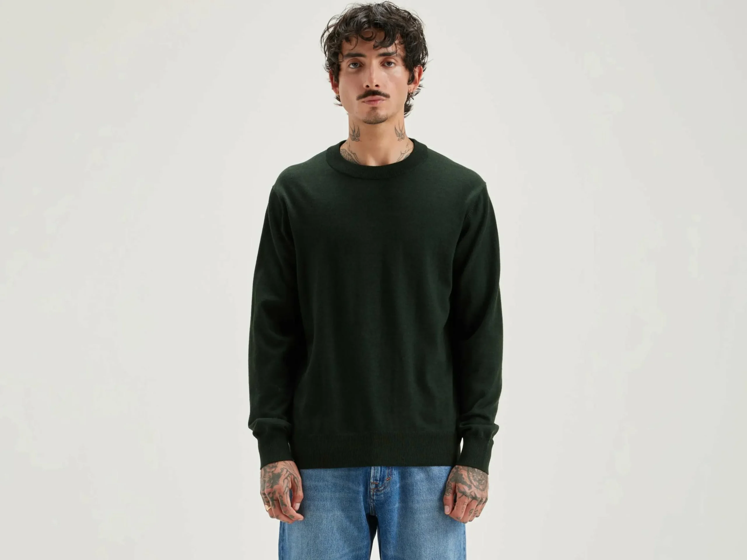 Klassieke, bosgroene sweater met ronde hals, van superfijne merinowol.