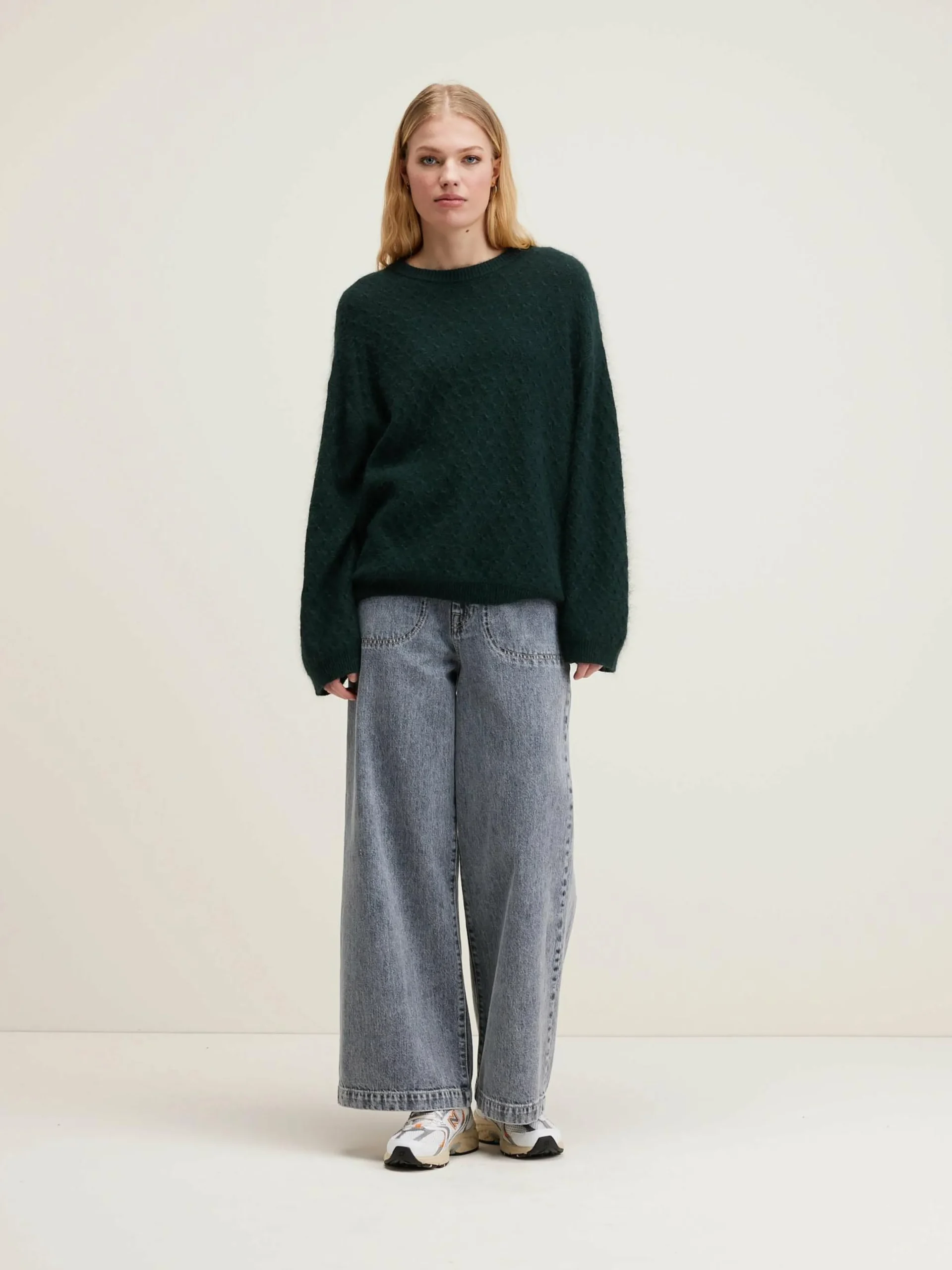 Flesgroene, relaxede trui met ronde hals, van angoramix.