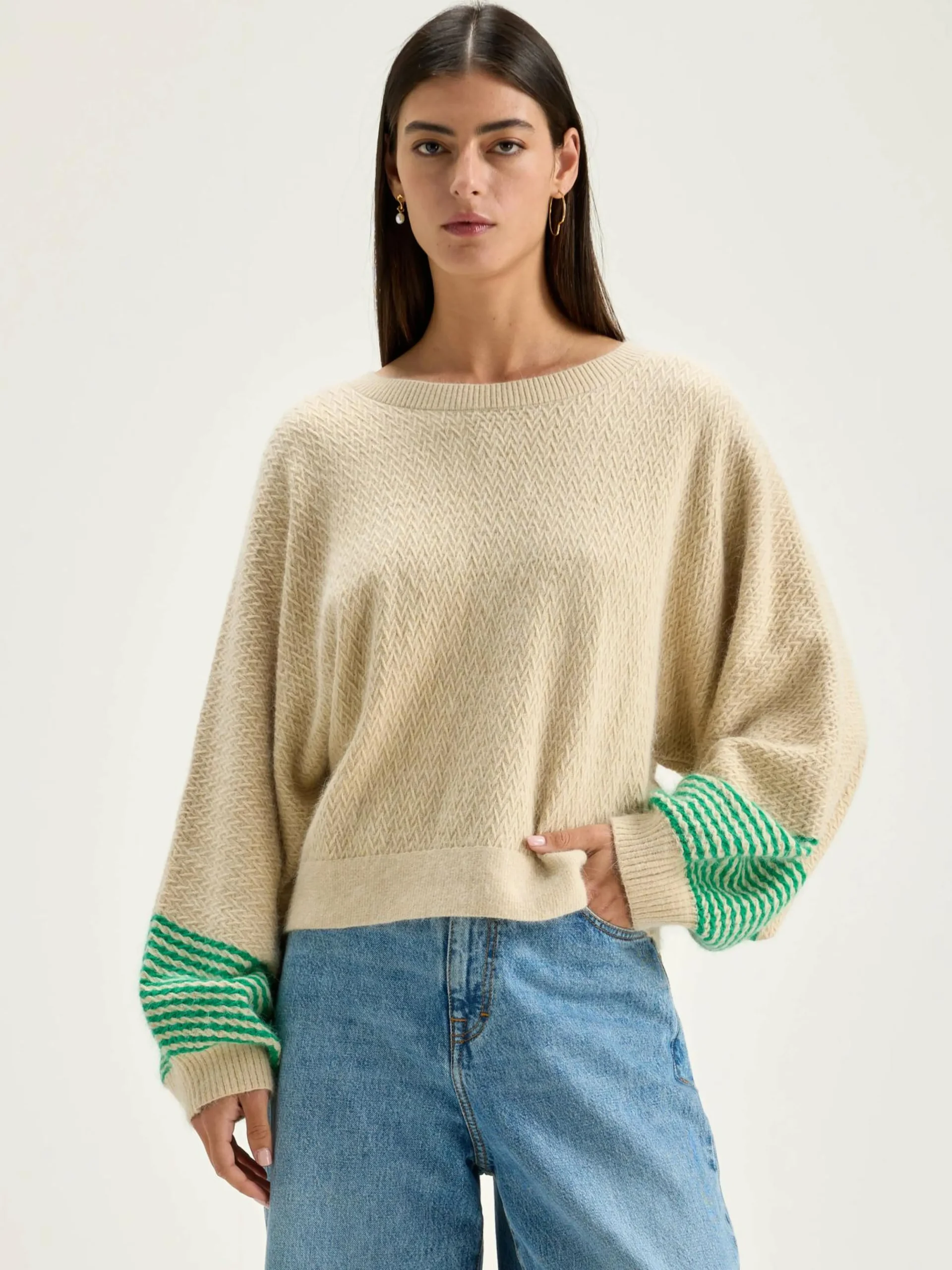 Averecht gebreide ecru trui met minizigzagbreisel en groene strepen op de mouwen.