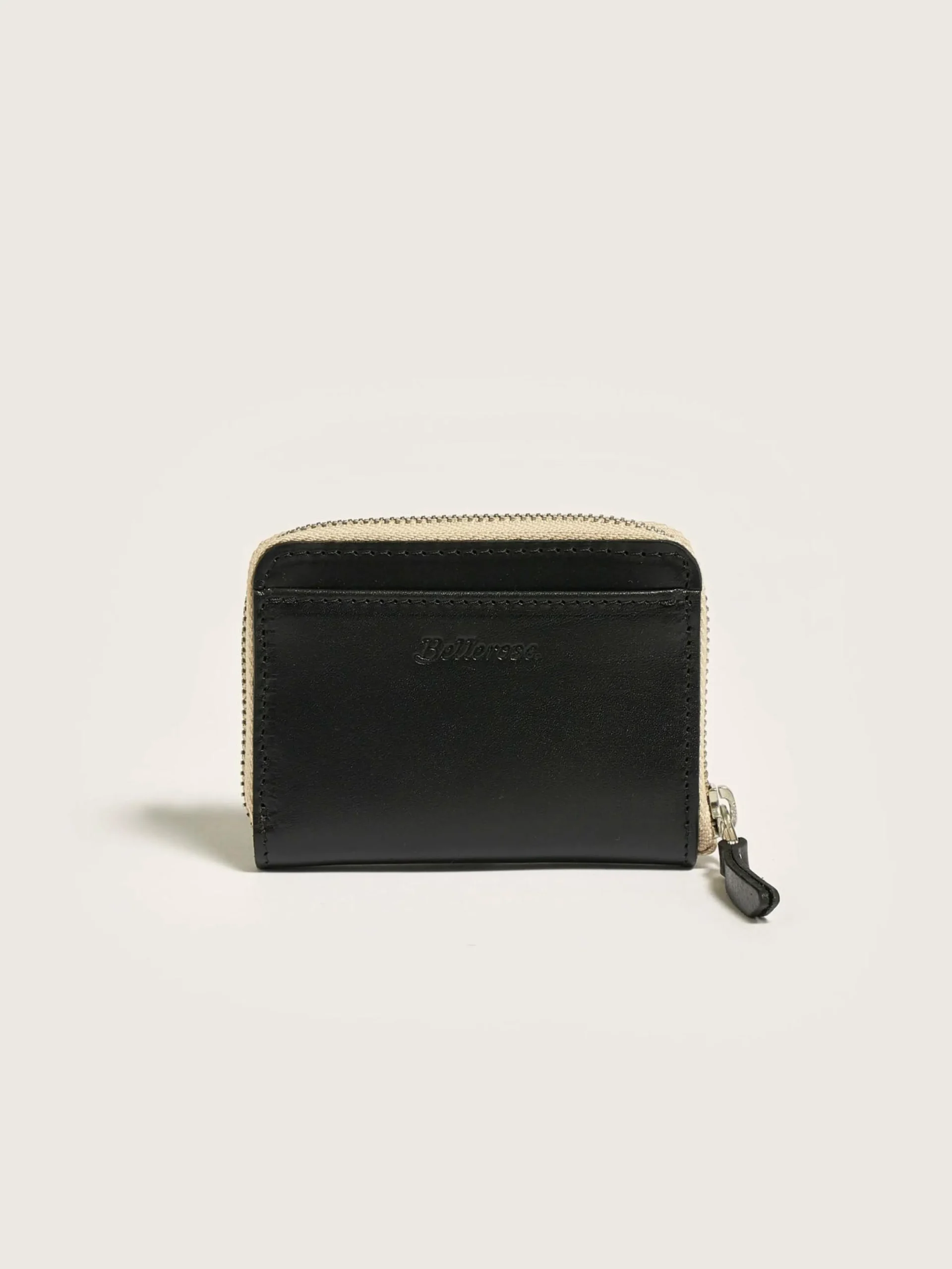 Rechthoekige portemonnee met rits van glad zwart leer met meerdere kaartsleuven.