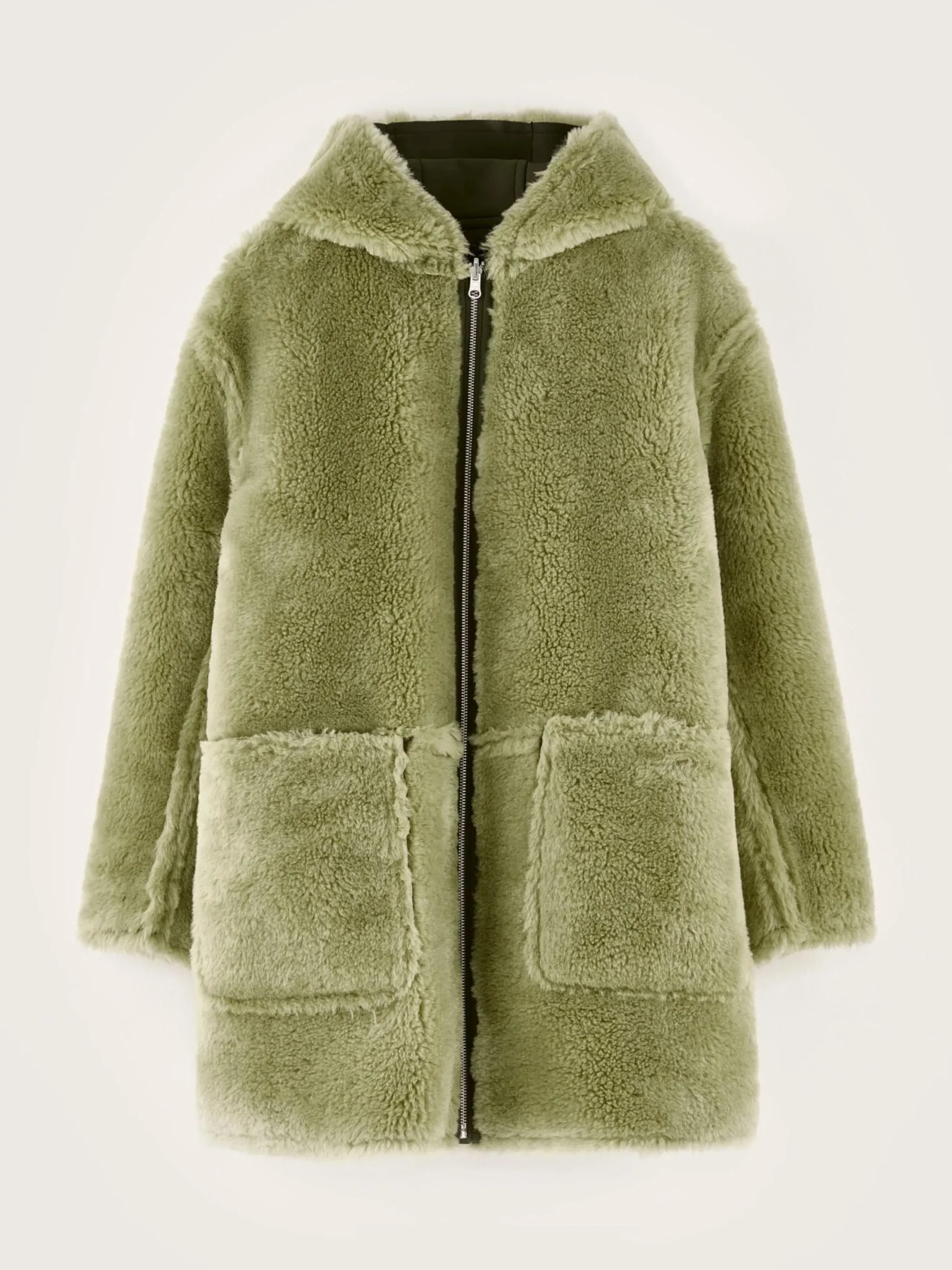 Omkeerbare mantel met capuchon, met ritssluiting en klepzakken vooraan, van mosgroen imitatie-shearlingleer.