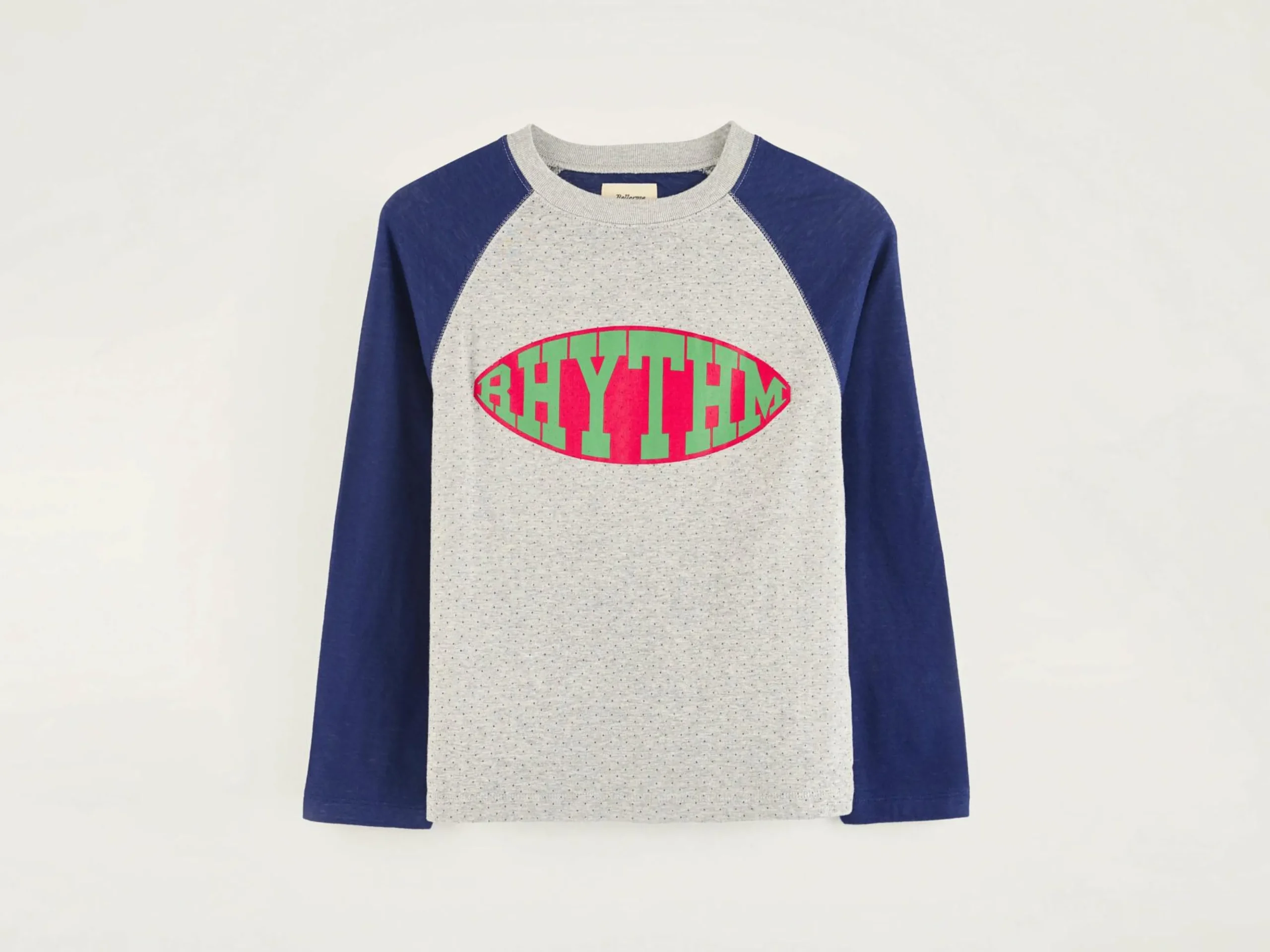 Recht T-shirt met raglanmouwen van tweezijdig heidegrijs kartoenjersey, met “Rhythm” print op de voorkant.