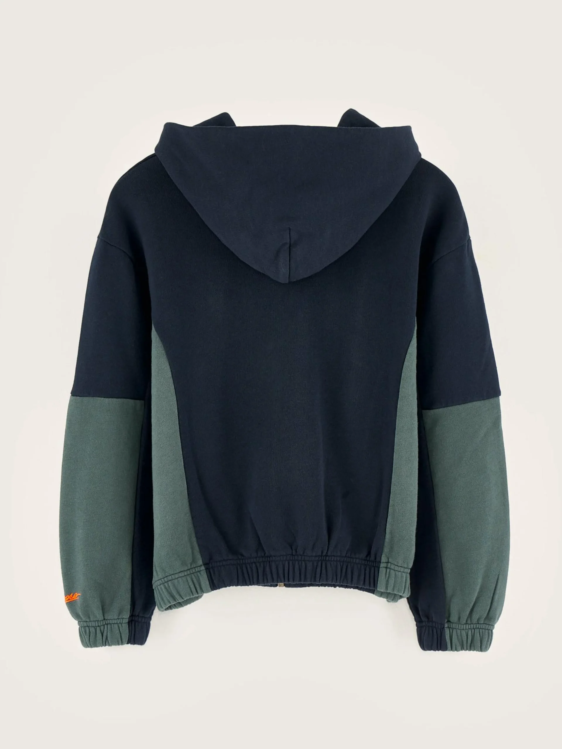 Comfortabele hoodie in colorblockstijl, met ritssluiting vooraan, van donkerblauwe en mosgroene jerseyfleece