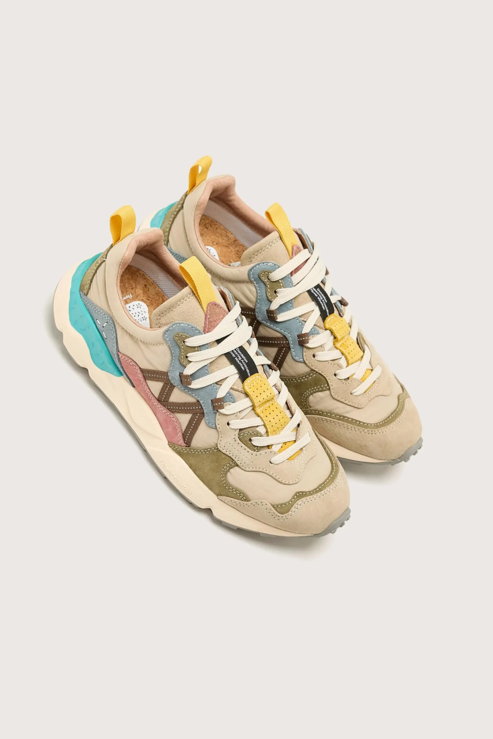 The Flower Mountain LENZAN outdoor sneakers feature a suede upper with technical fabric, removable insoles, and a lightweight rubber sole.