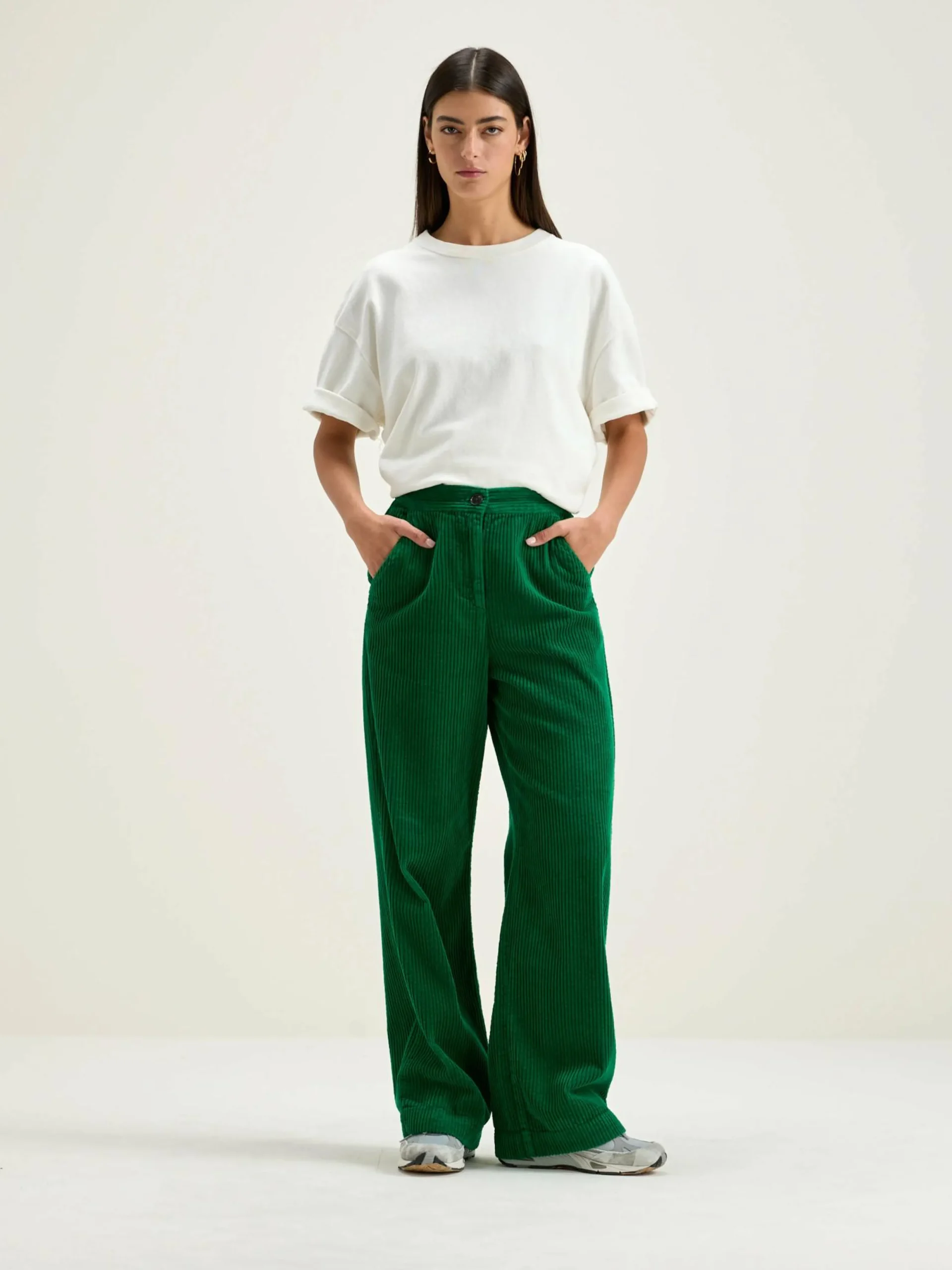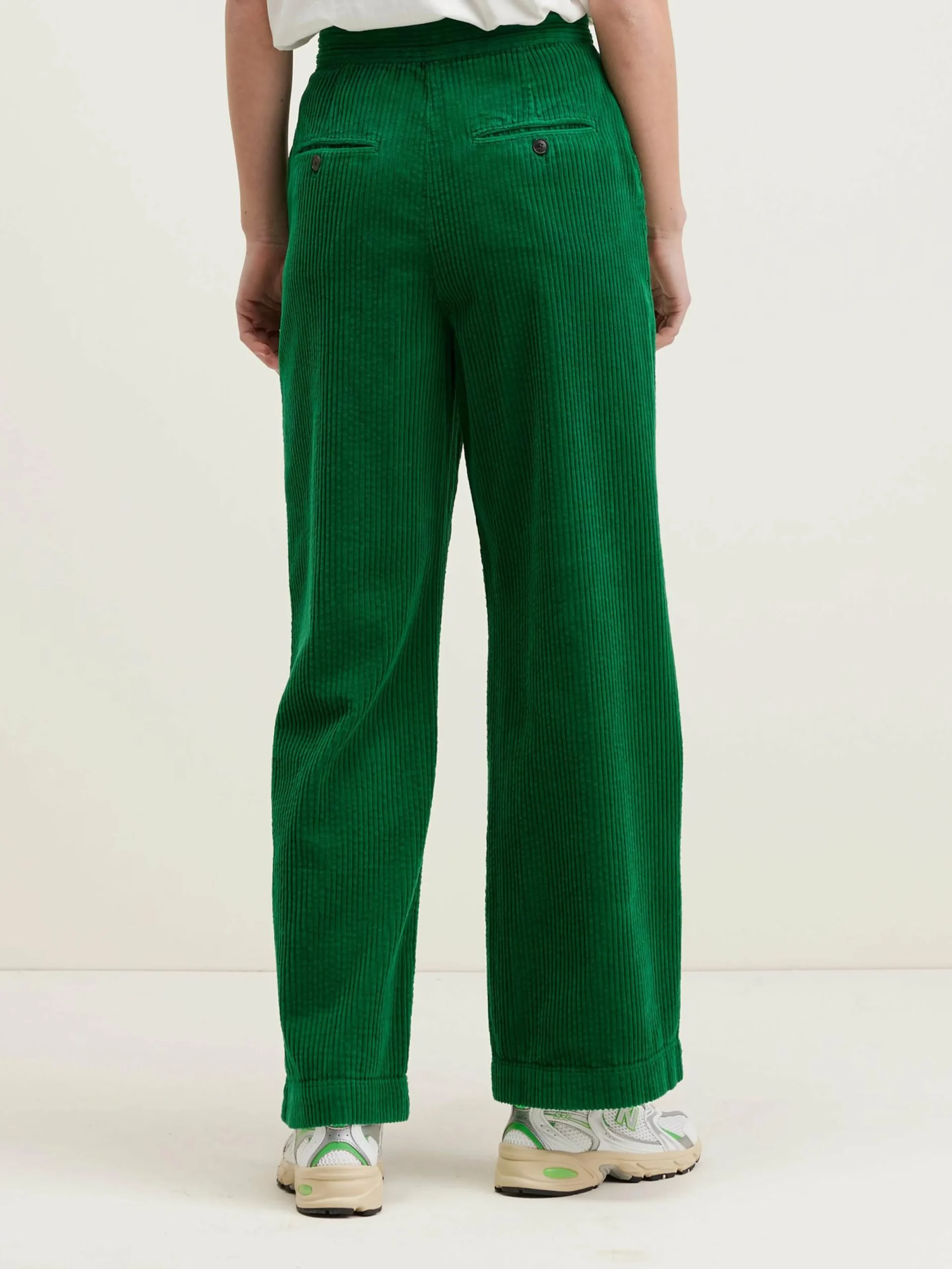 Rechte, grasgroene high-waist broek met wijde pijpen.