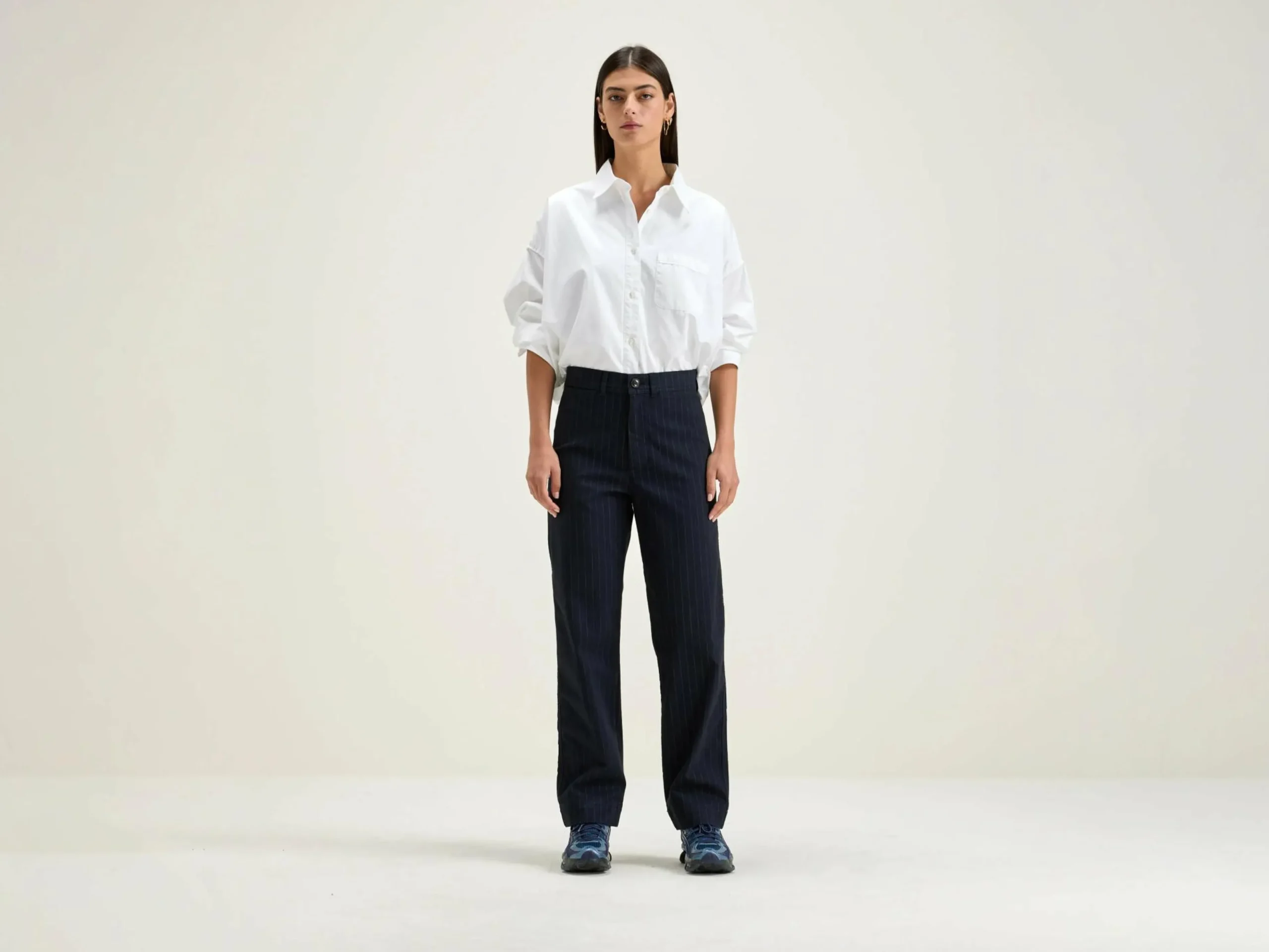 Aansluitende high-waist broek met rechte pijpen en subtiele krijtstreepjes in zwart.