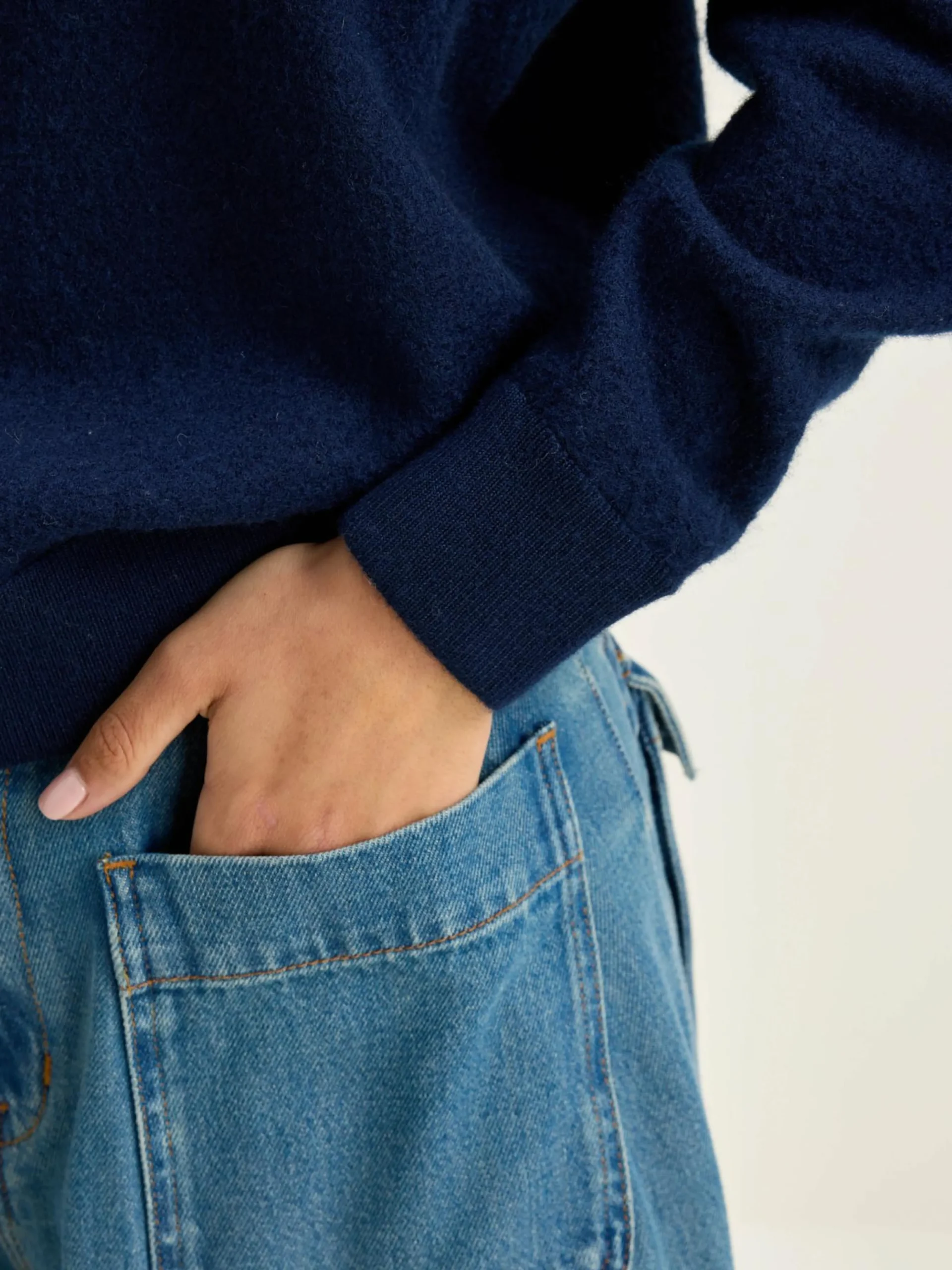 Inktblauwe, oversizede trui met parelmoerknopen op één schouder.