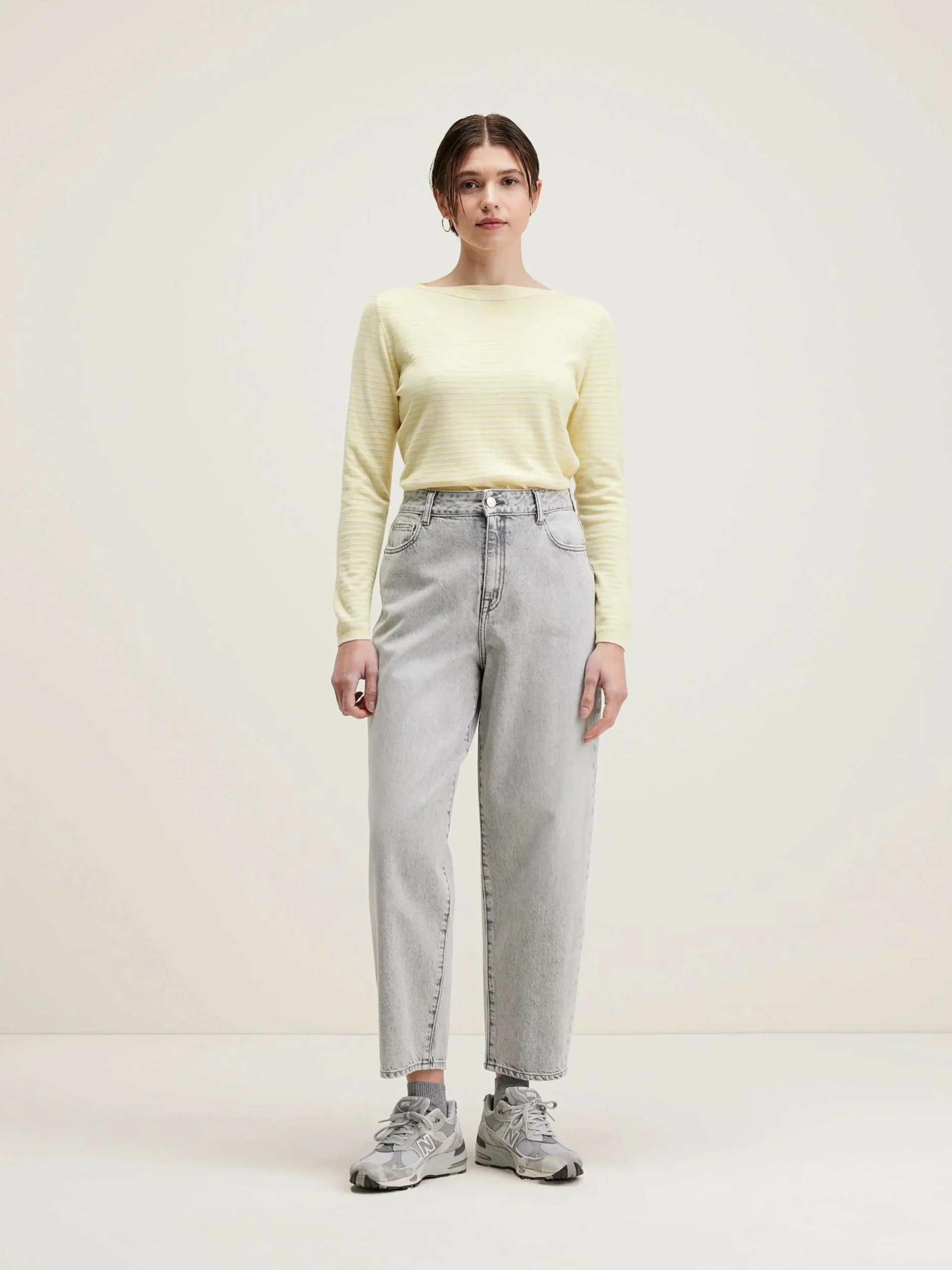 Sweater met boothals en gele strepen.