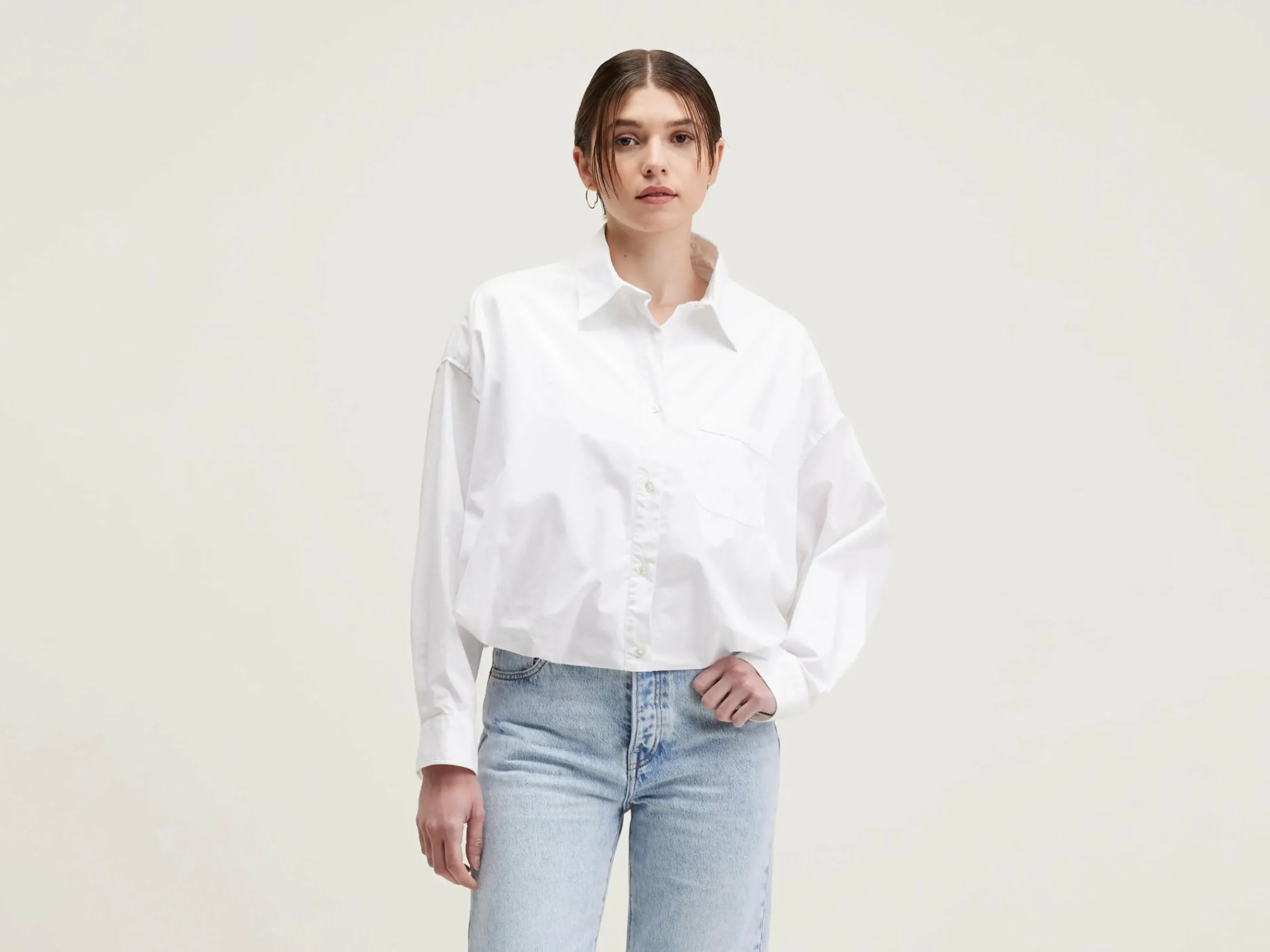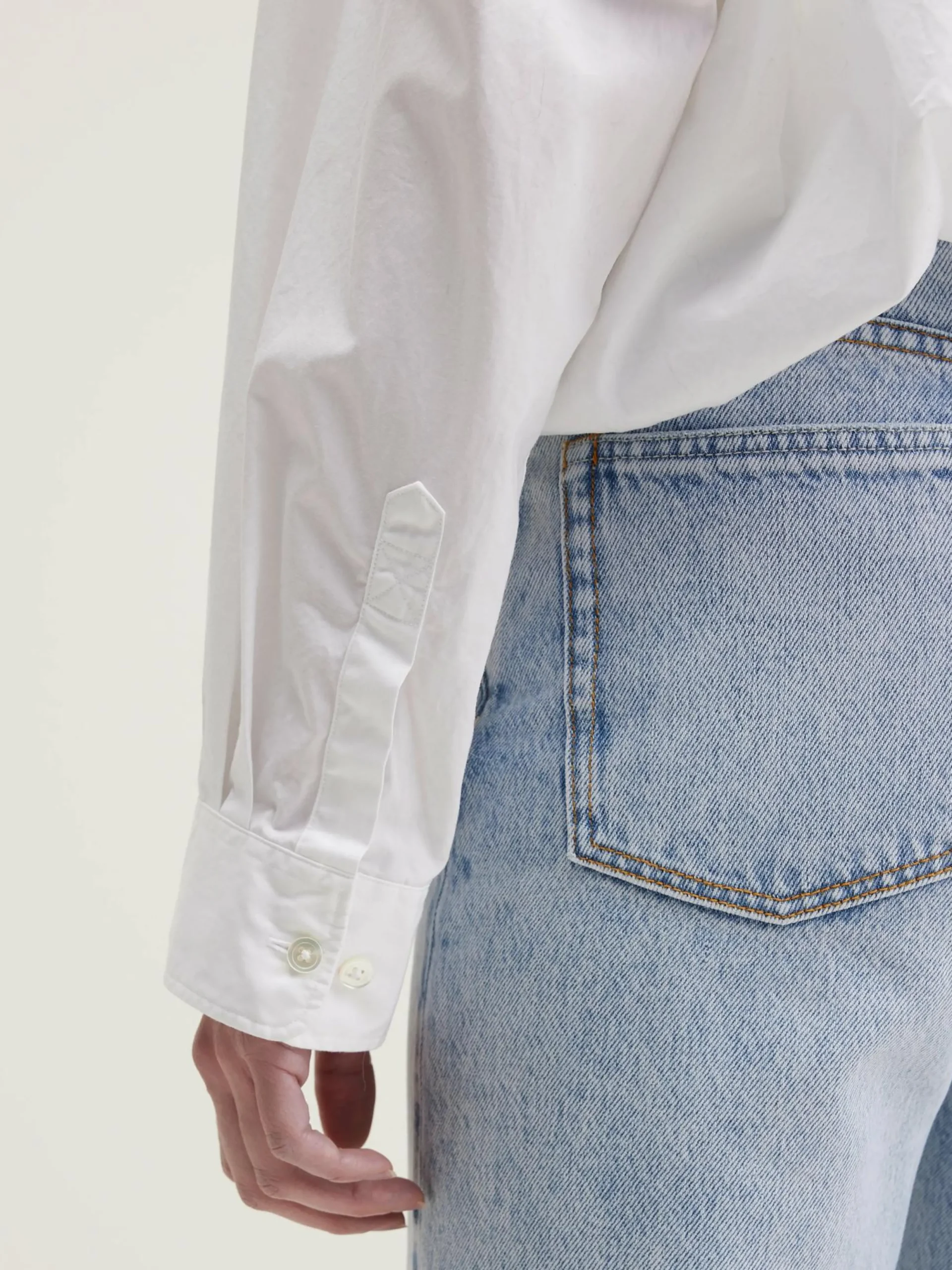 Volumineus overhemd van wit katoenpopeline met twee lagen.