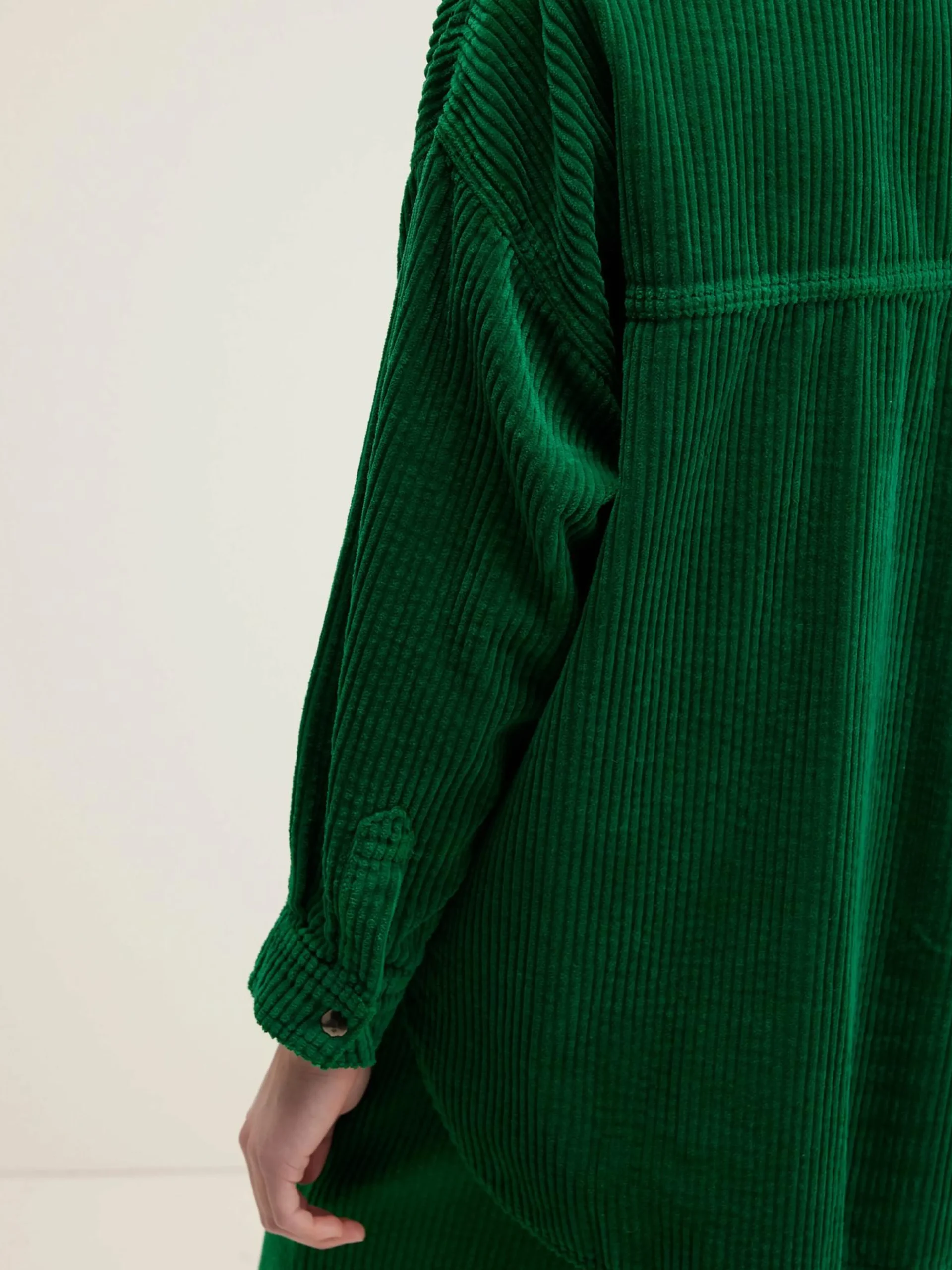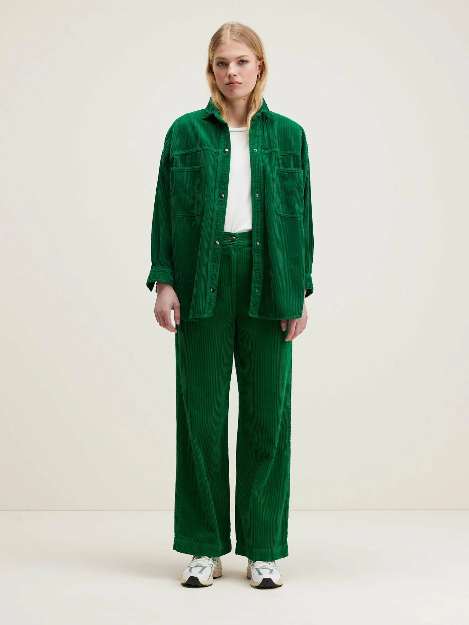 Grasgroen overhemd van baby cord, met recht schouderstuk en drukknopen.