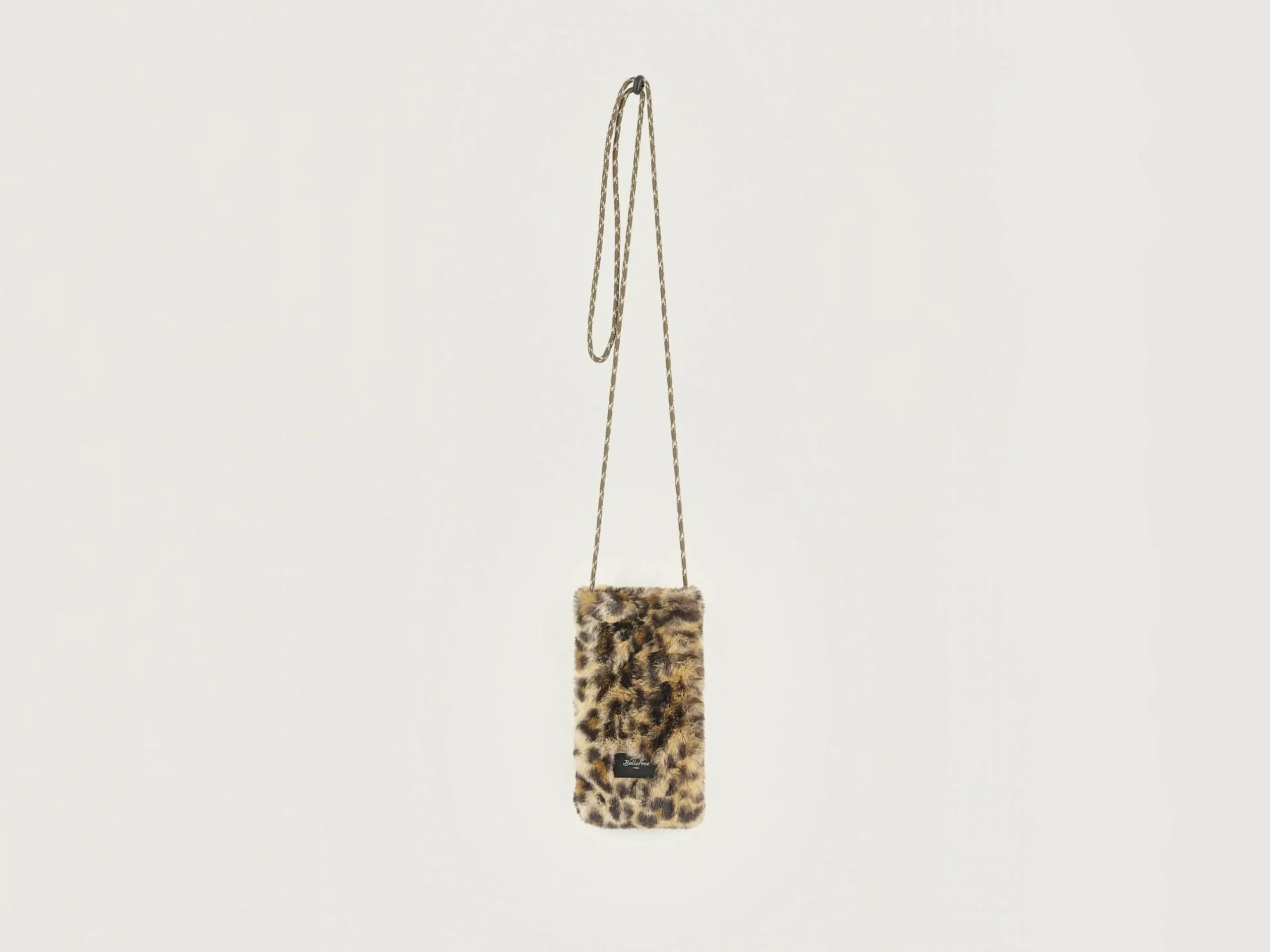 Telefoontasje van nepbont met luipaardprint, met verstelbare schouderriem en drukknoopsluiting.
