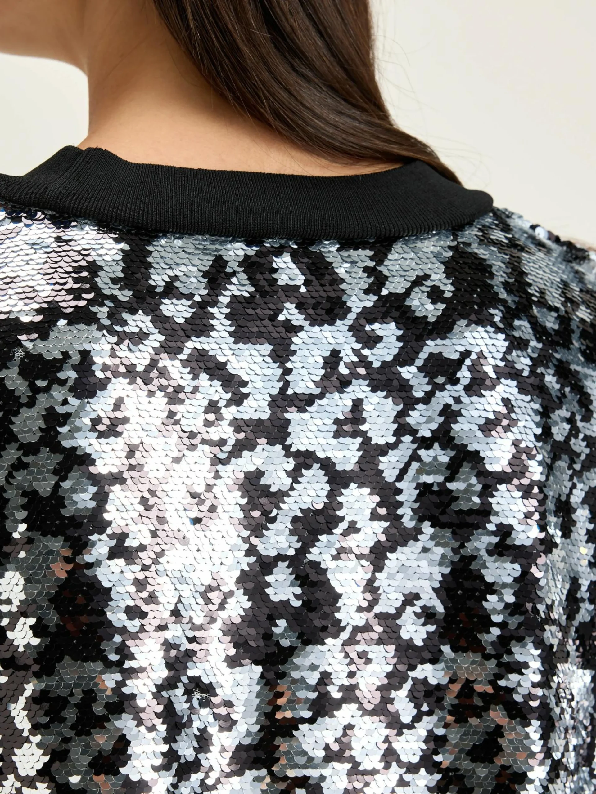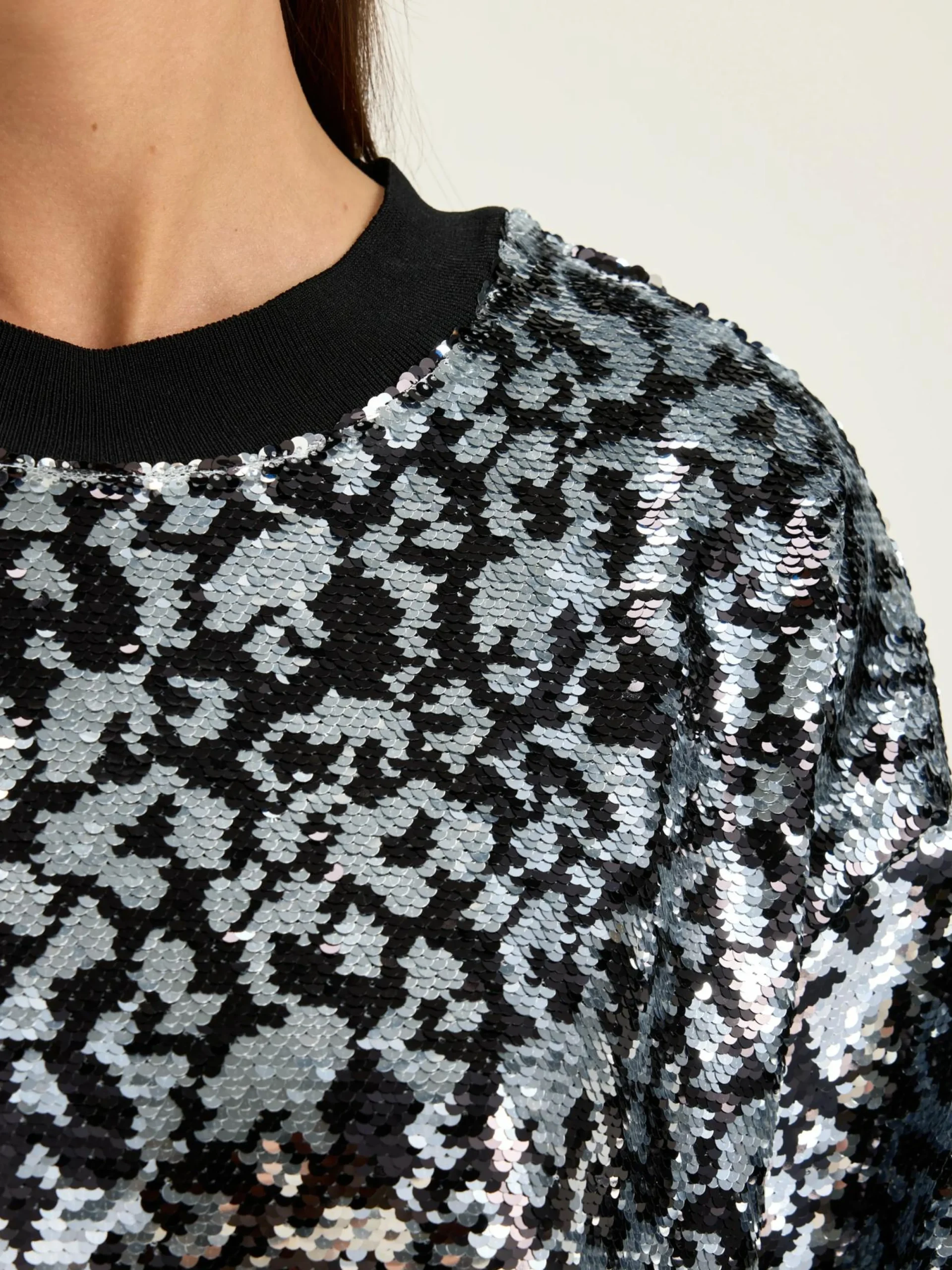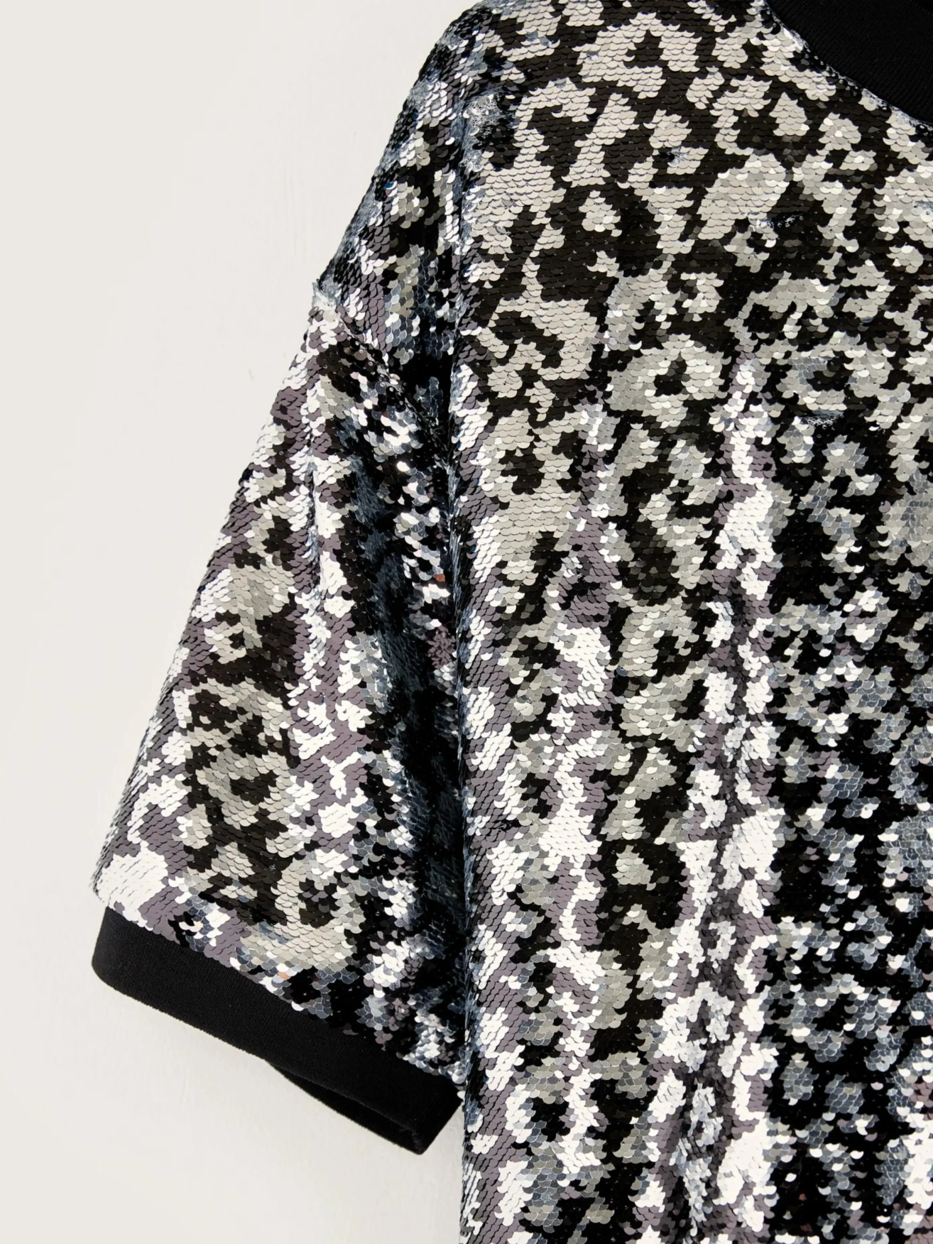 Mini-T-shirtjurk, volledig met luipaardpatroon, bezet met zwarte en witte lovertjes.