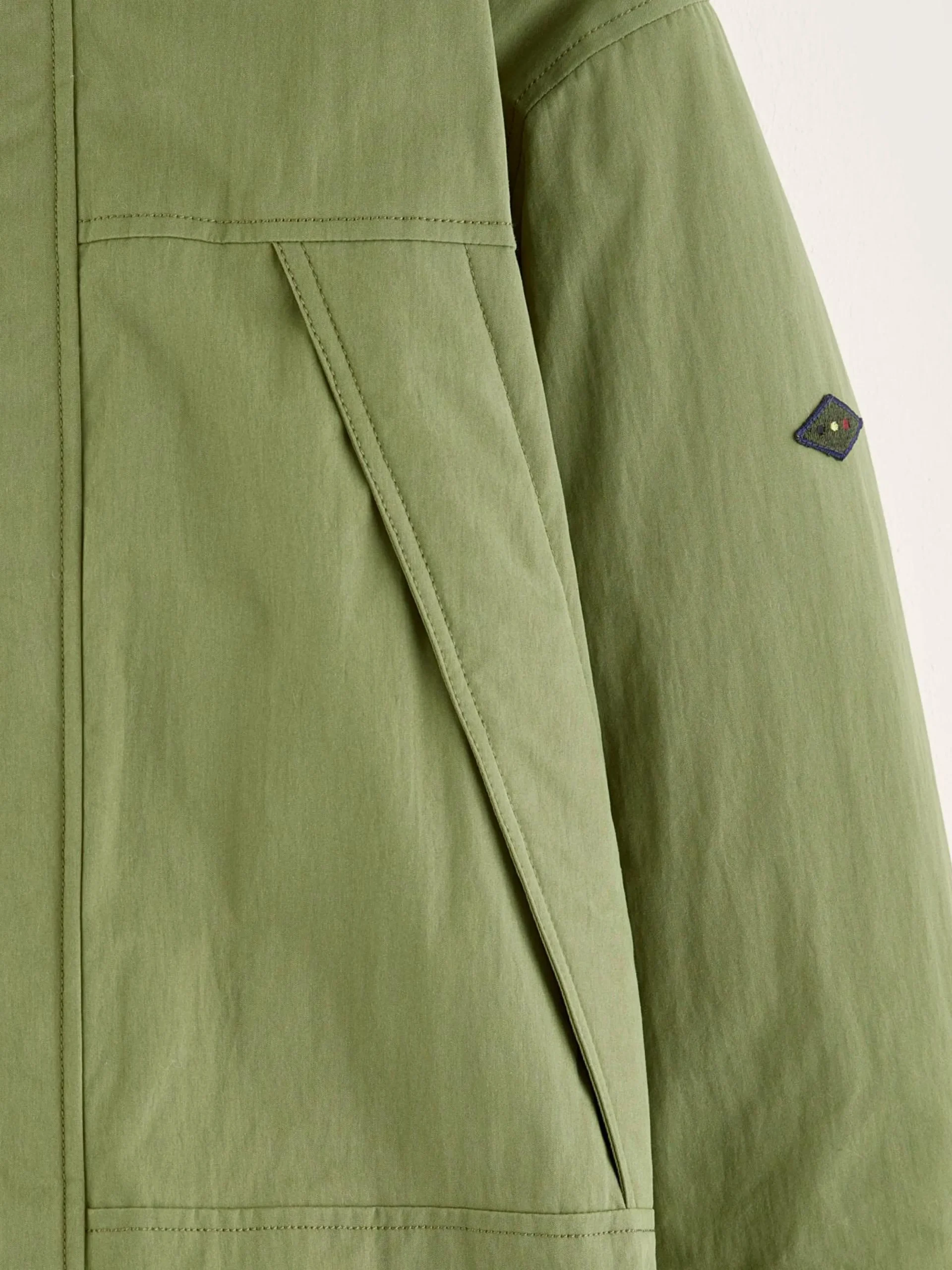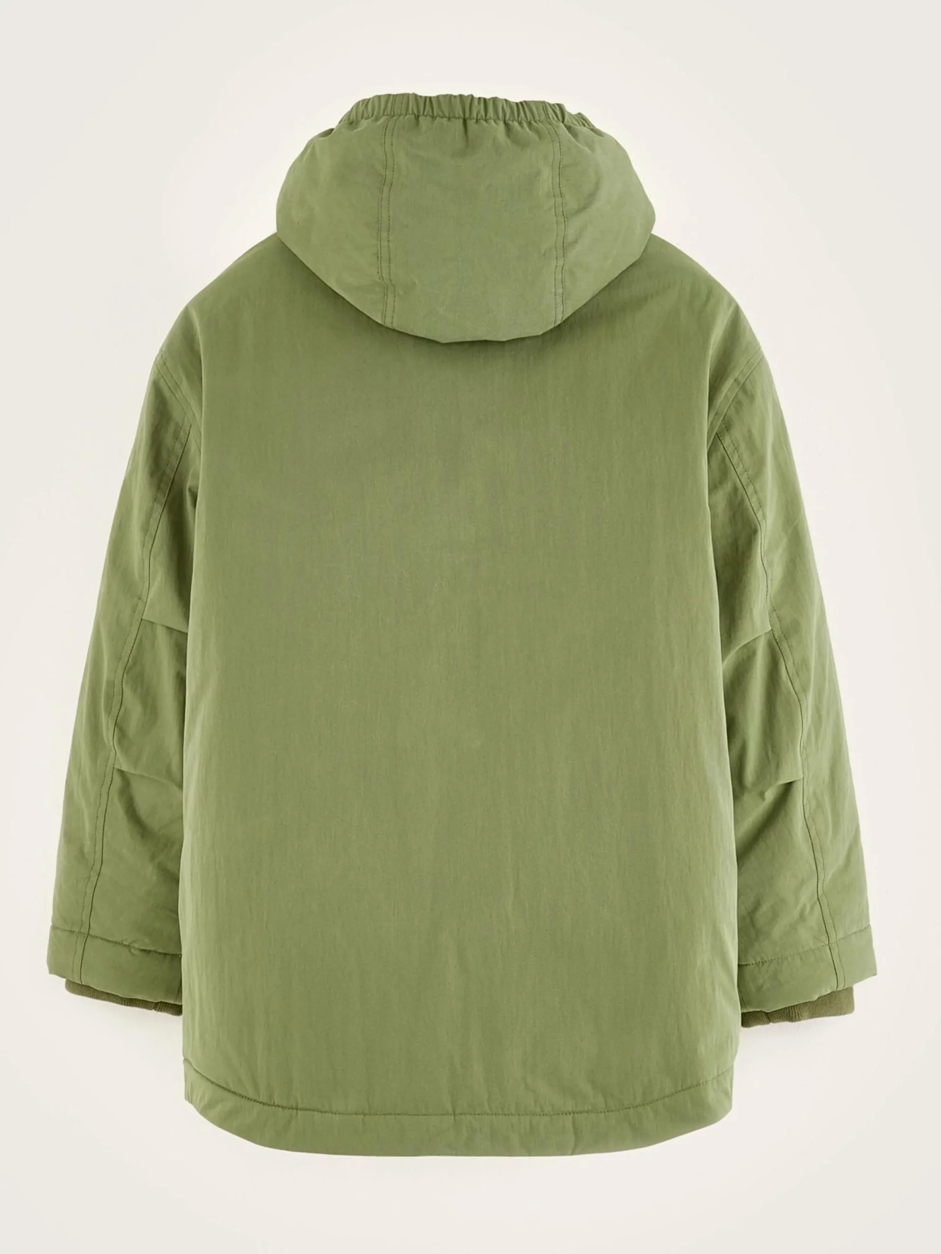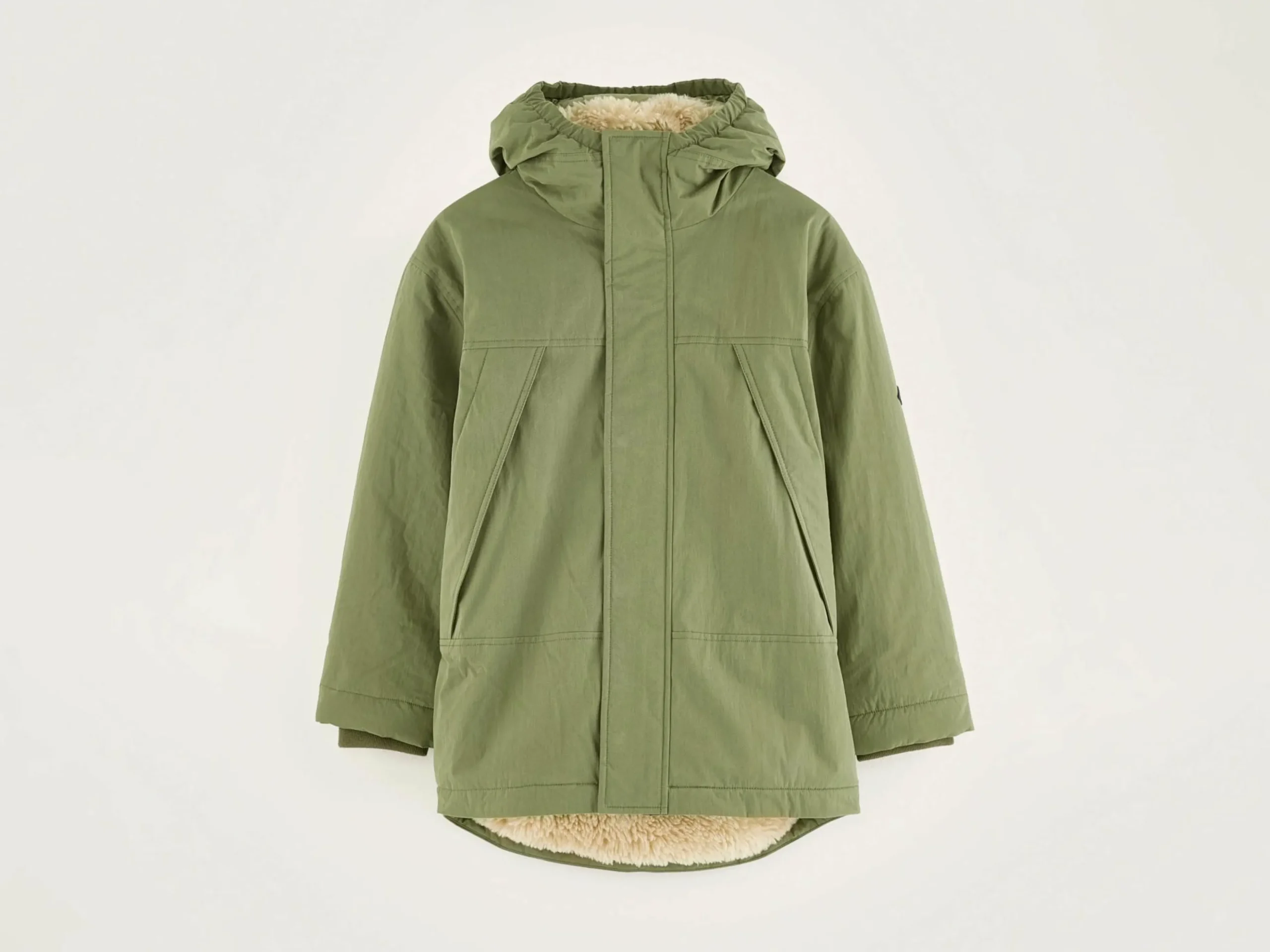 Klassieke legergroene parka met capuchon, schuine zakken met ritssluiting en voering van nepbont.