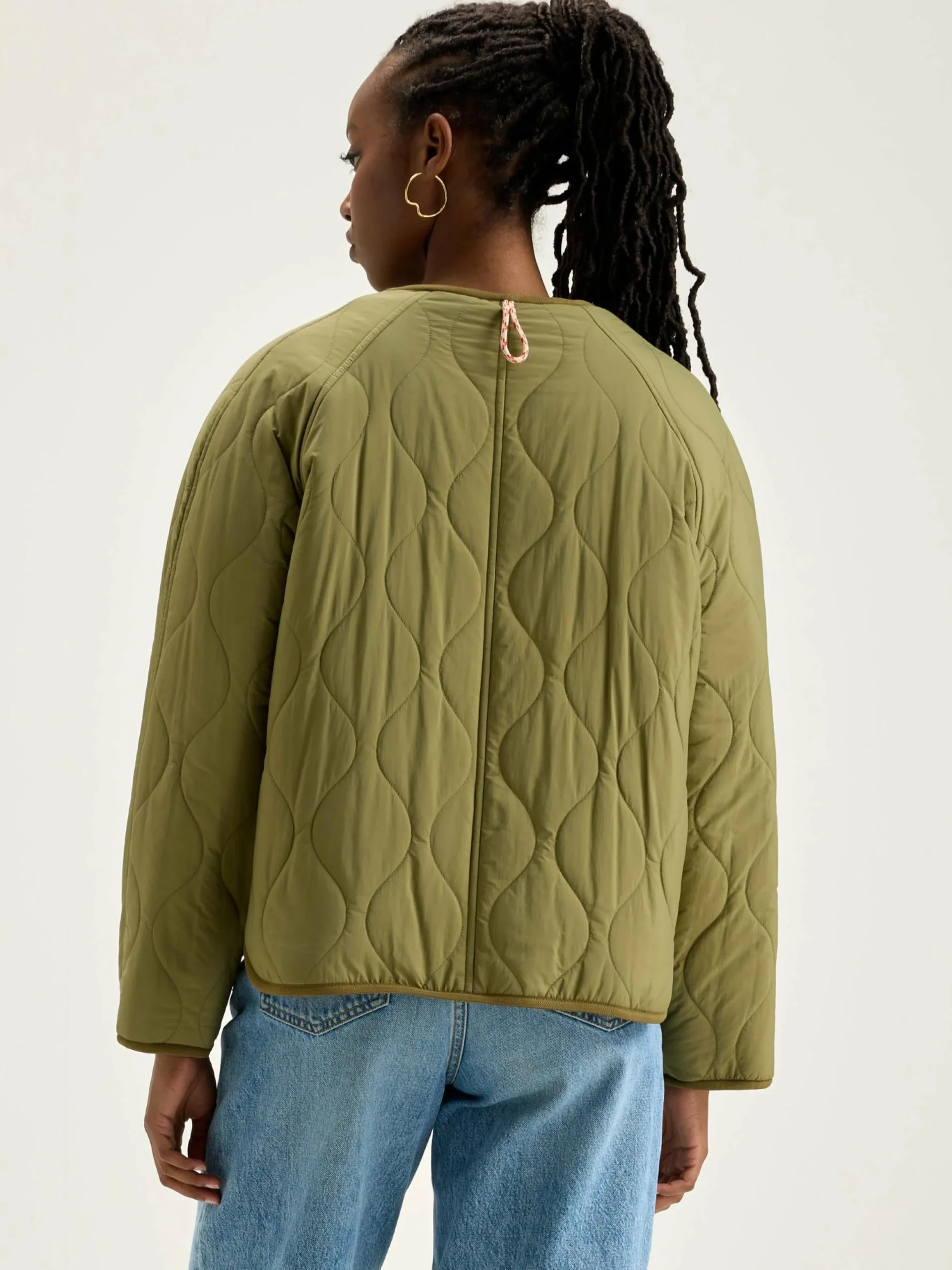 Omkeerbare oversizede jas met raglanmouwen. Een kant is van kaki ripstop stof en de andere is fleecestof met een luipaardprint.