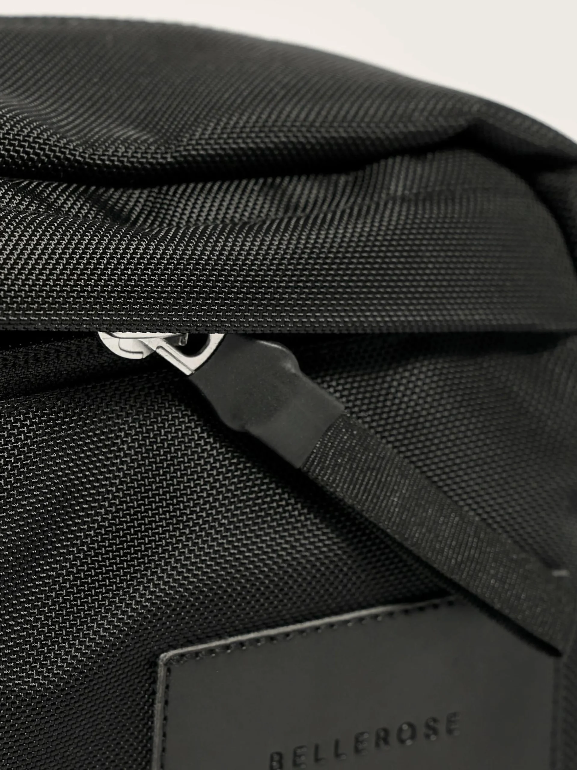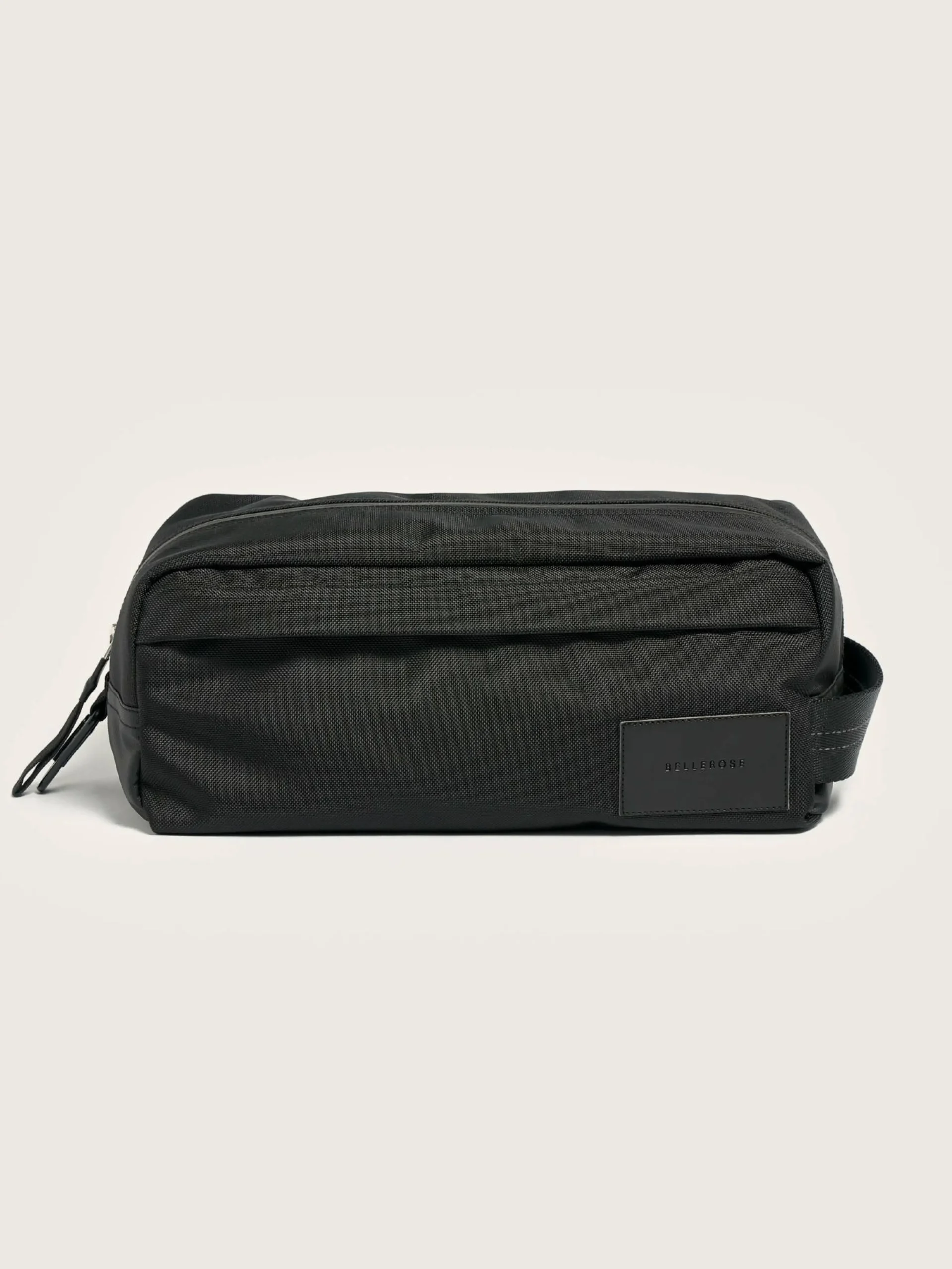 Toilettas van zwart gecoat nylon, met ritssluiting bovenaan en karabijnhaak.