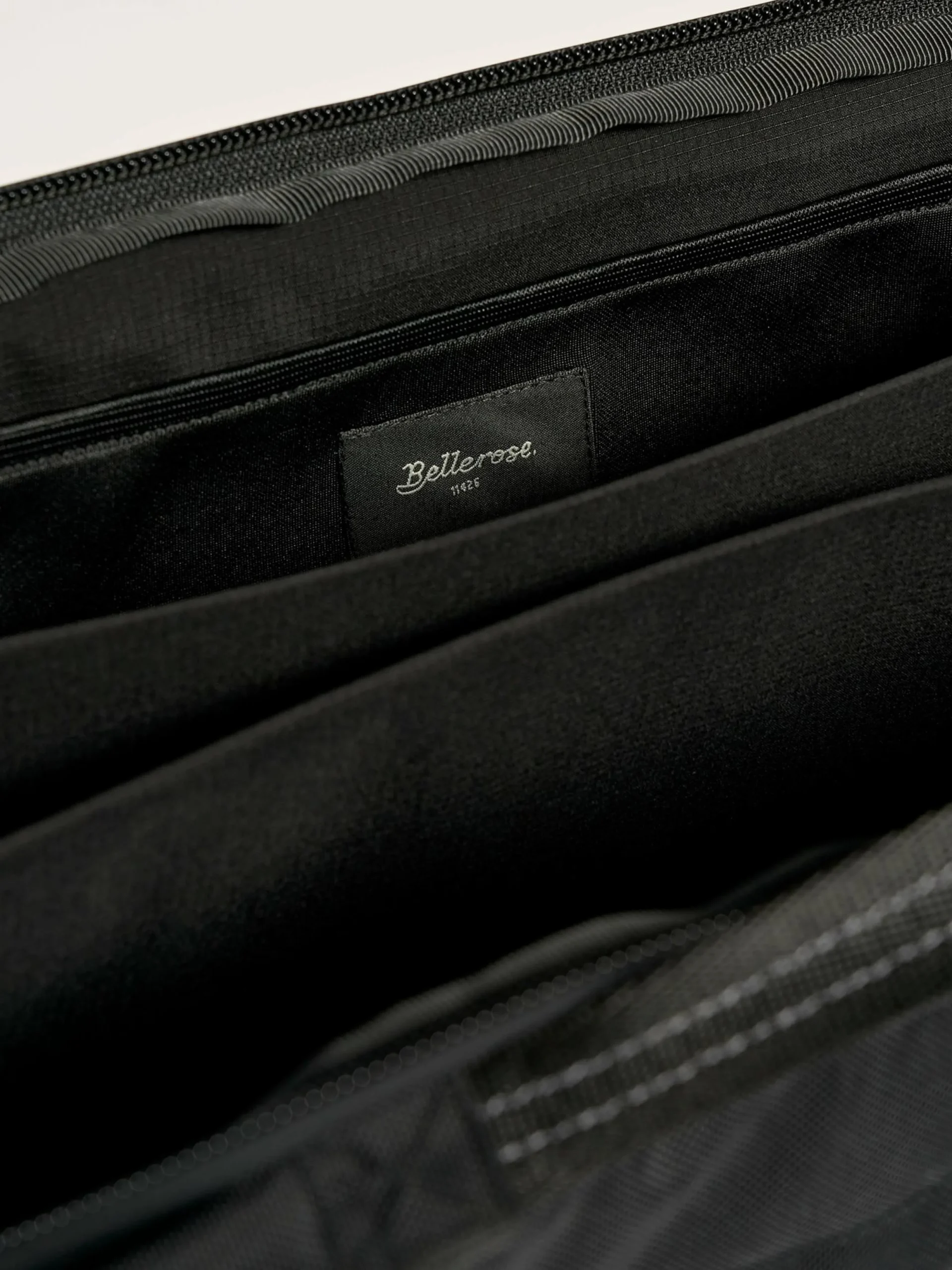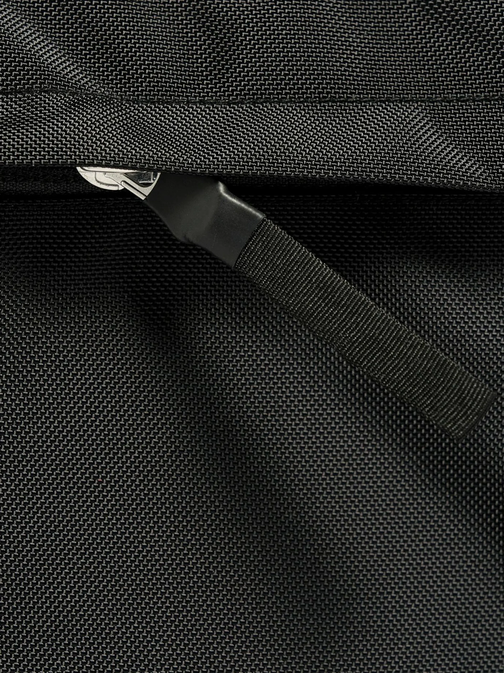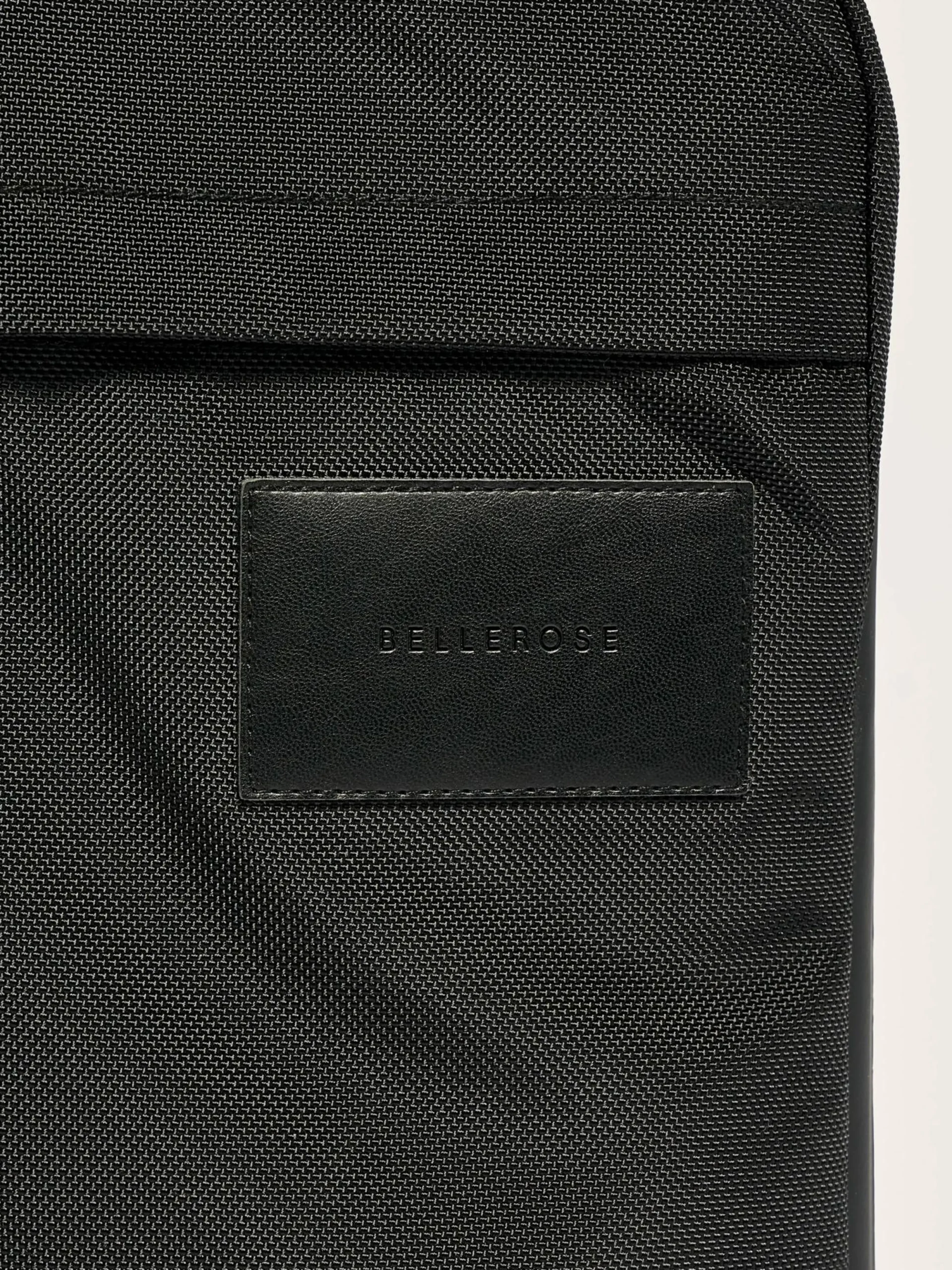 Laptoptas van zwart gecoat nylon met ritssluiting bovenaan, een zijtas met ritssluiting voor telefoonlader en kabel, en een handvat bovenaan.