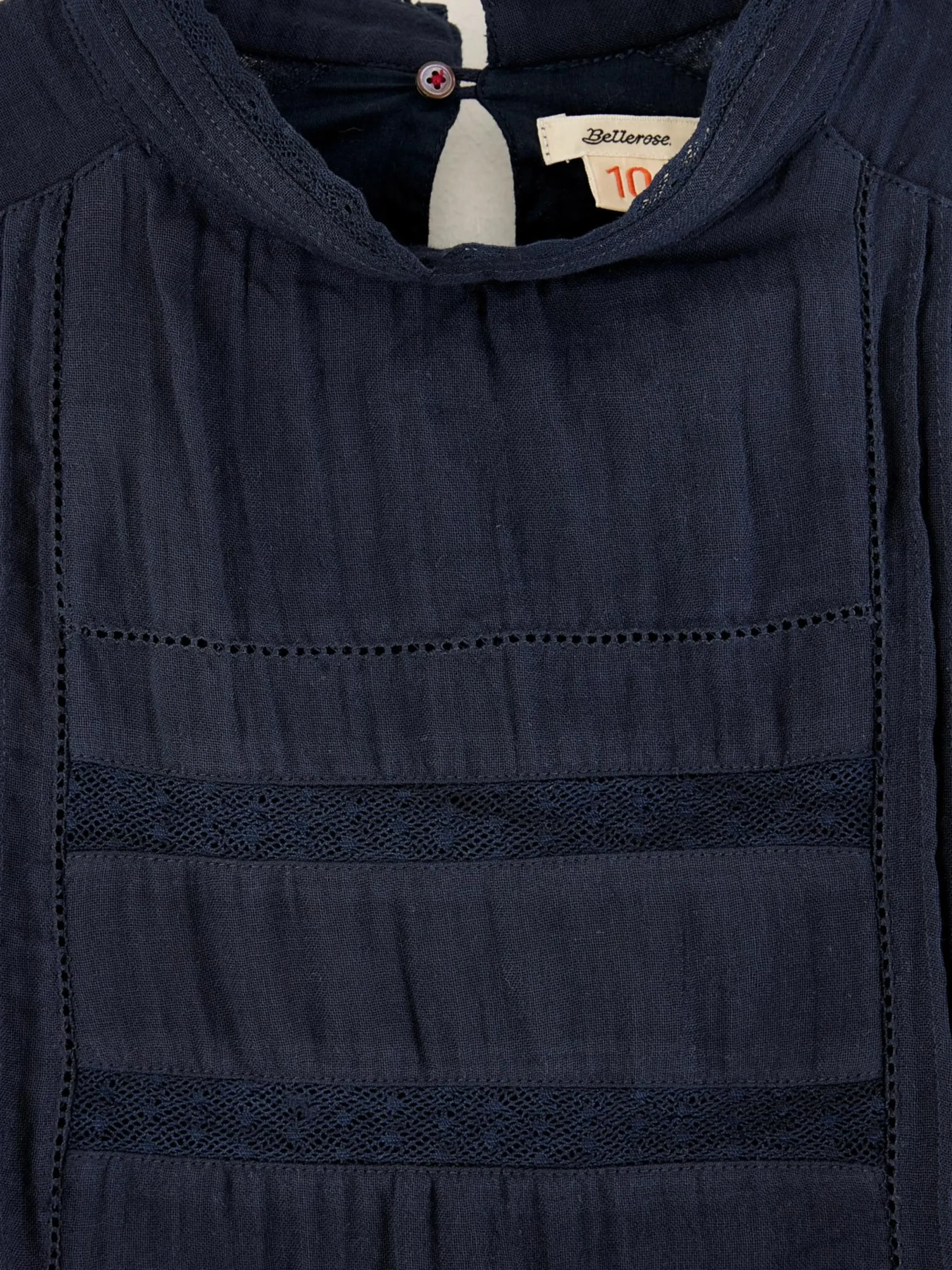 Romantische, donkerblauwe mini-jurk van dubbel geweven katoen met kanten details.