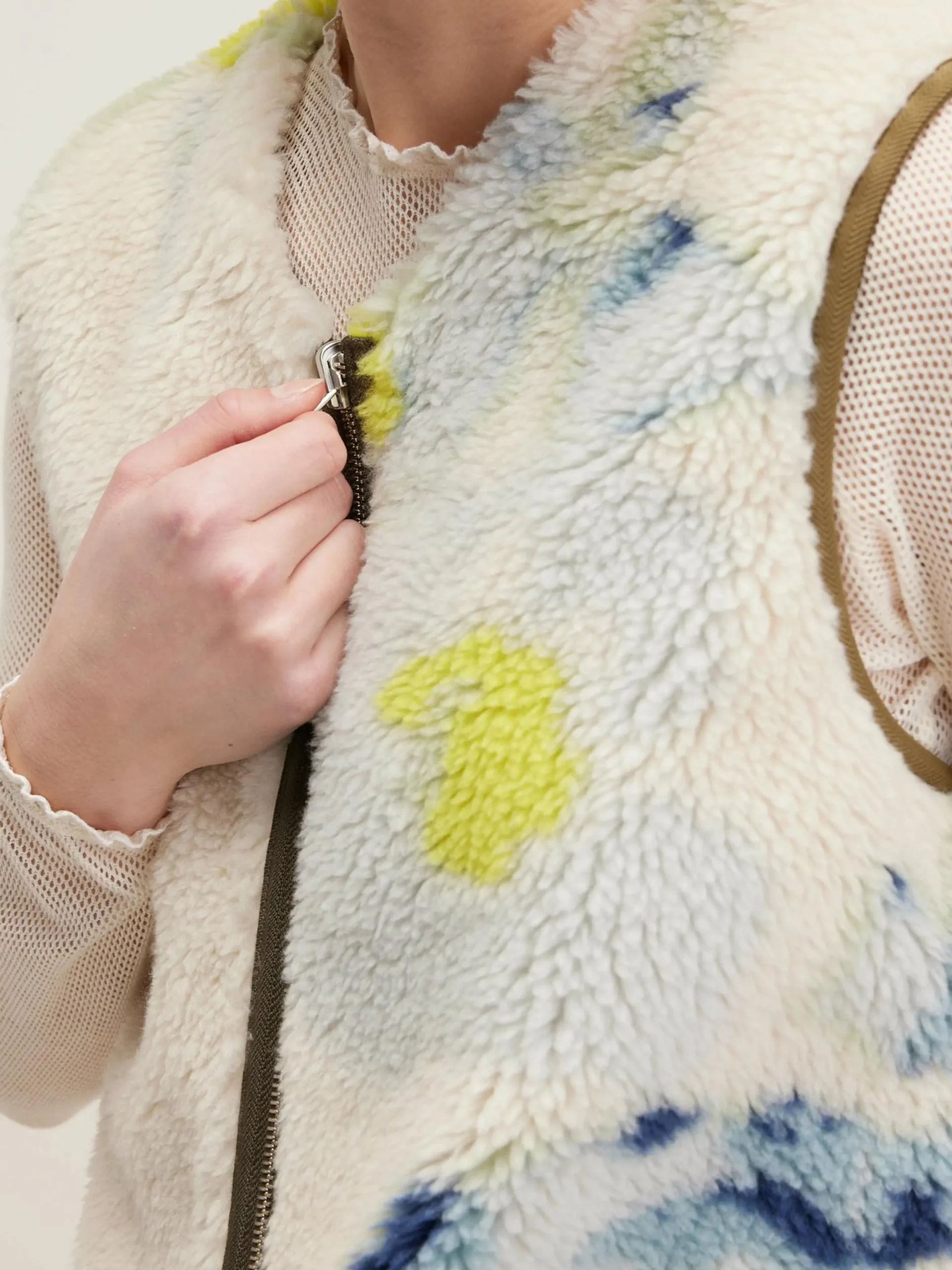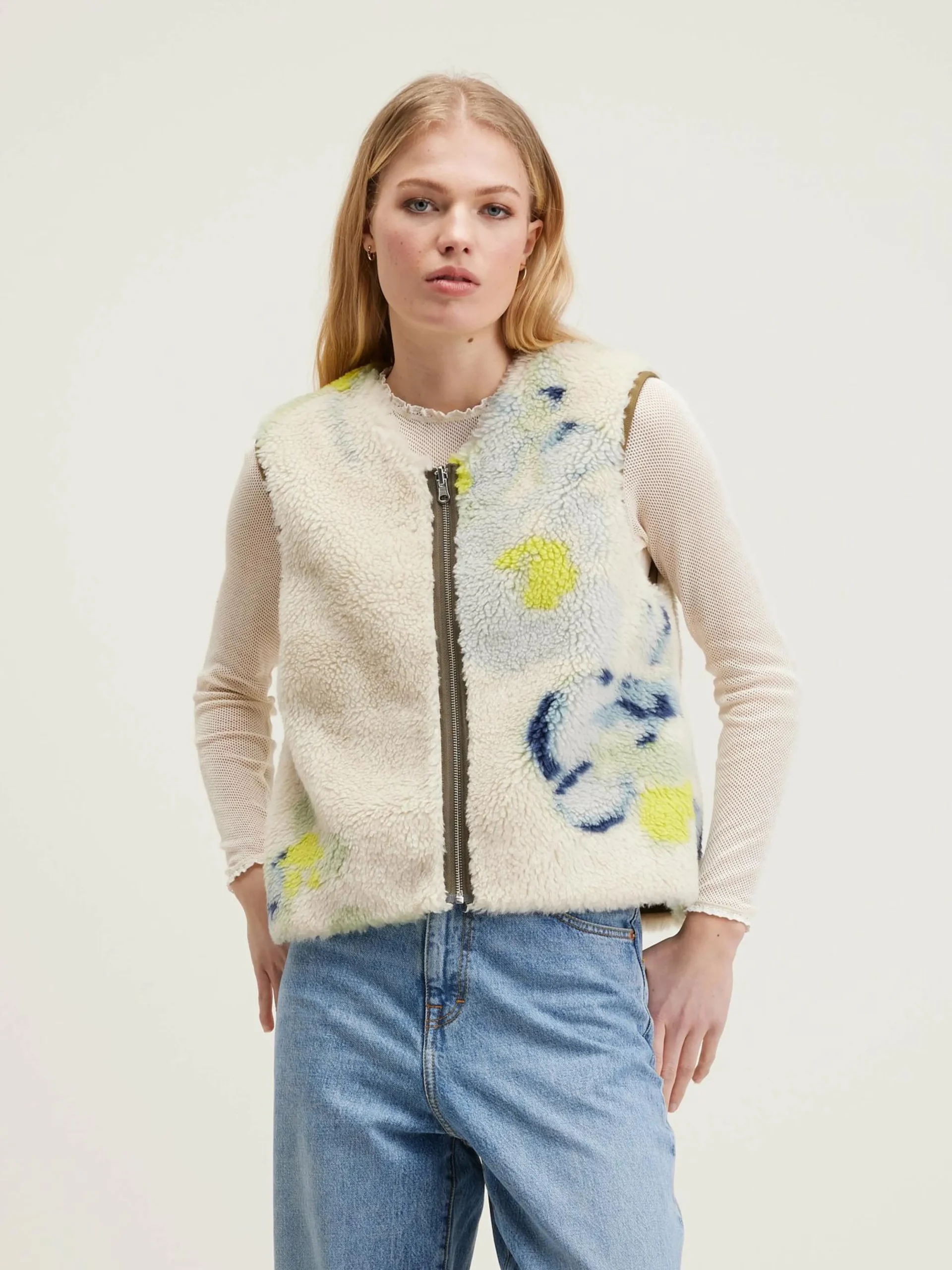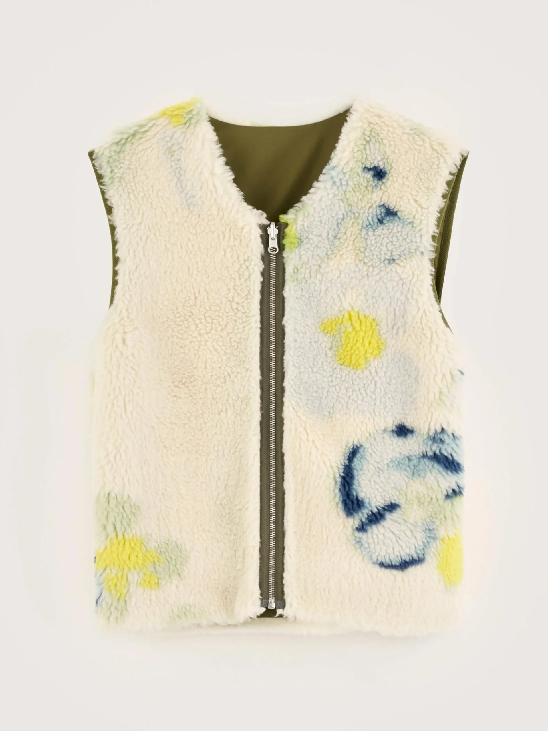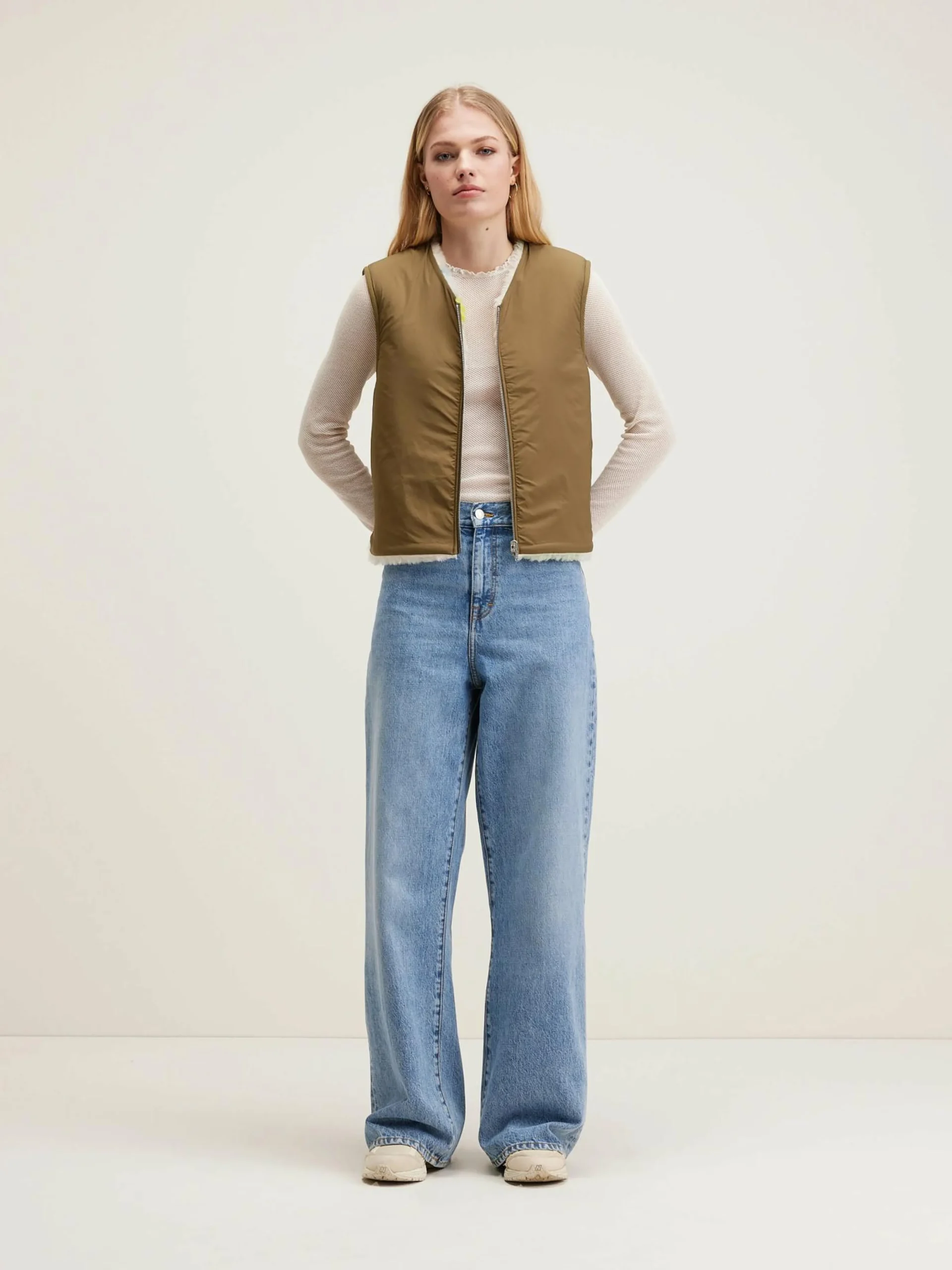 Omkeerbaar, kakigroen bodywarmer van satijn.