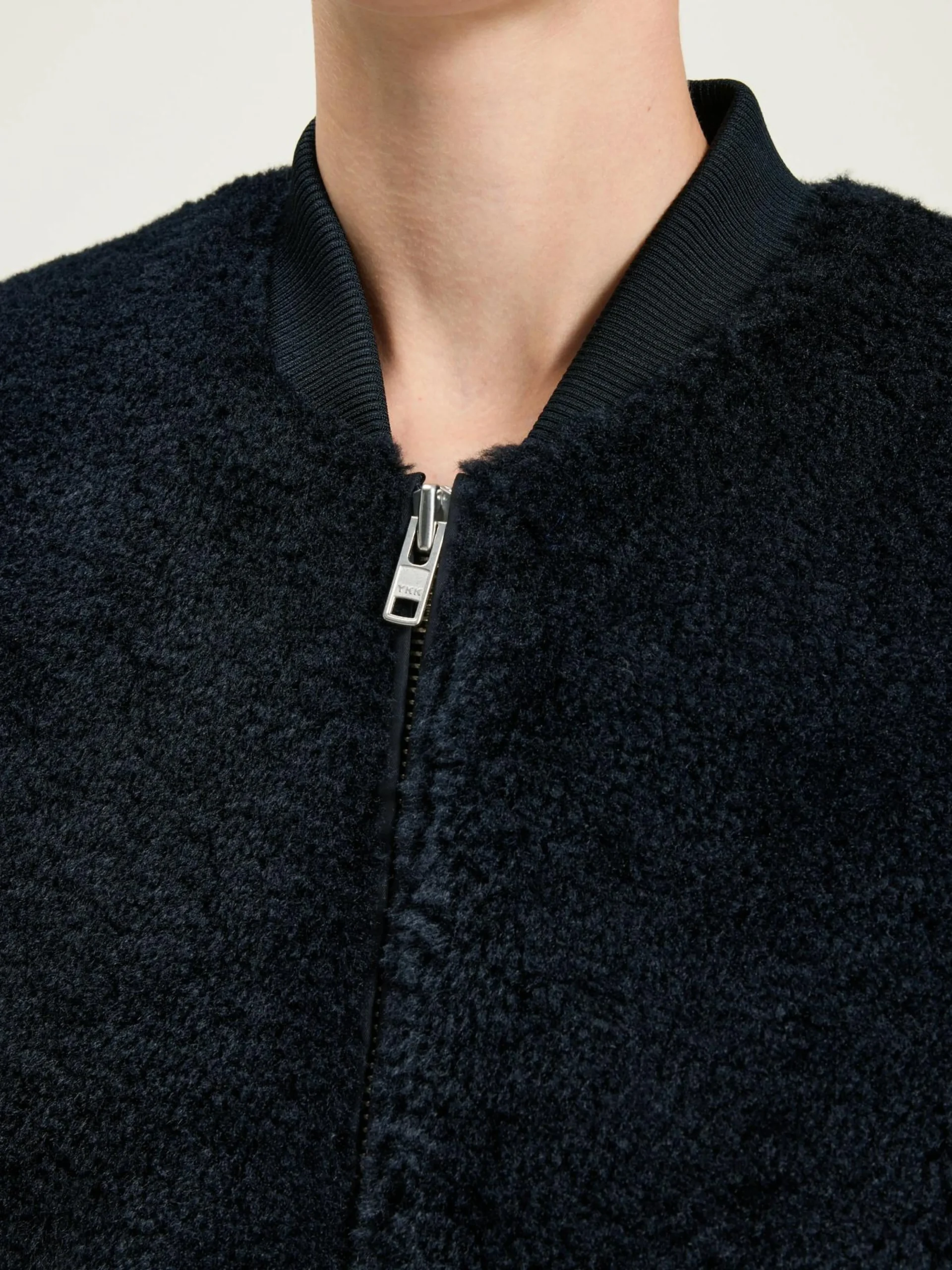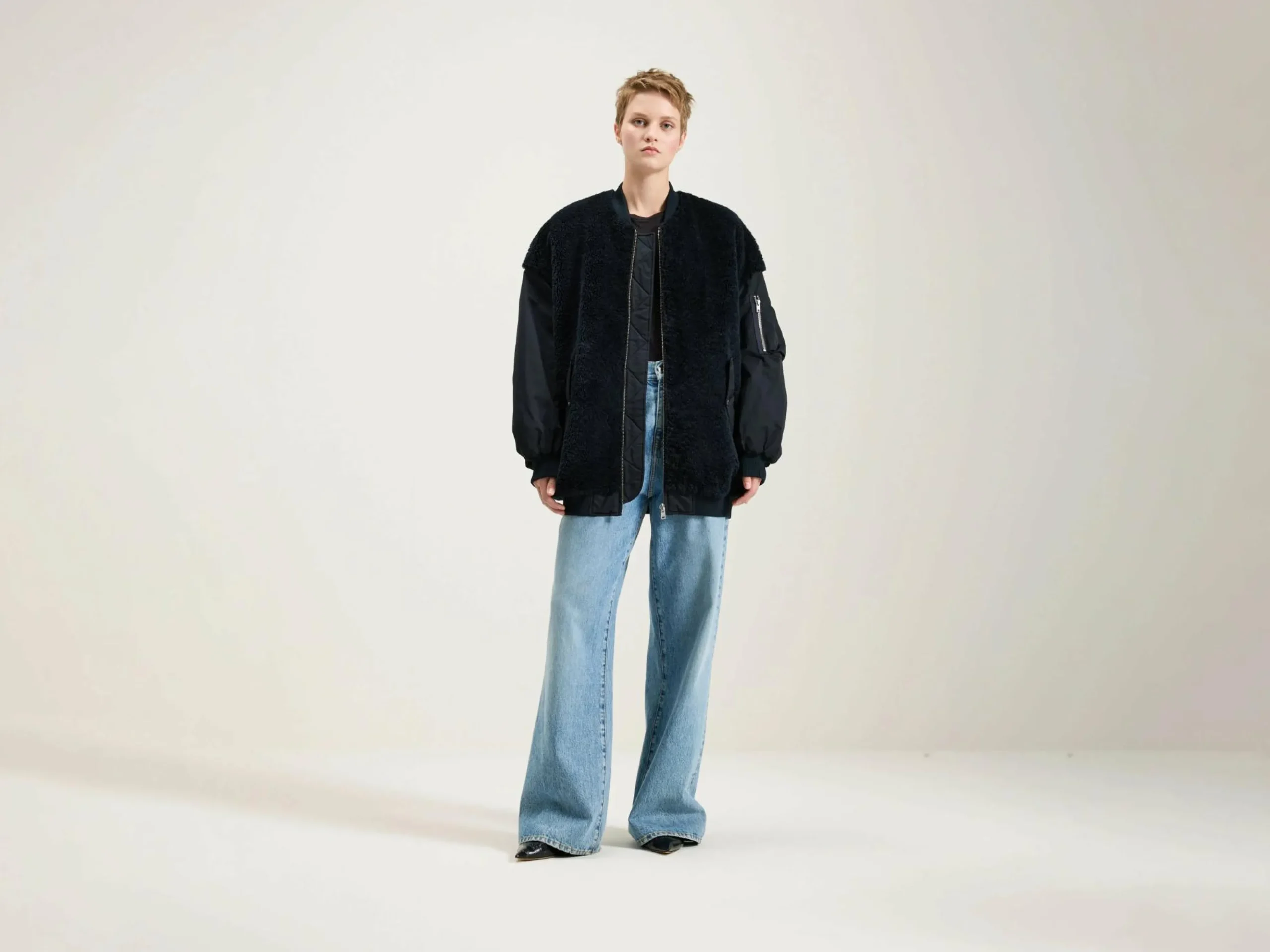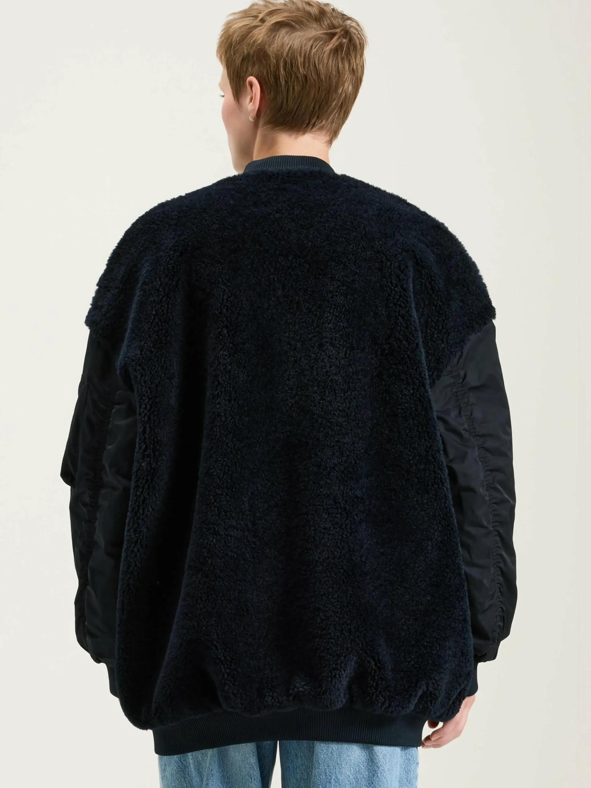 Oversizede, marineblauwe bomberjas met een body van nepbont en mouwen van satijncanvas.