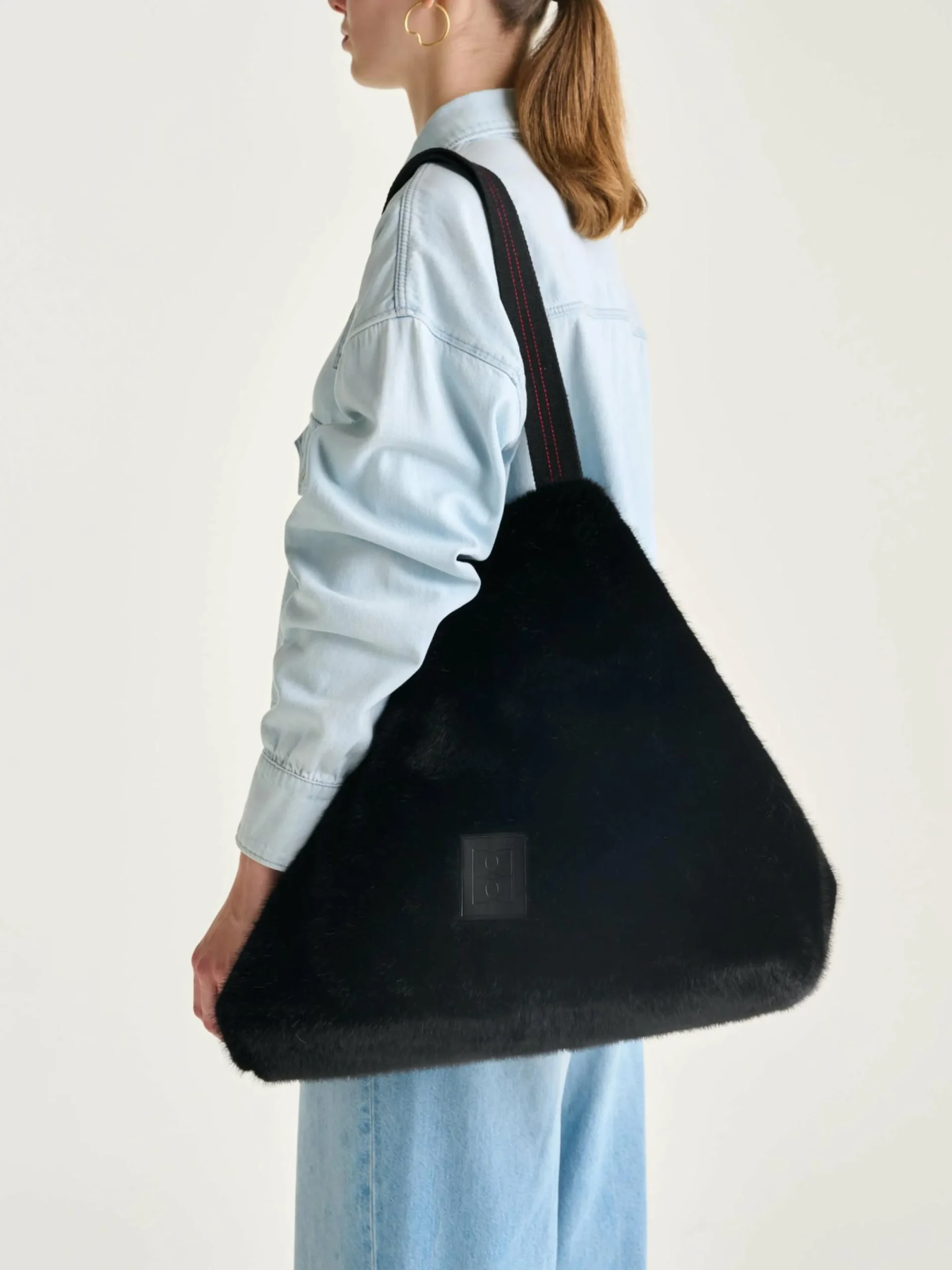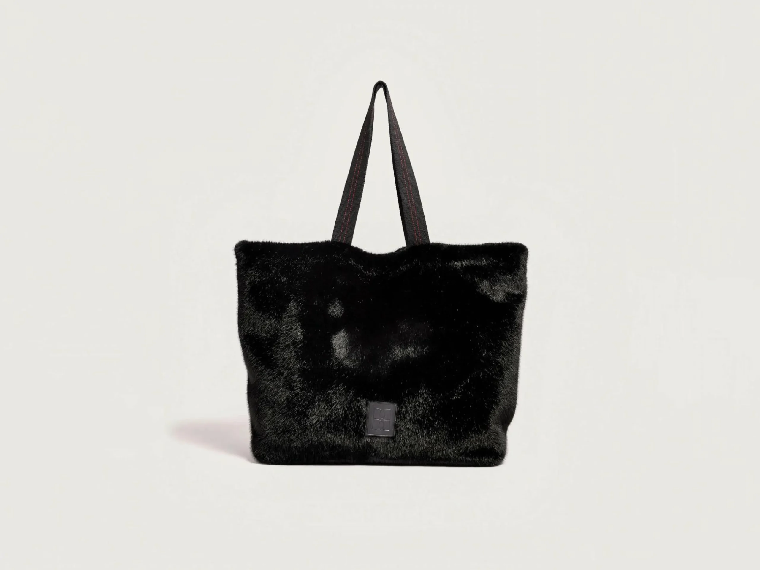 Handtas met dubbele sluiting, van zwart nepbont en met twee paar hengsels.
