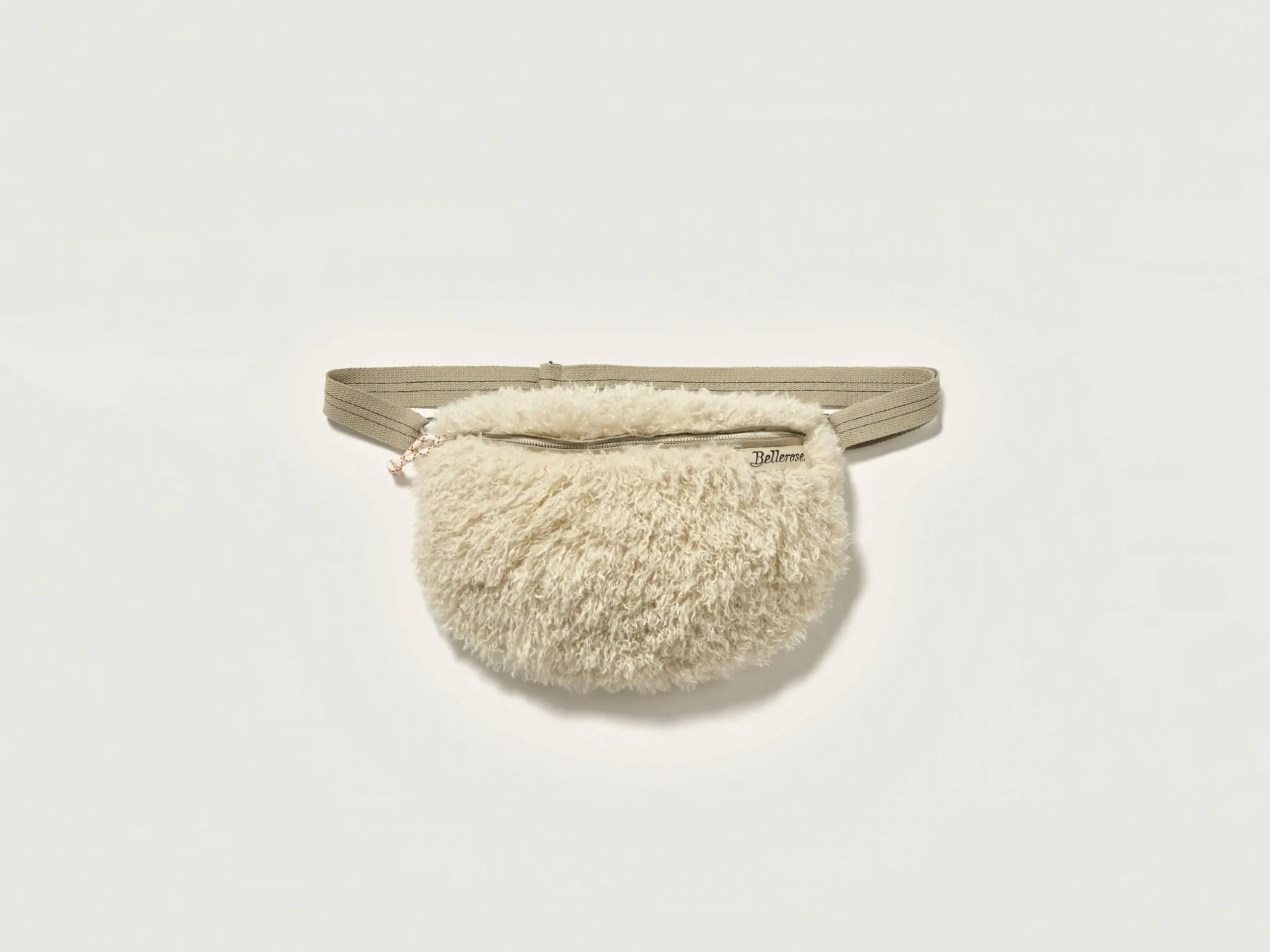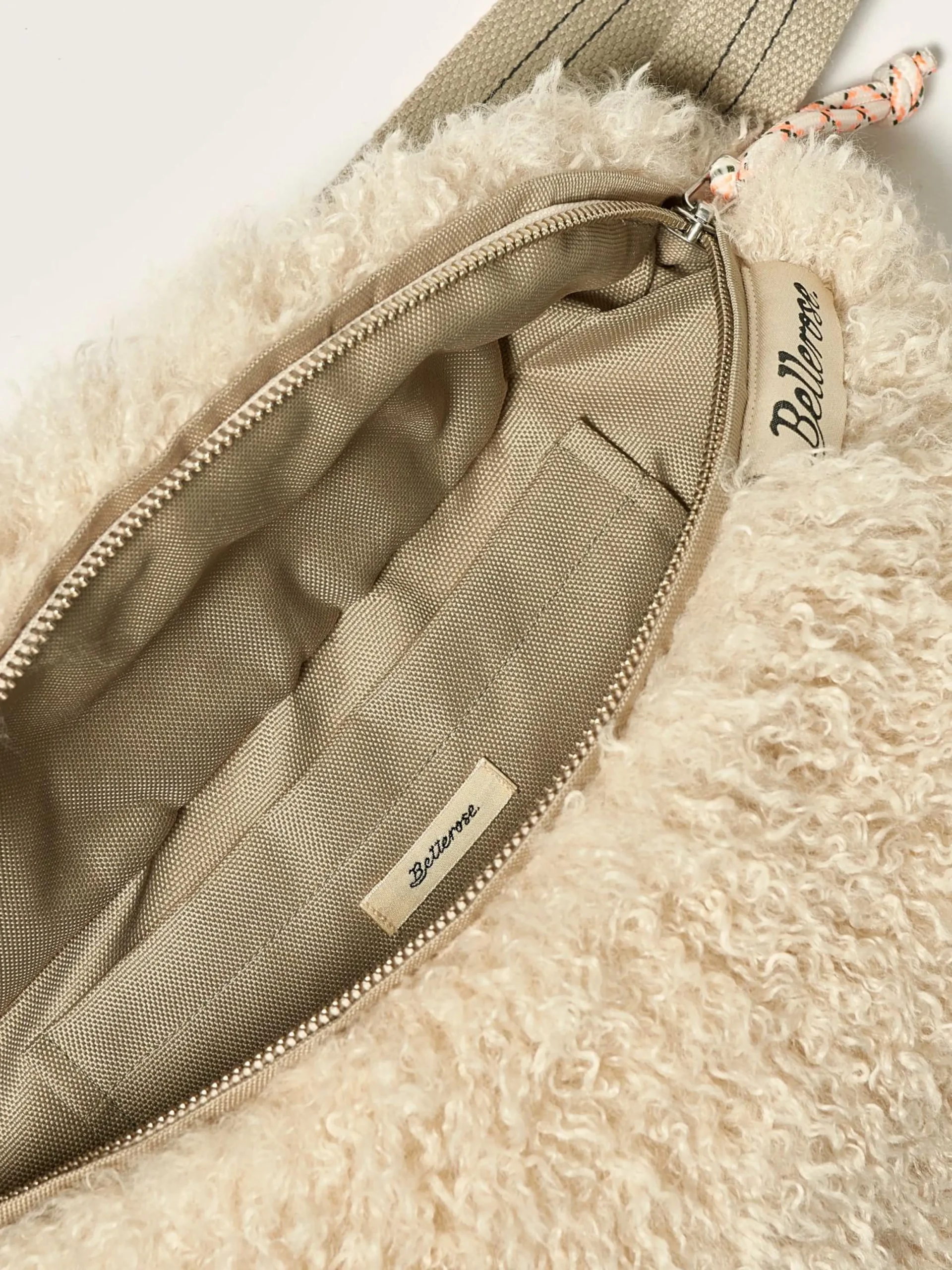 Sling bag met ritssluiting vooraan, van lichtbeige nepbont.