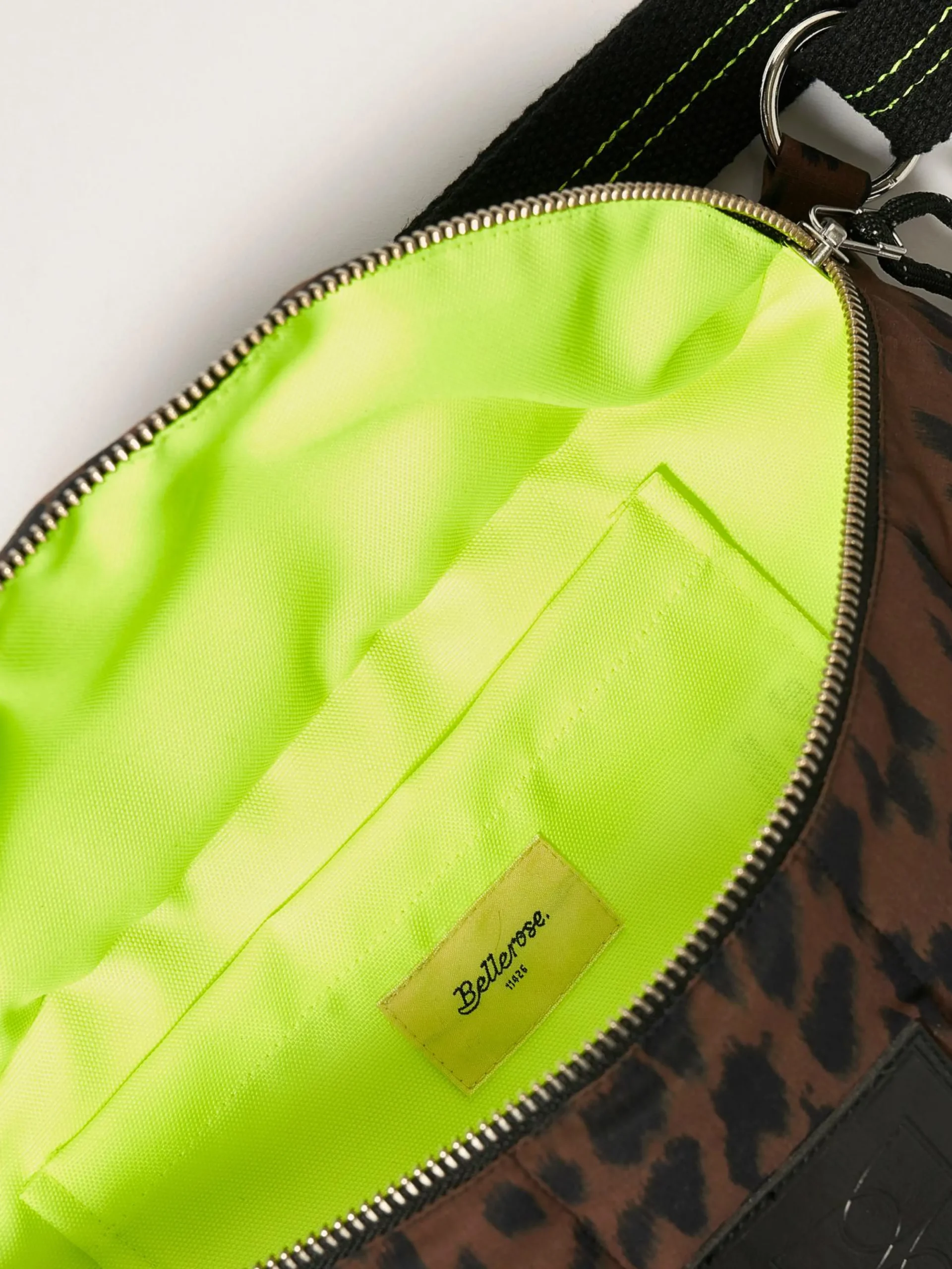 Heuptas met rits vooraan, van gewatteerde ripstop met luipaardprint.