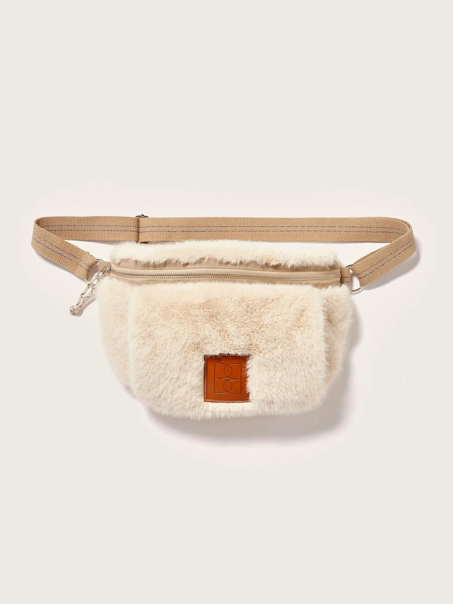 Moftas van lichtbeige nepbont, met een Bellerose-label op de voorkant en ruimte om de handen te verwarmen.