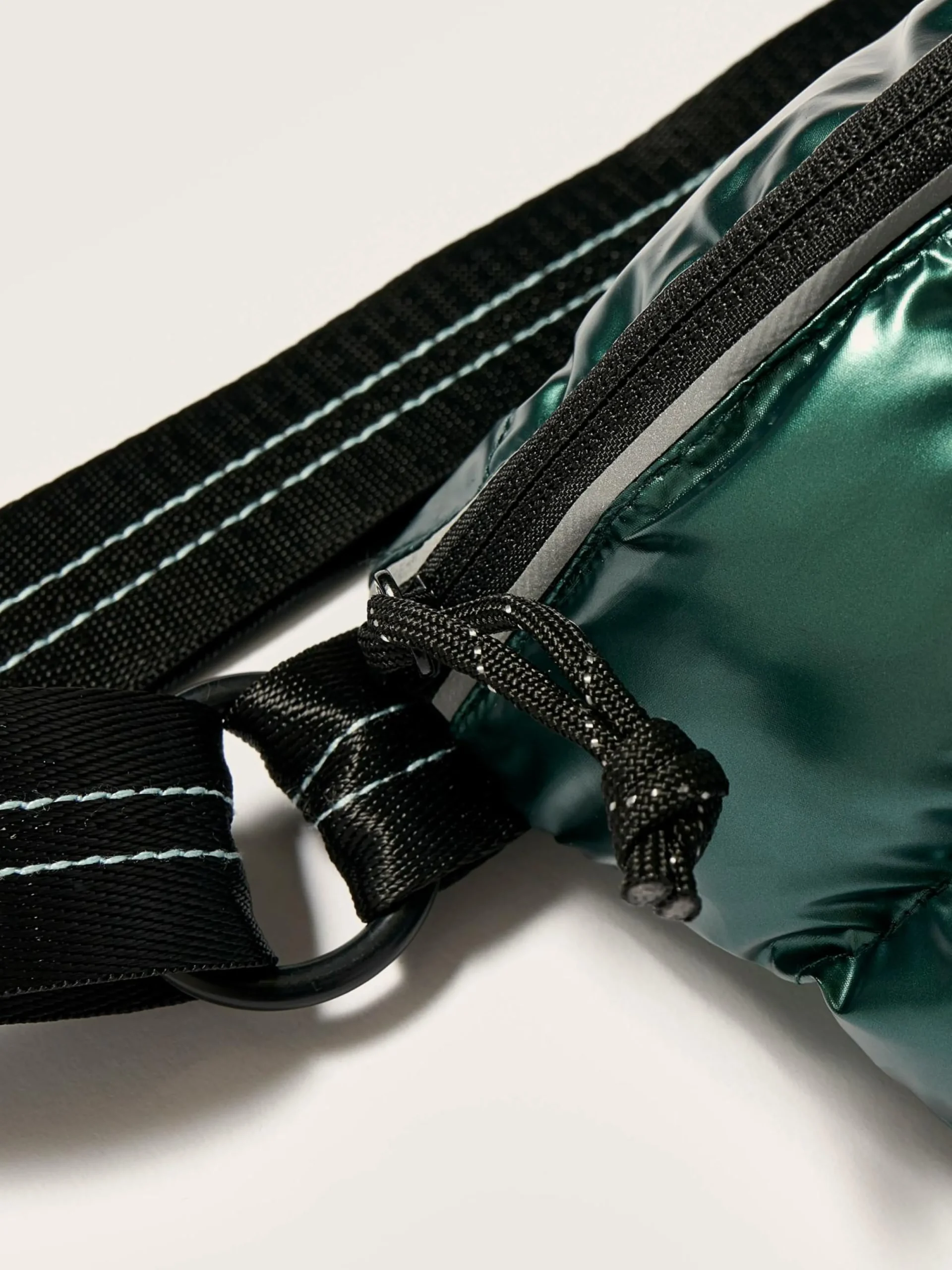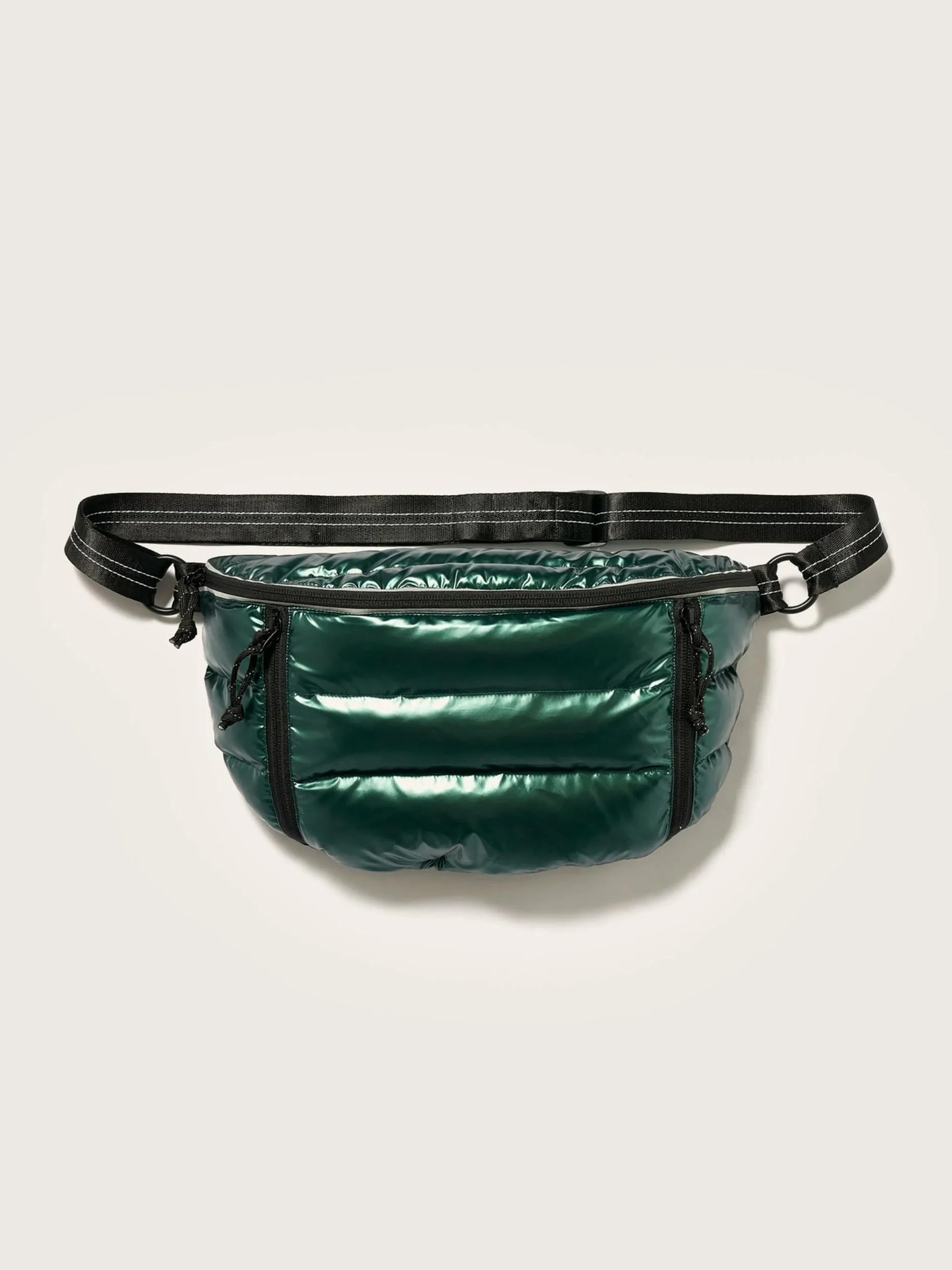 Gewatteerde puffer sling bag van glanzend donkergroen nylon.