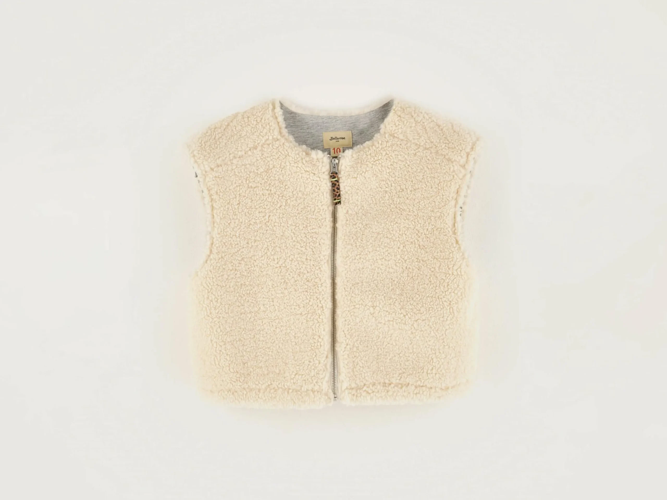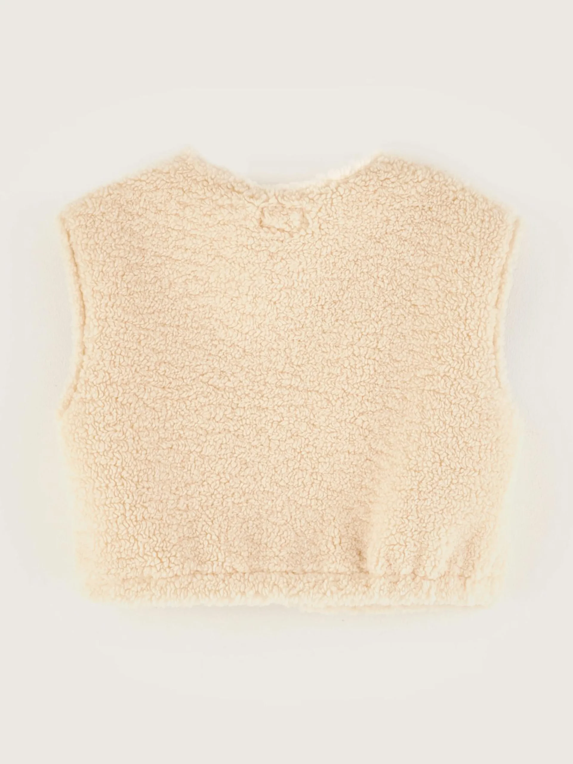 Cropped, mouwloos ecru sweatshirt met ritssluiting vooraan, van teddystof.