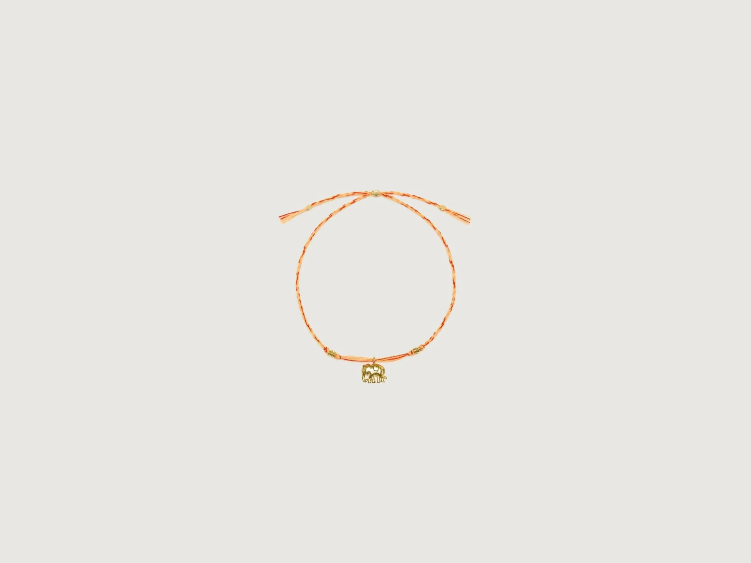 De Ellie armband is een handgemaakte, verstelbare vlecht van fijn koord versierd met een vergulde olifantenbedel.
