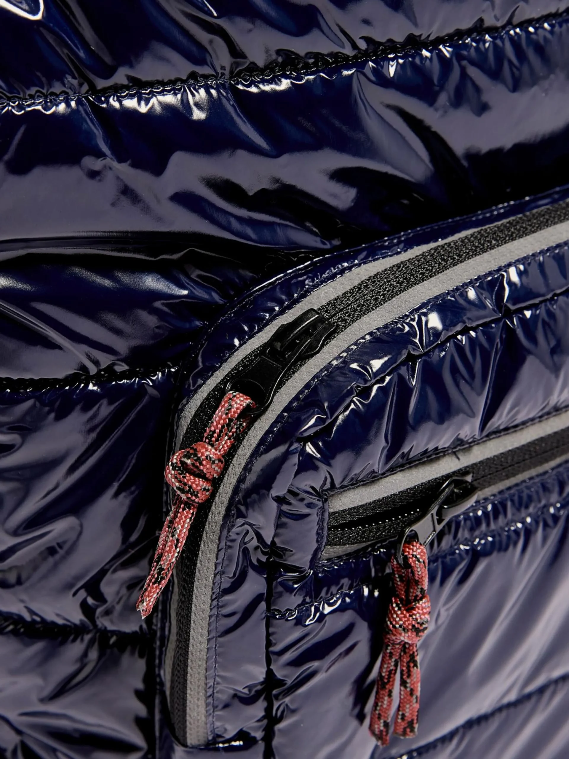Gewatteerde rugzak van glanzend, marineblauw ripstopmateriaal, met een ritssluiting aan de bovenkant en een voorvak.