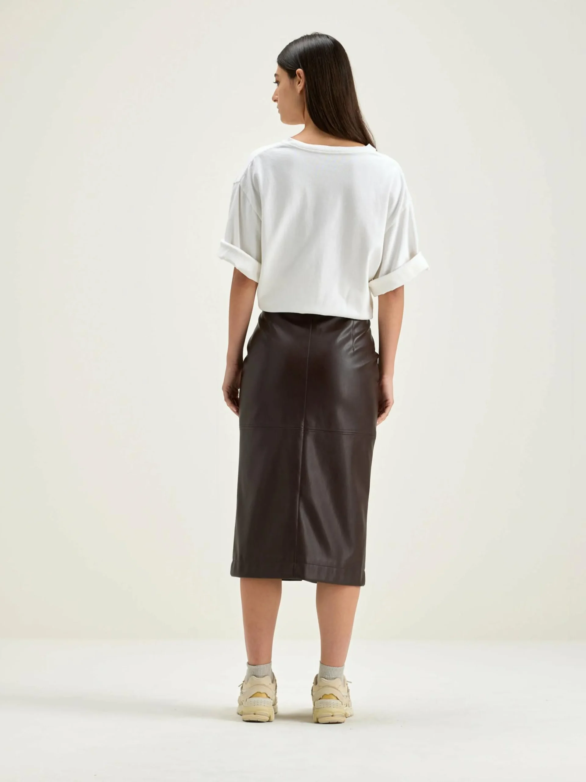 High-waist kokerrok van bruin imitatieleer, met voorsplit.