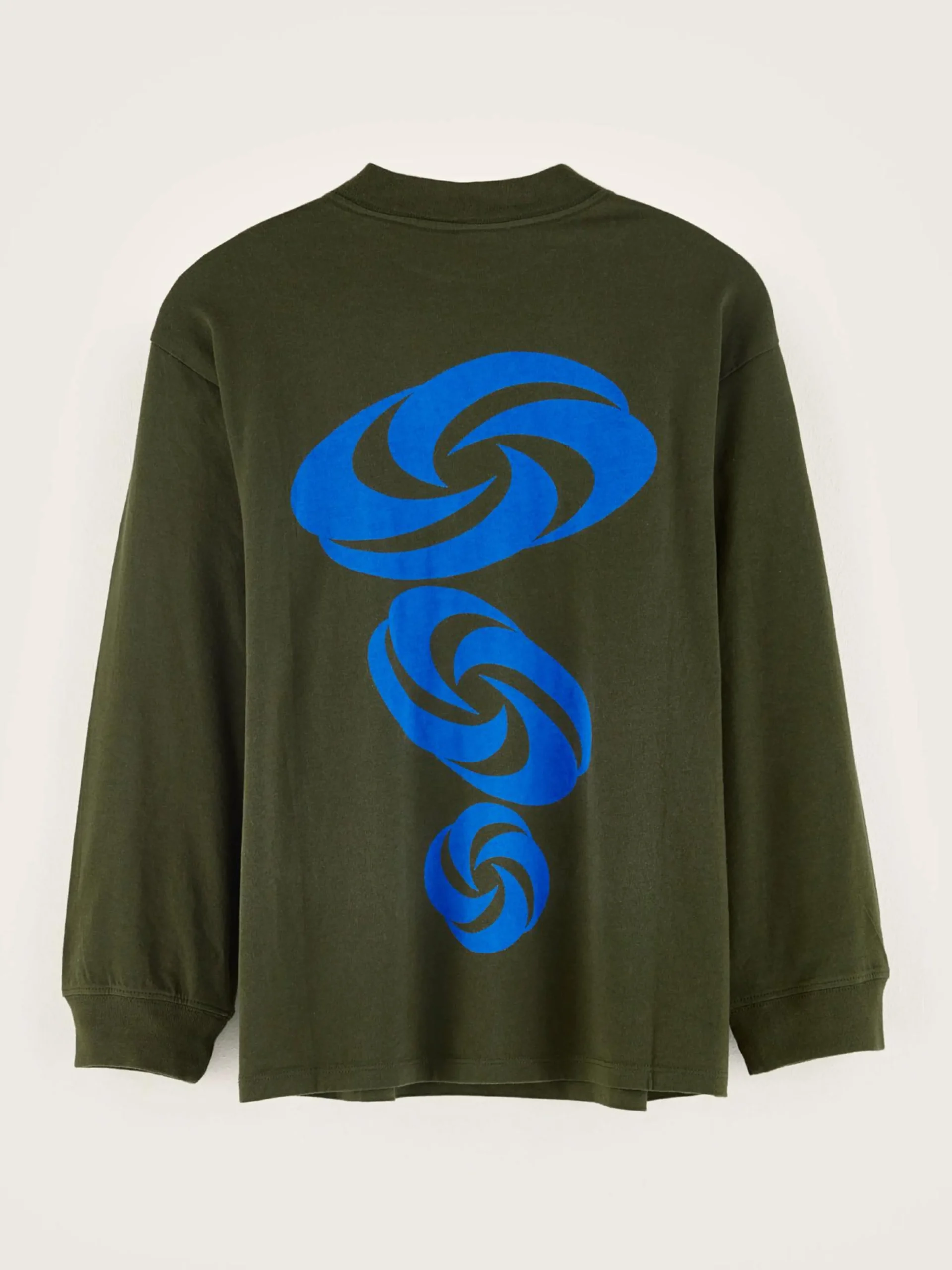 Comfortabel mosgroen T-shirt van geborstelde katoenjersey, met “Twist”-print op de borst.