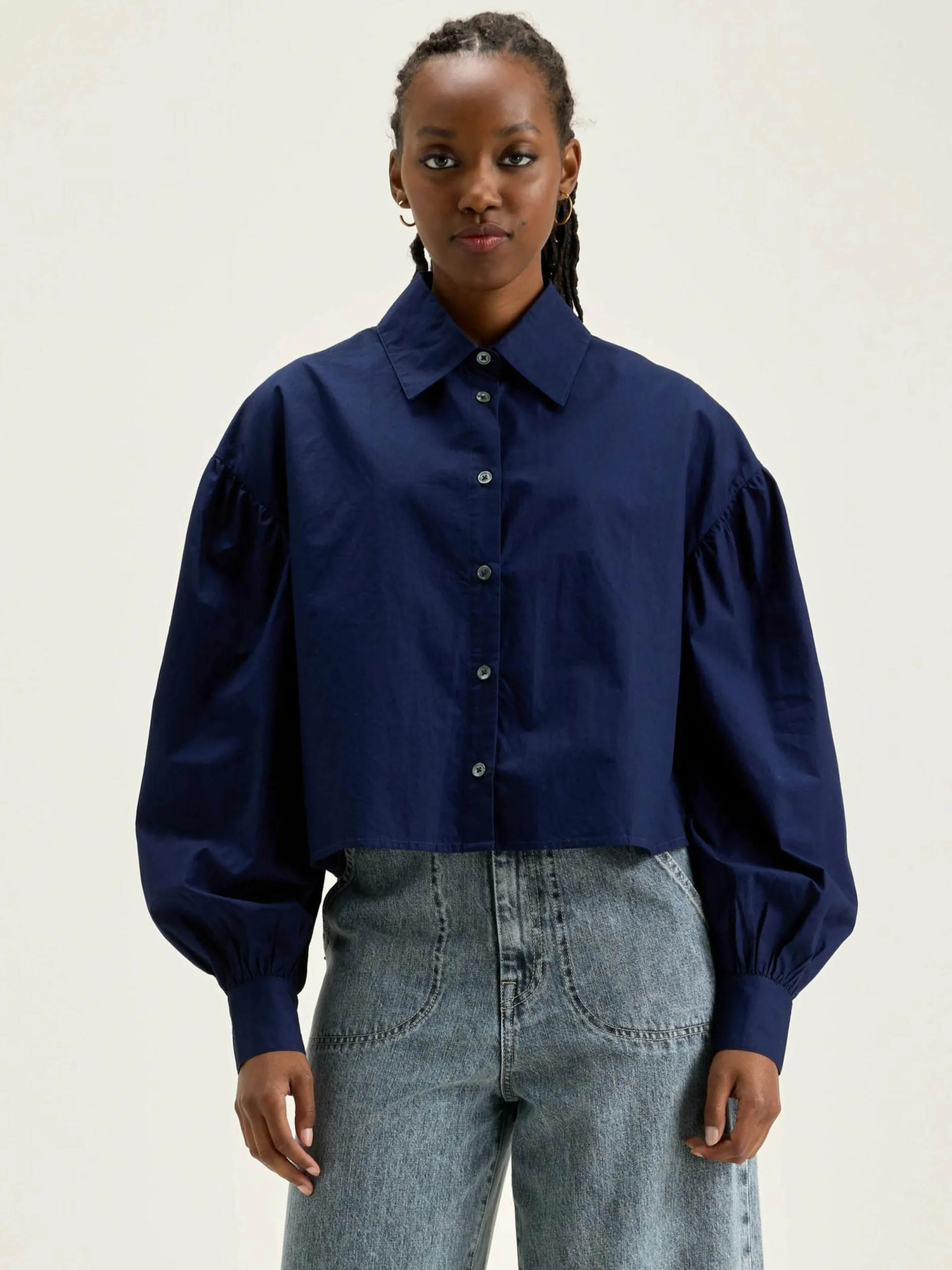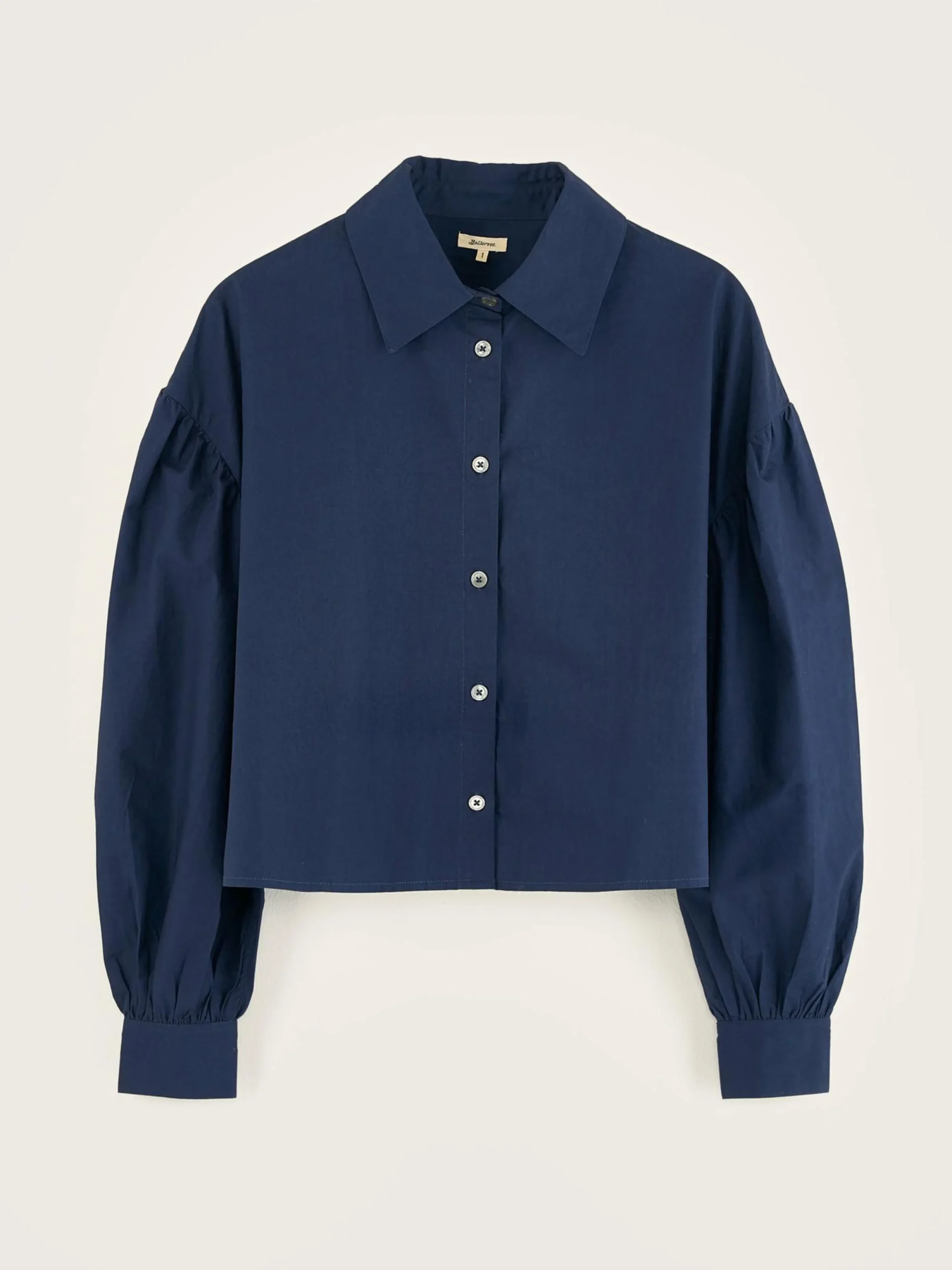 Marineblauw, cropped hemd met grotere kraag en pofmouwen, van katoenpopeline.