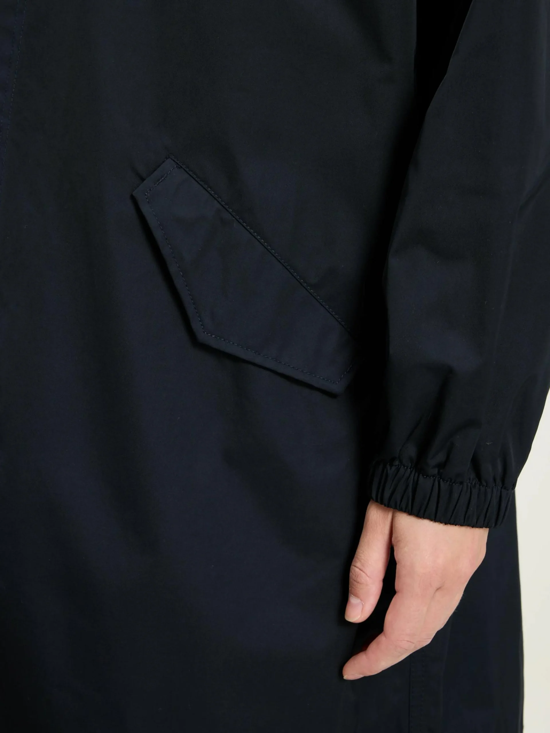 - Contrasterende trekkoorden aan de zoom en capuchon