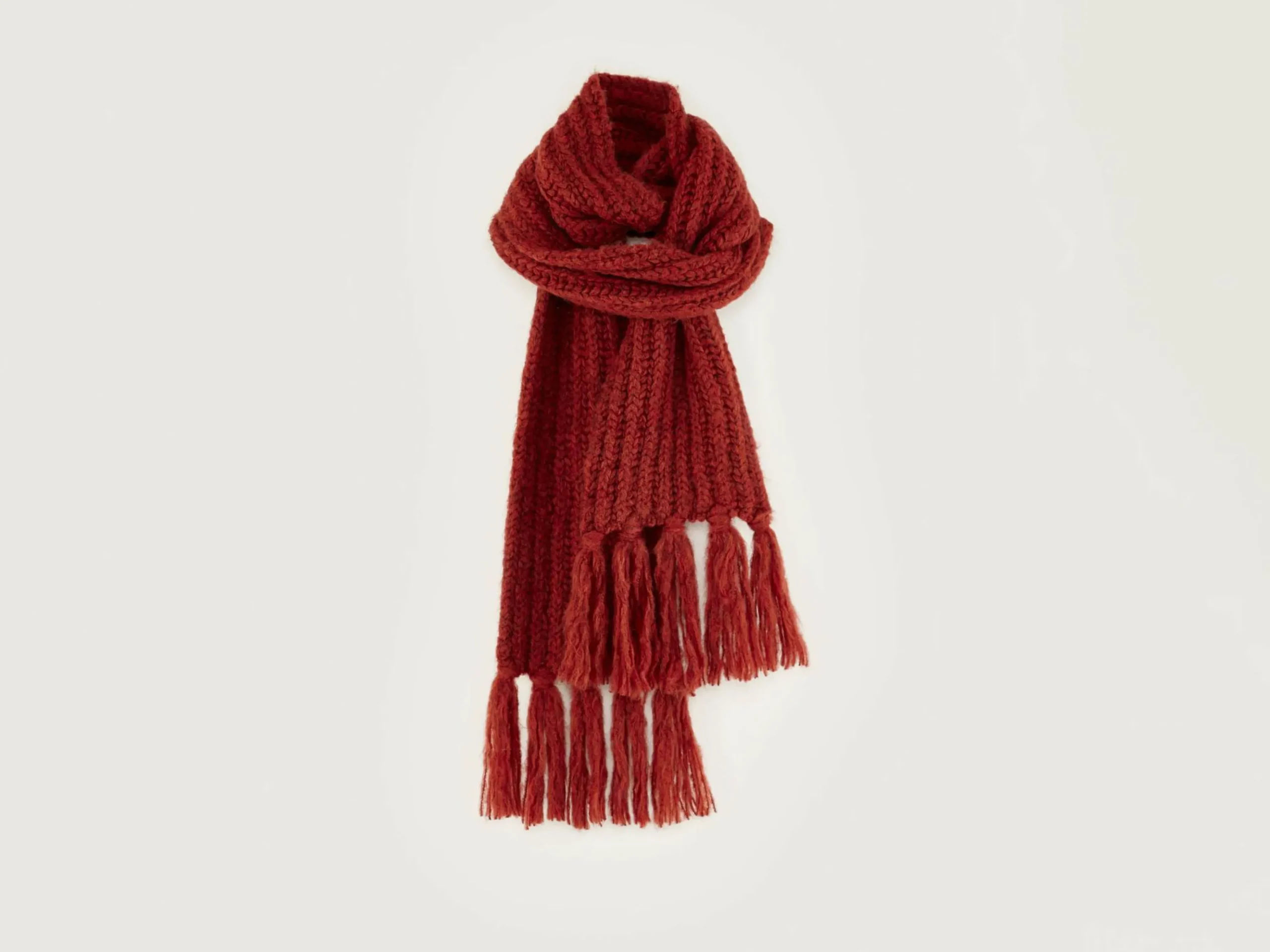 Lange, geribbelde, mahoniebruine sjaal met kwastjes.