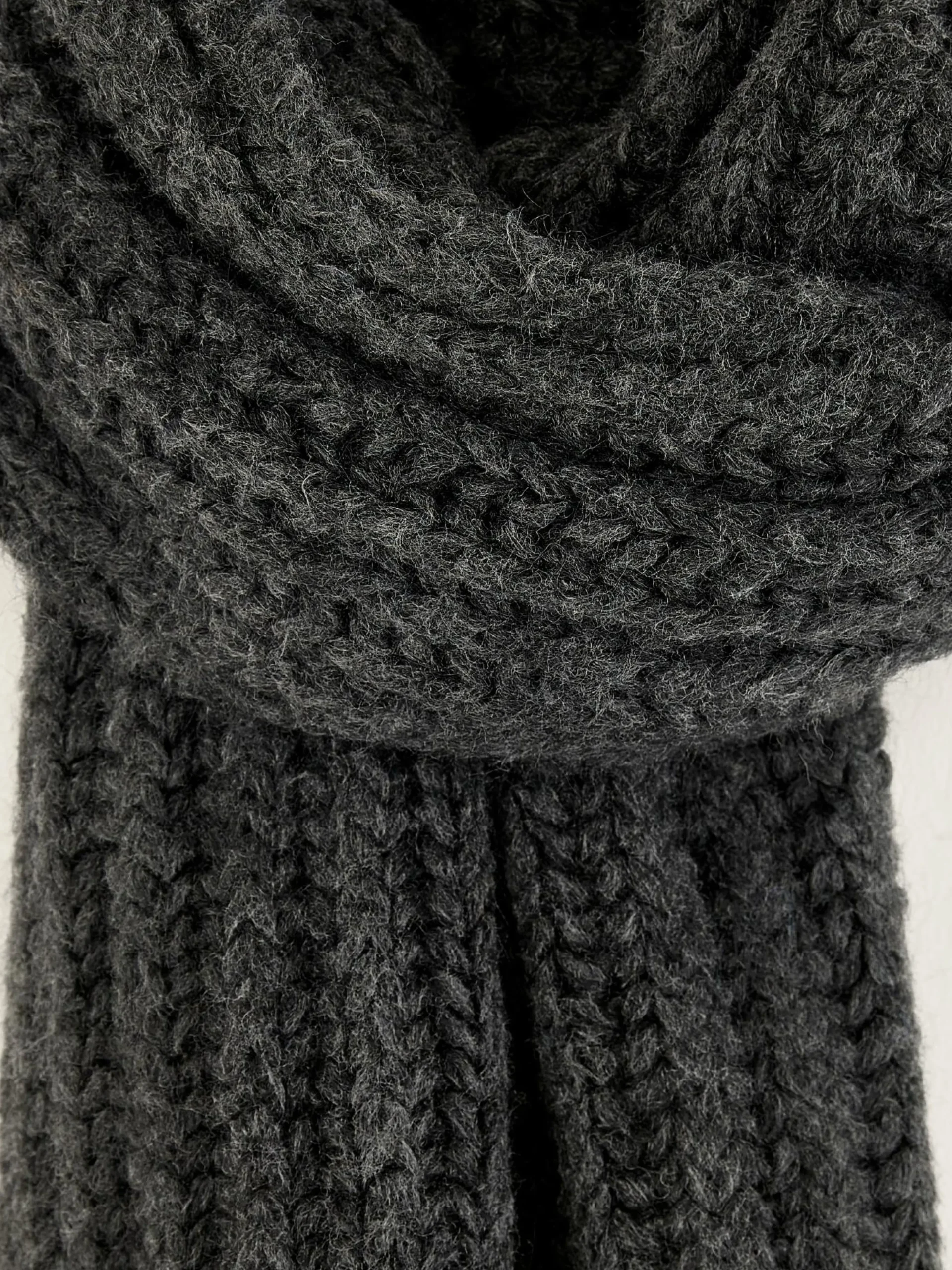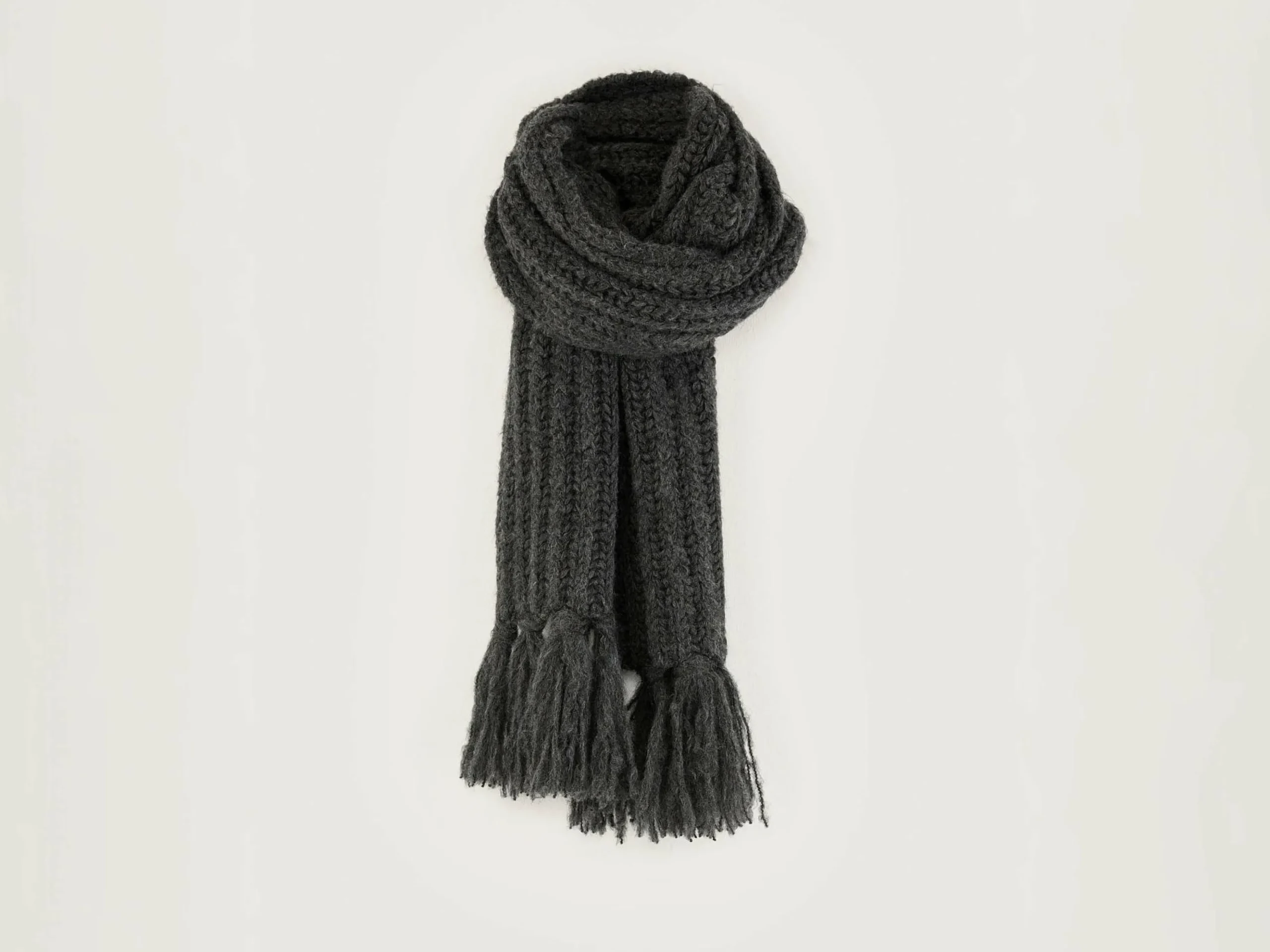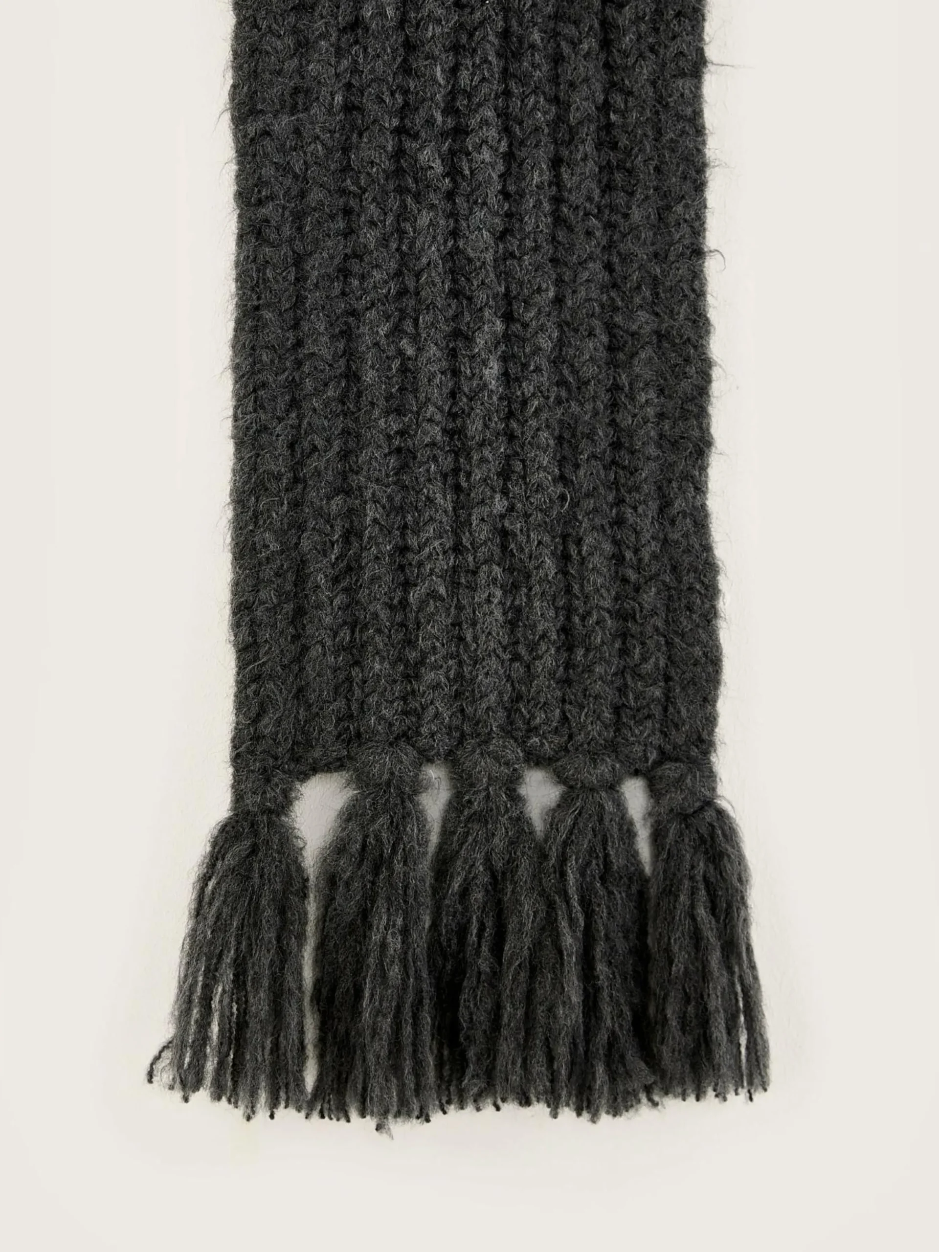 Lange, geribbelde, middengrijze sjaal met kwastjes.