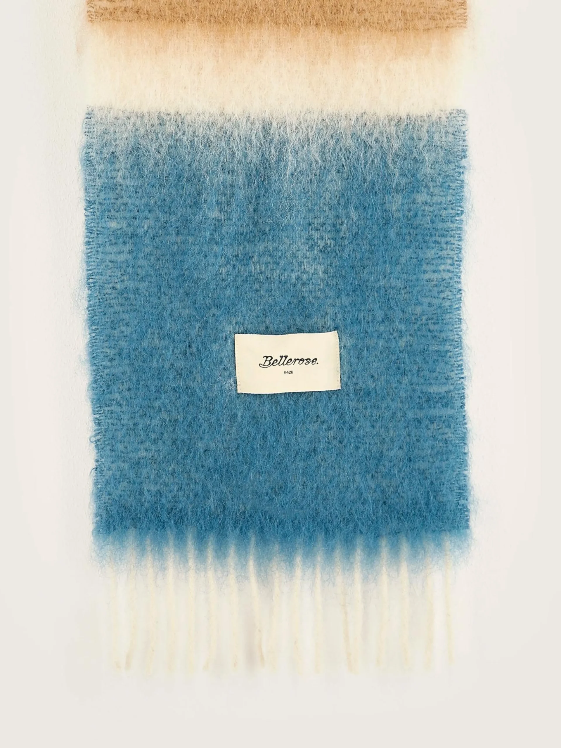 Klassieke geweven sjaal met blauwe, bruine en lichtbeige strepen en franjes aan de randen.