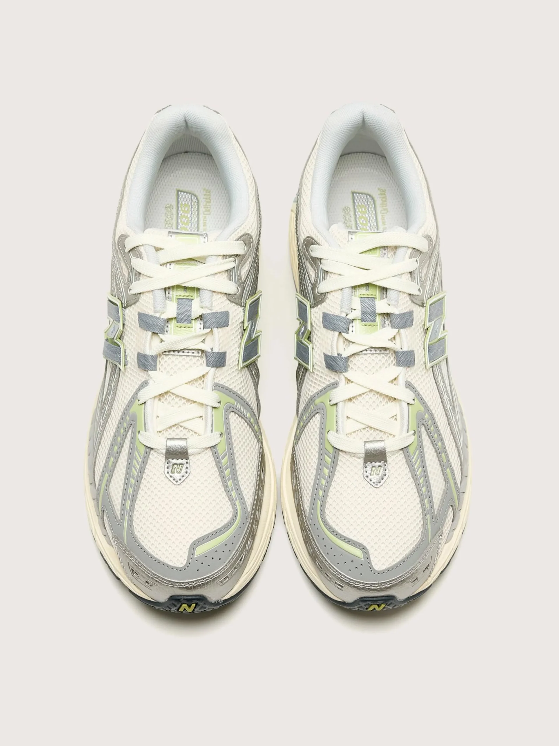 De New Balance 1906R hardloopschoenen hebben een bovenwerk van mesh met synthetische overlays en een gespecialiseerde, dempende middenzool en hiel.