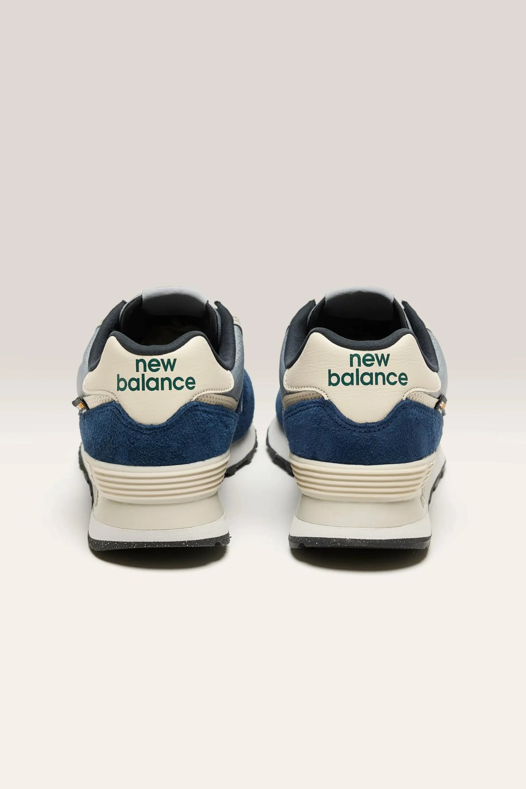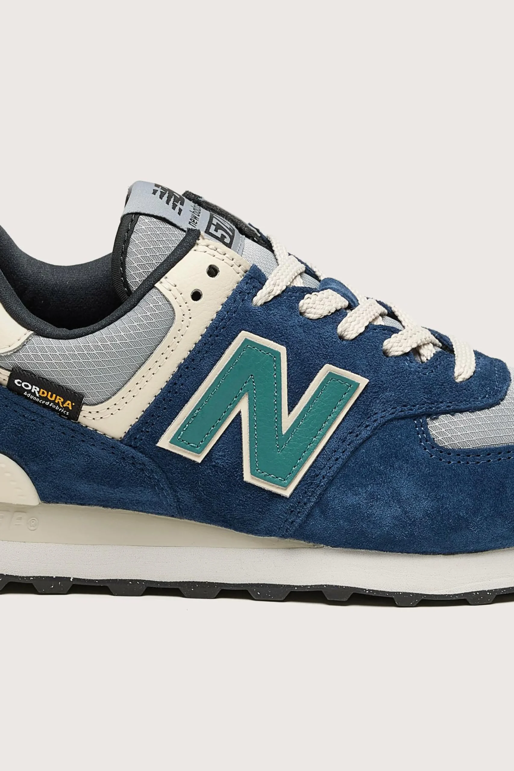 The New Balance 574 lifestyle sneaker features a suede hybrid road/trail design with lightweight EVA cushioning.