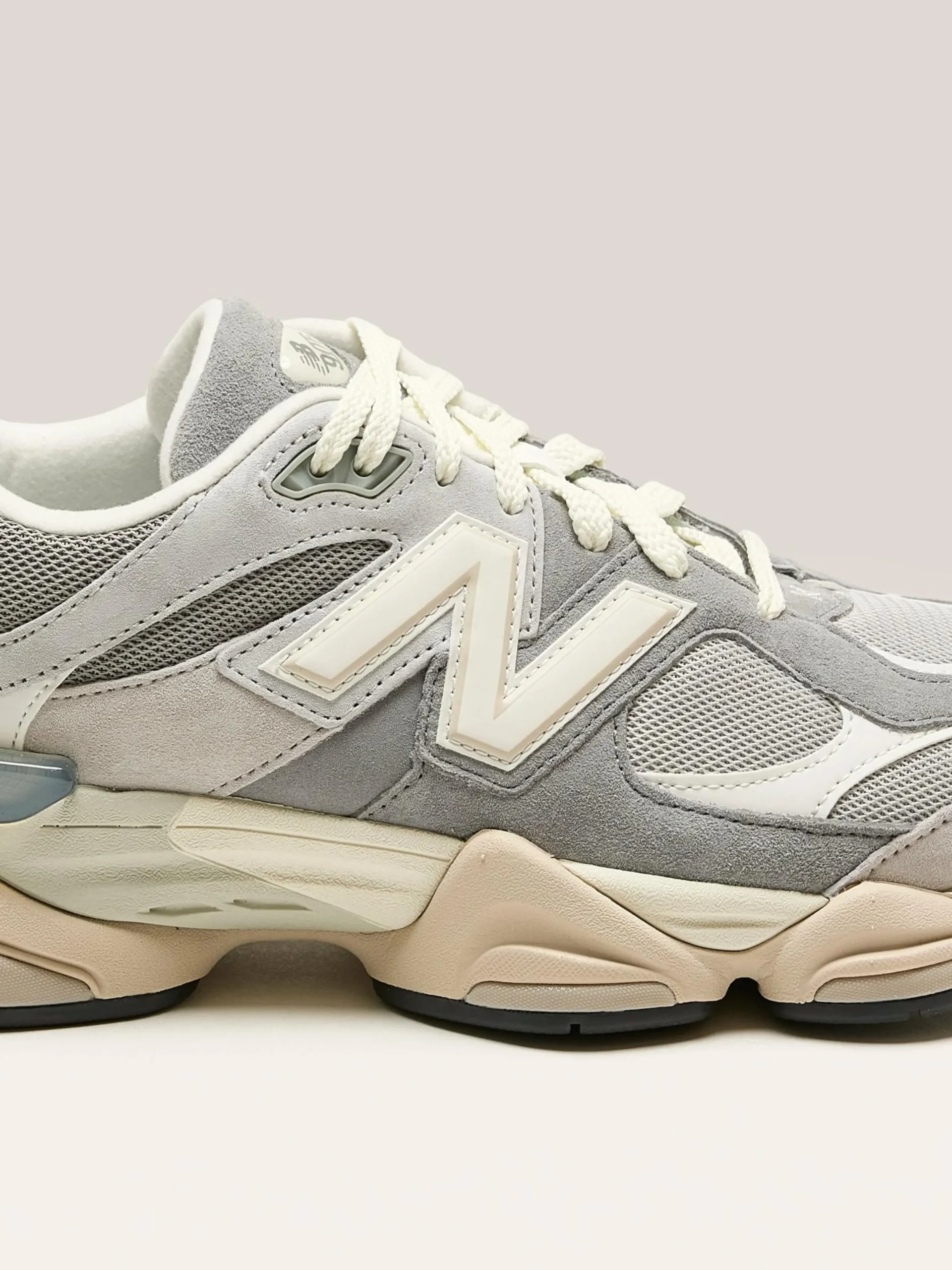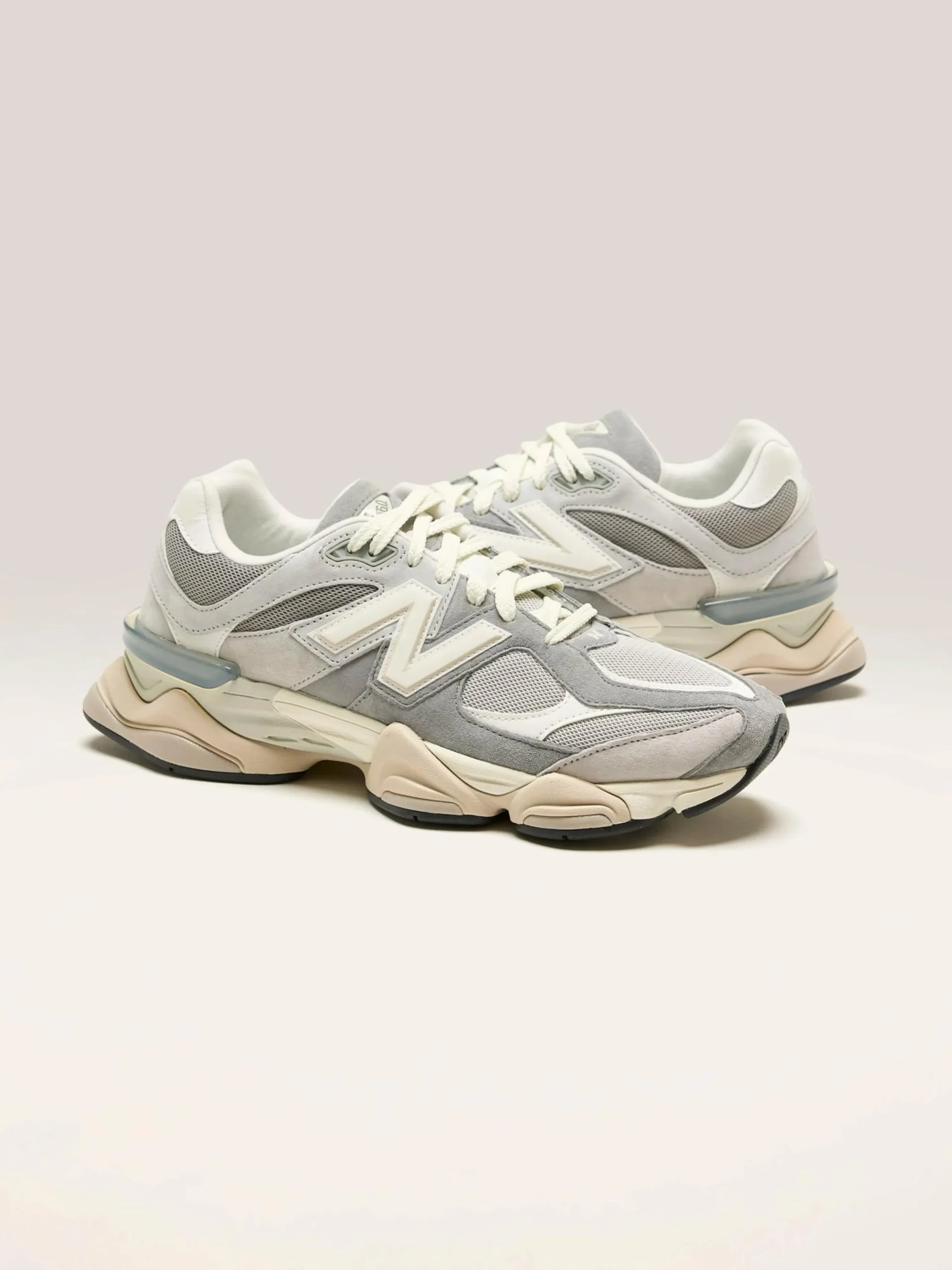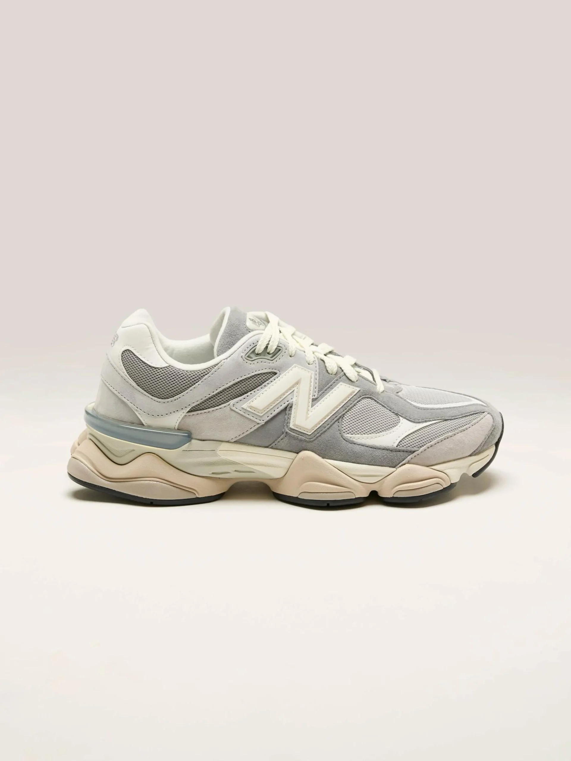 De New Balance 9060 sneakers hebben een technisch bovenwerk van leder, suède en mesh, een dempende middenzool en een buitenzool met een diamanten patroon..