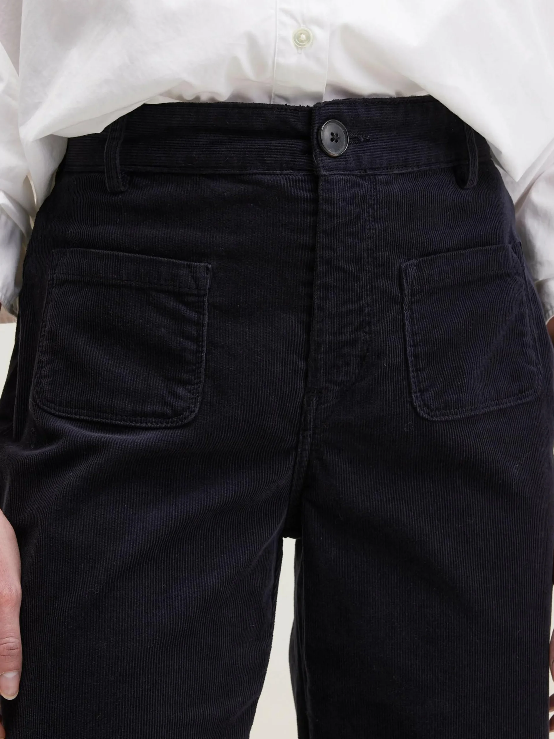 High-waist broek van fijne, zwarte corduroy met flared pijpen.